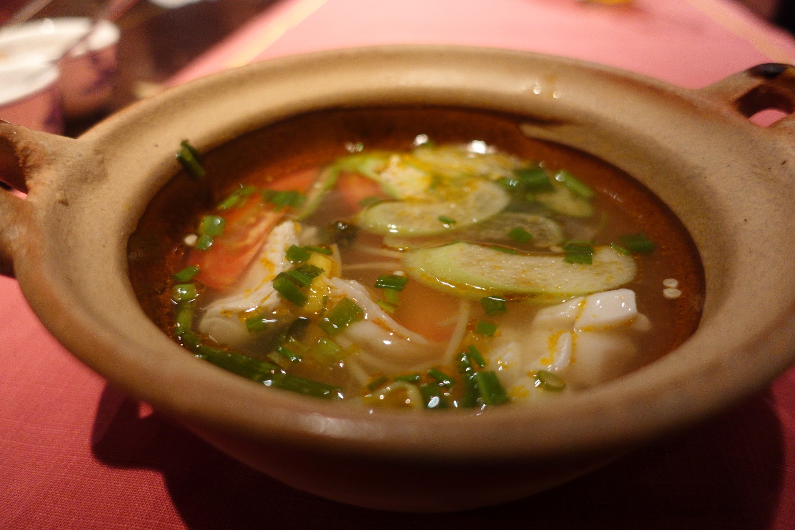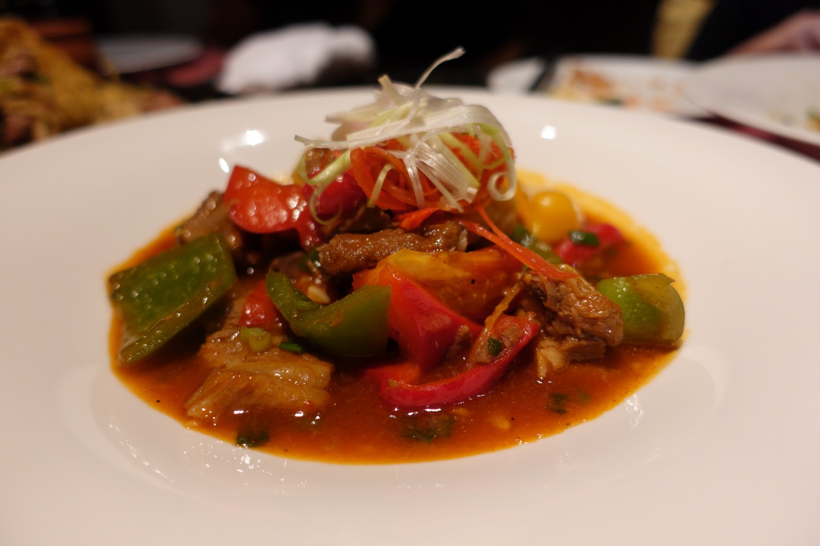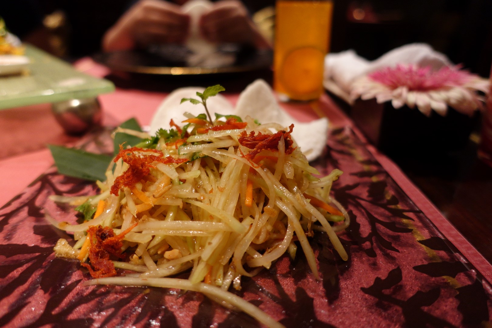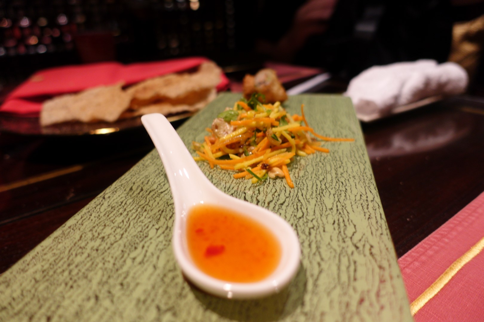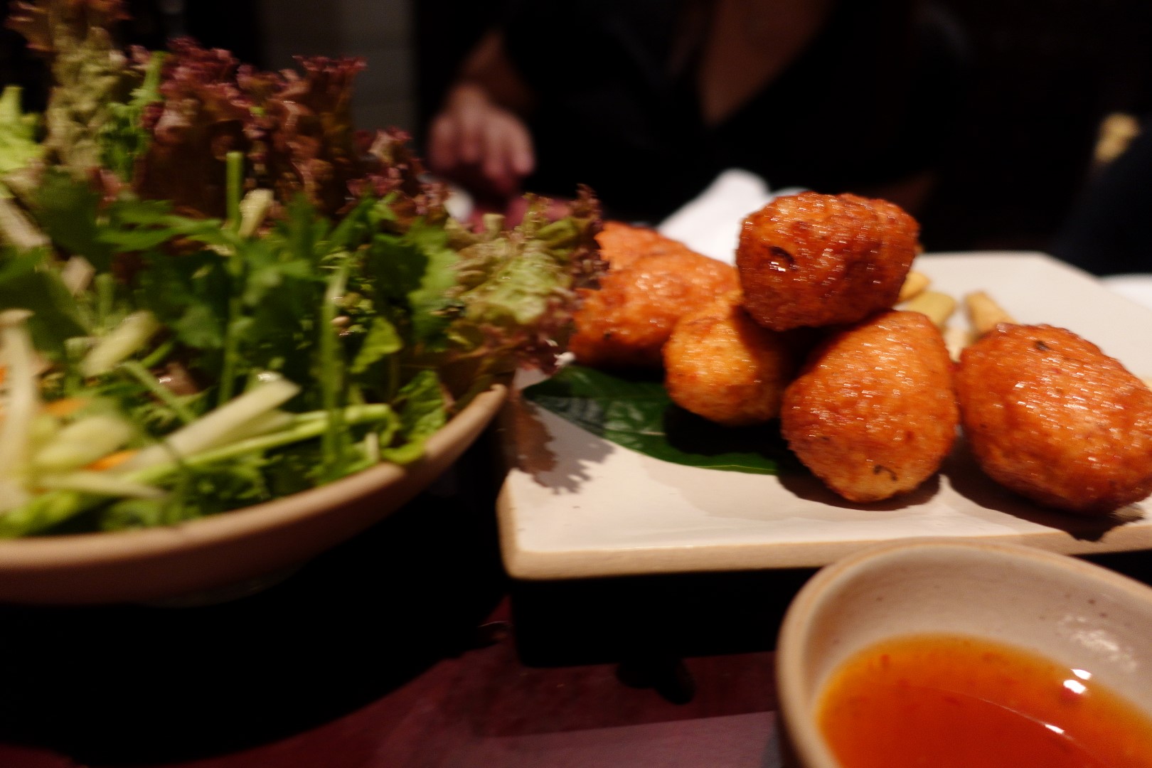 We had some trouble looking for the place at first, but at last we were directed to the correct place and got seated. One thing we noticed right away was the distinct lack of people. Although we expected many tourists, for the majority of the dinner we were only accompanied by one other couple in the whole restaurant. To no worries, we ordered a pre-defined set of food that was on the menu to get a sampler of the Vietnamese cuisine. This was accompanied with some fried egg noodles for Ashley, as we were not sure that she would enjoy the food particularly well. We had a treat of Prawn Cakes with Sugar Cane, Seafood soup and some chicken.
