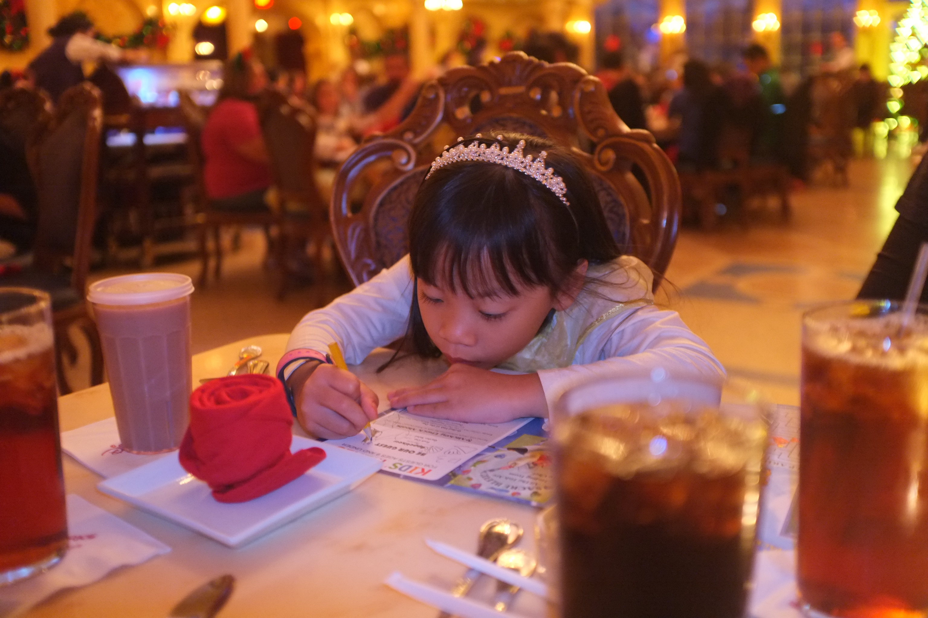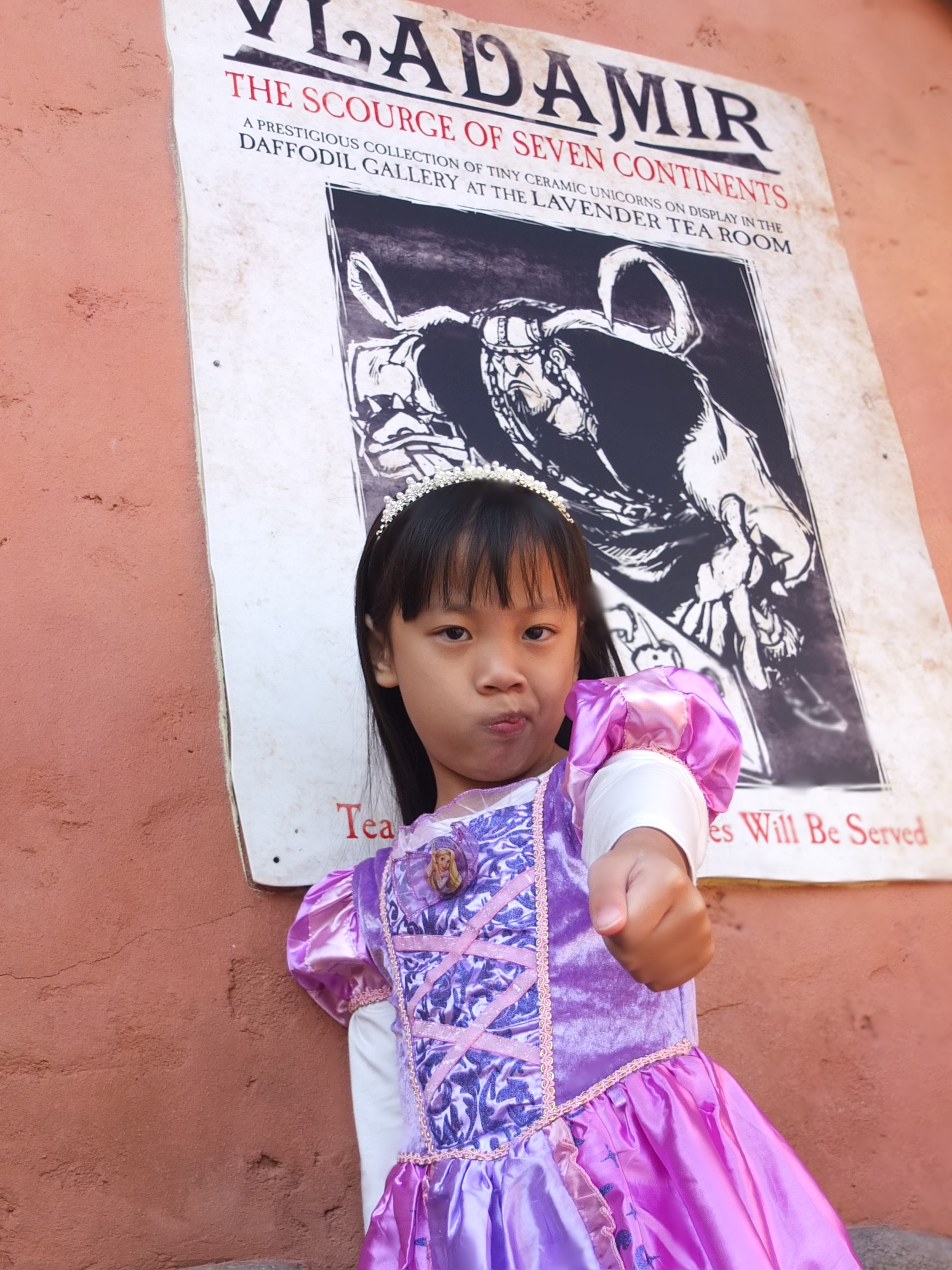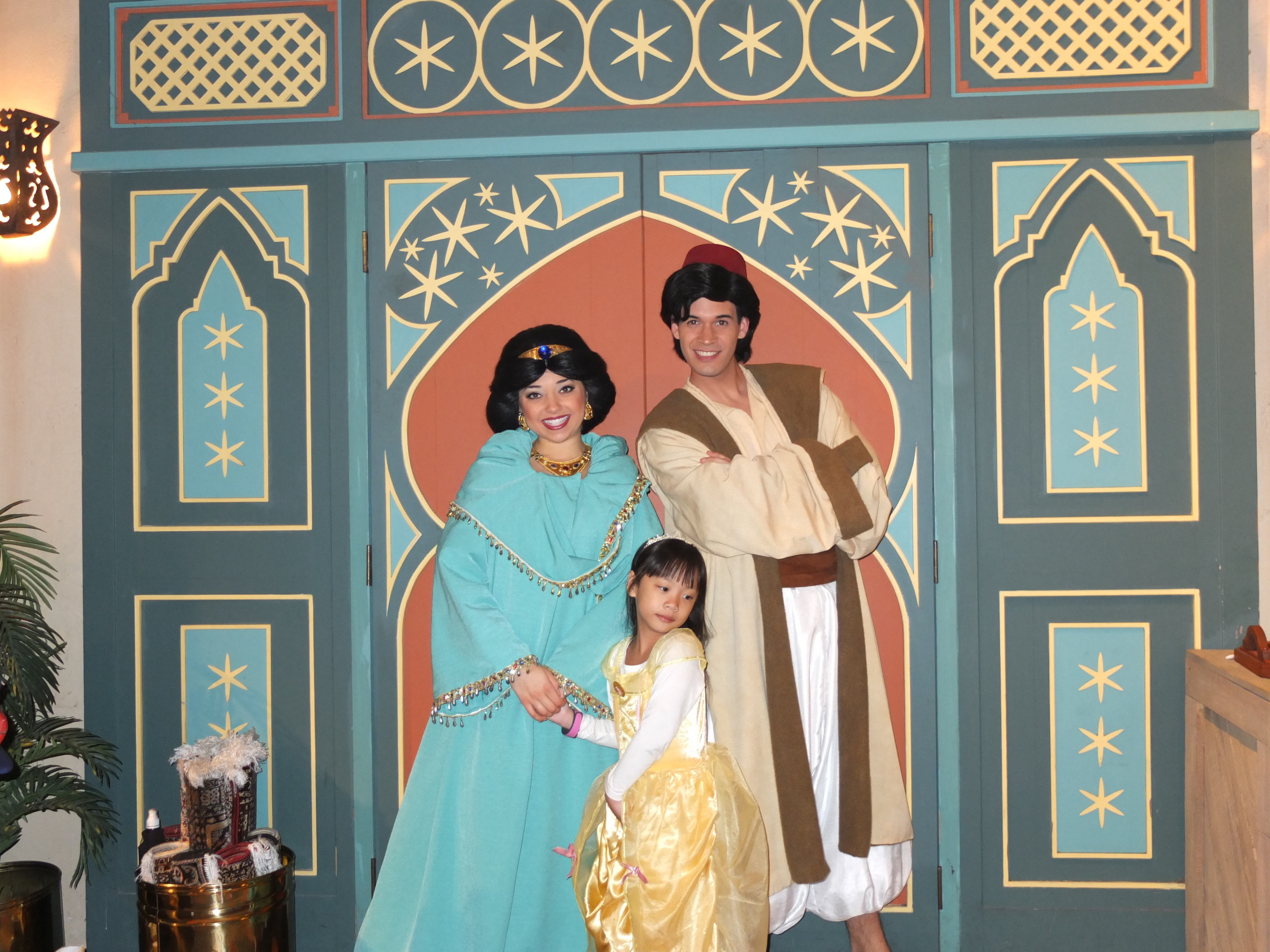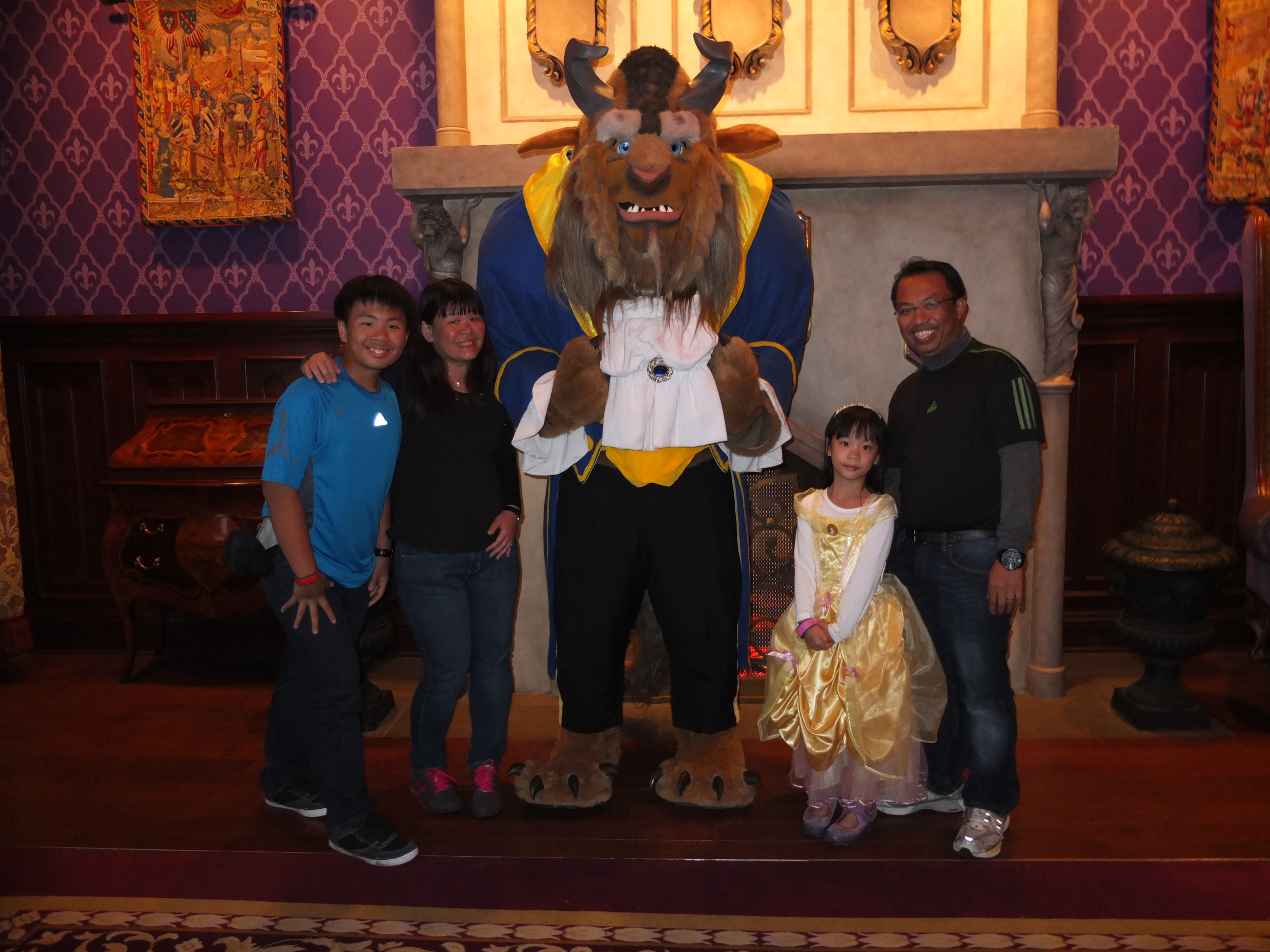 Ashley seemed to feel uncomfortable in this restaurant setting. Perhaps Disney had been too successful in re-creating the scenes from Beauty and the Beast that like Belle, Ashley was afraid of The Beast. We had to coax her to have a photo taken with The Beast as the only exit from the restaurant was through the Beast’s study. As she was dressed up as Belle, The Beast bowed to her and kissed her hand. She felt more at ease after this. I liked that the characters at Walt Disney World really took the time to interact with us, unlike Disneyland Hong Kong. No comments about Disneyland Anaheim as Jarod would never want to do a meet and greet.