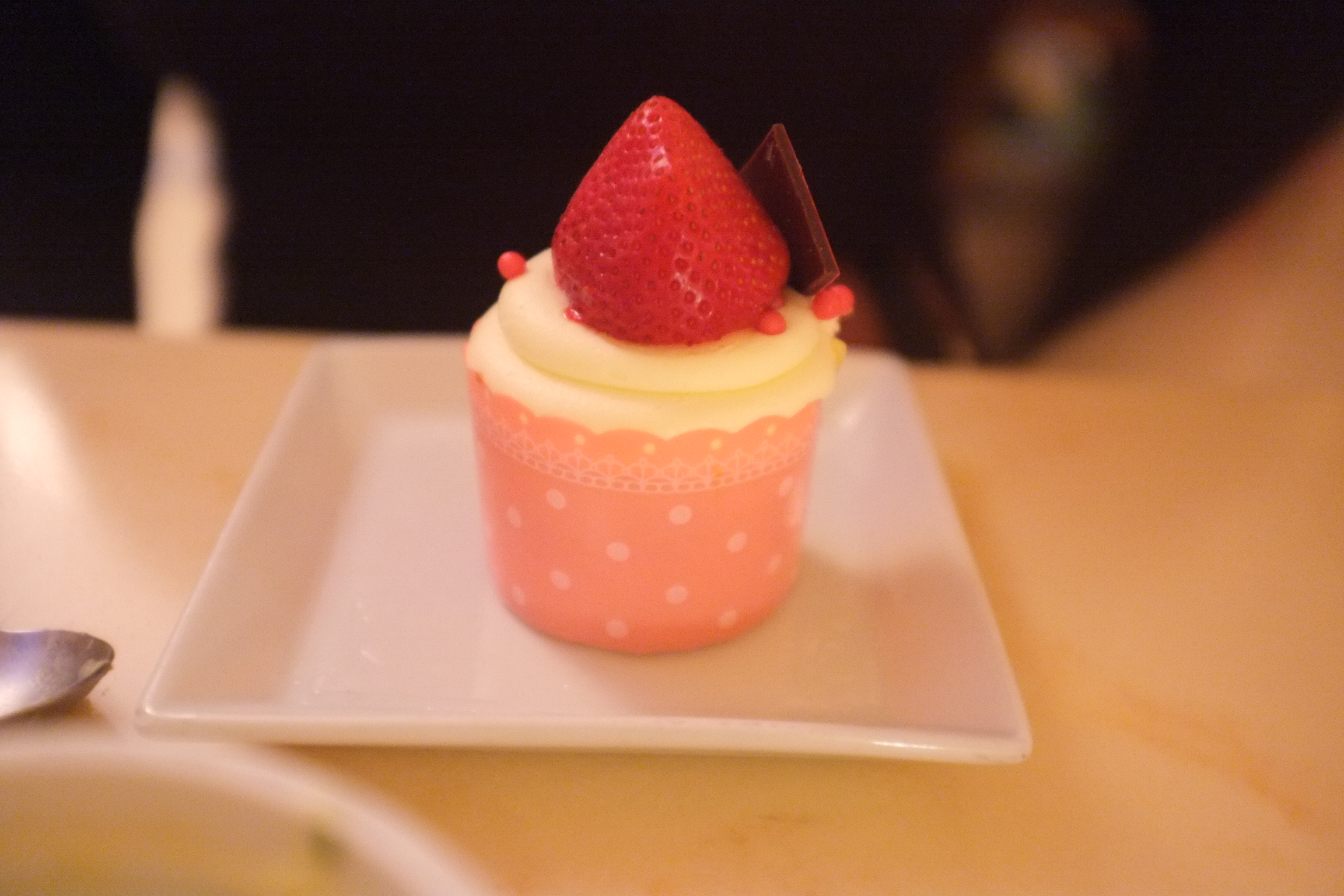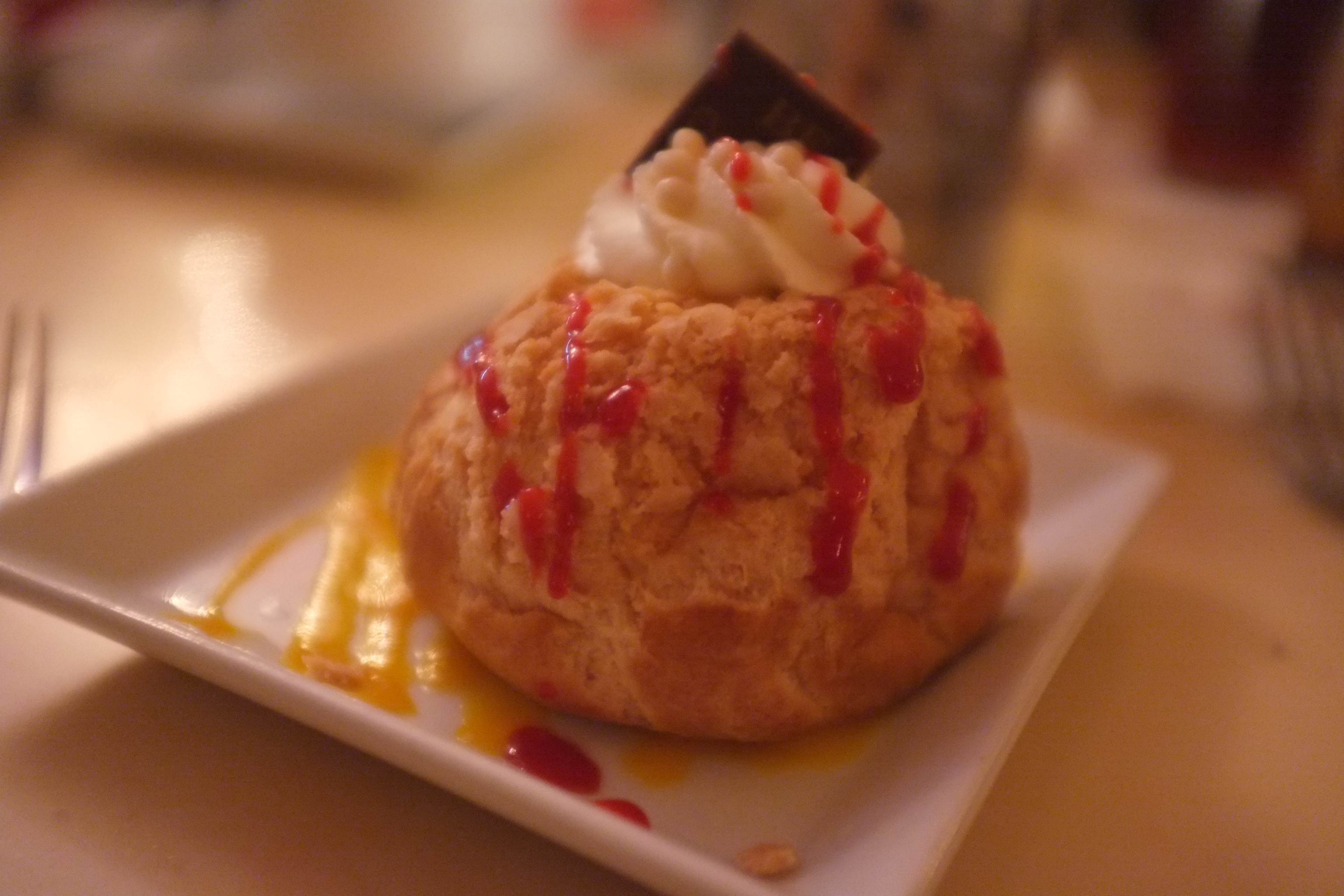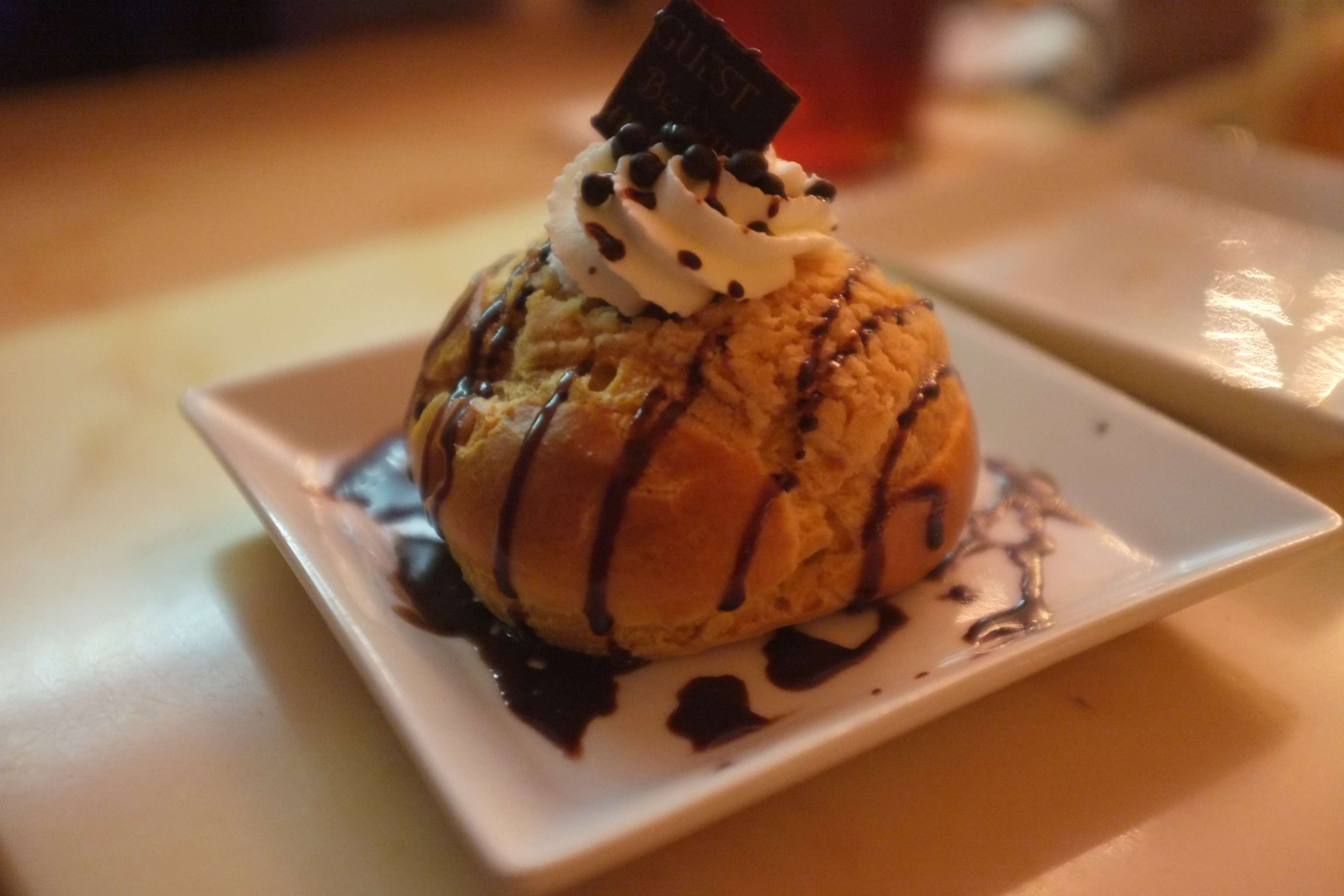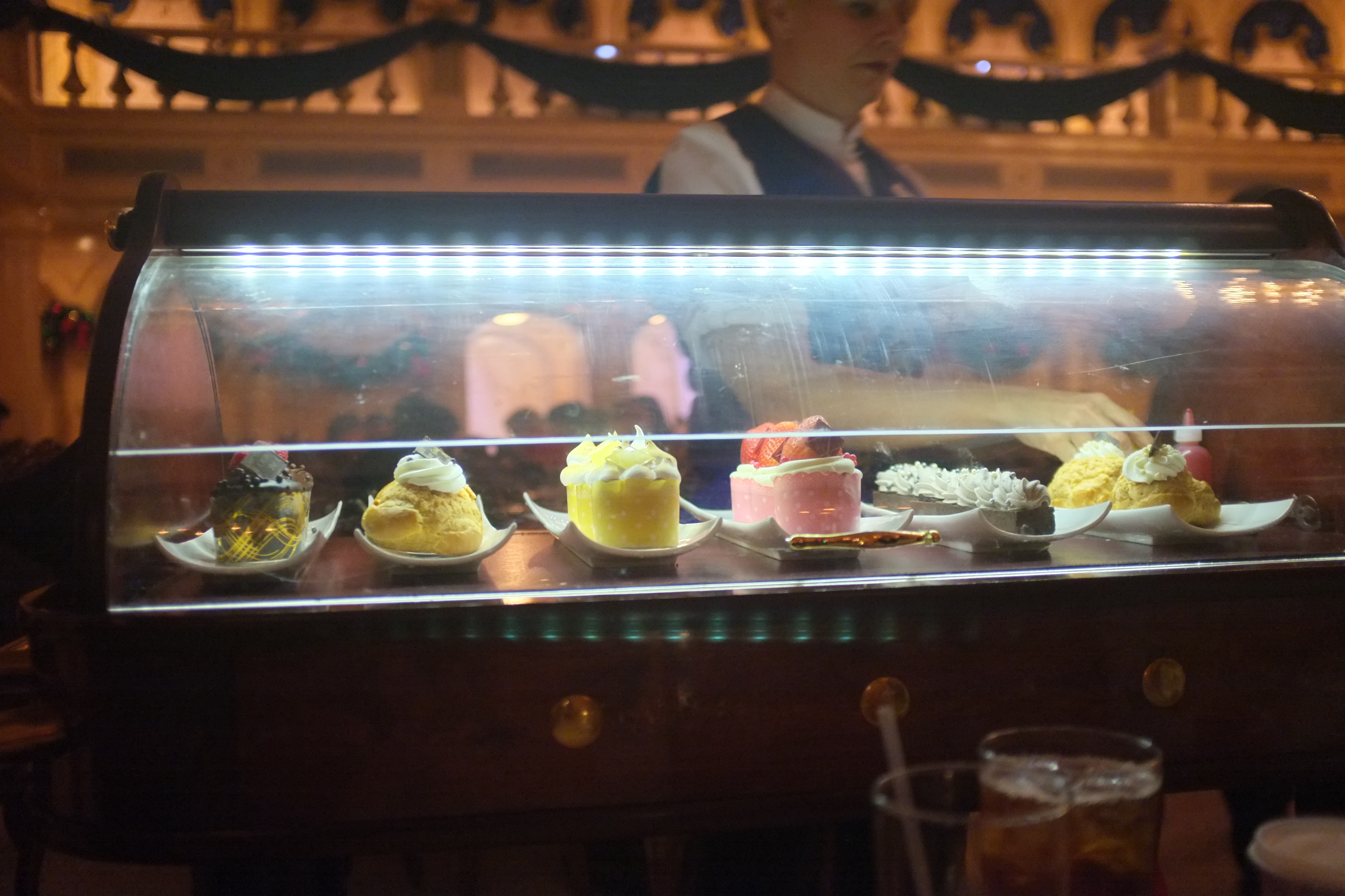 Jarod missed the Potato Leek Soup so much he had to have it. So we ordered 2 to share. Ashley ordered Grilled Fish Of The Day while the rest of us ordered Grilled Strip Steak.Every hourly, The Beast would appear as he walked and waved to diners before proceeding to his study to meet the guests. Ashley did not like her Mahi Mahi but we enjoyed the steak. They were better than the ones we had at Mama Melrose’s. Desserts are served table side from a French style lit dining cart that rolls around the restaurant with decadent puff pastries and cupcakes. Ashley picked The Grey Stuff, Jarod had Chocolate Puff, ZA has the Tropical Fruits Puff while the boring me picked Strawberry Cheese Cupcake.