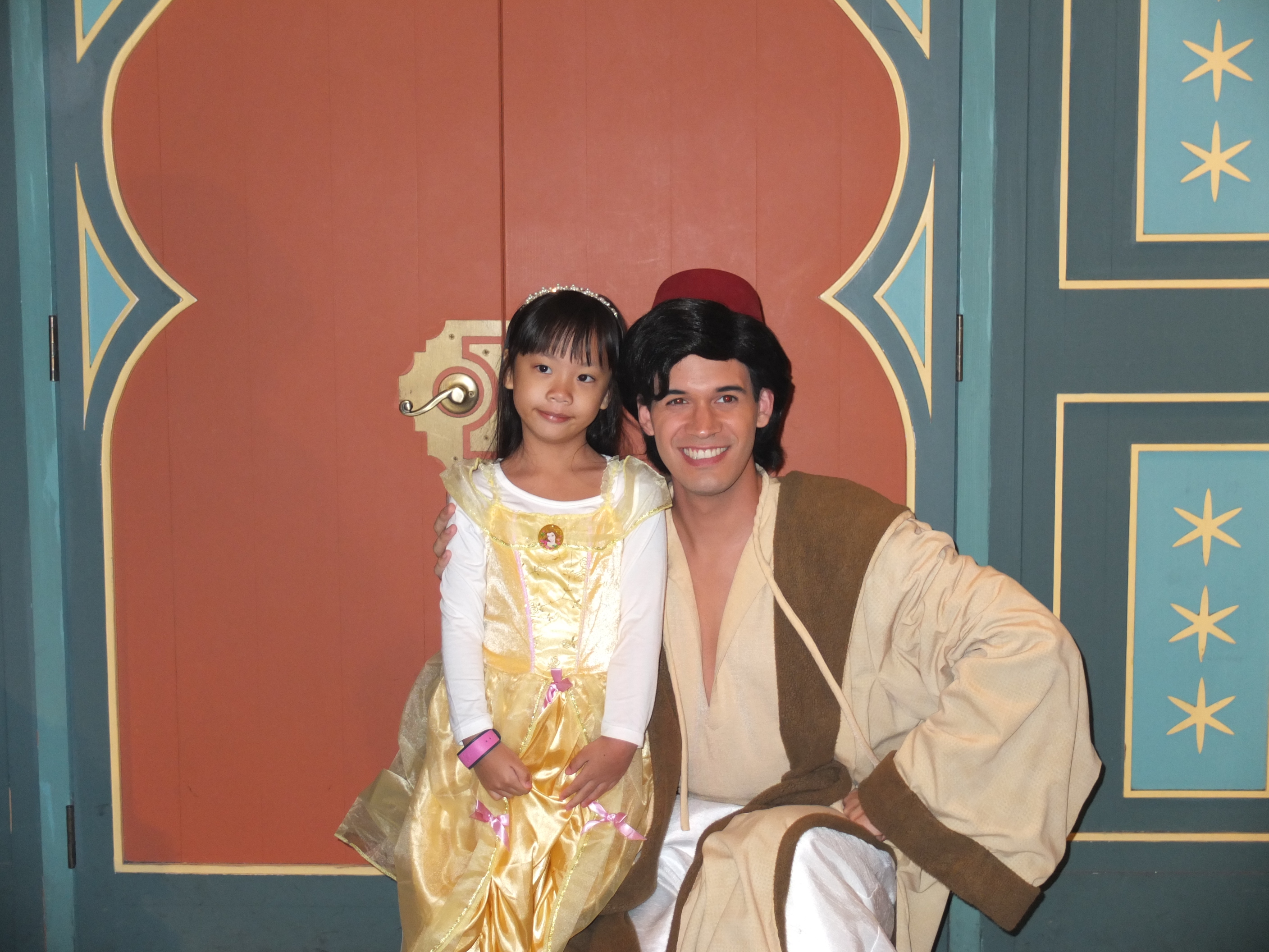 We walked back towards Liberty Square and got a Funnel Cake dusted with cinnamon using our snack credit. (ZA : Best snack so far….I will miss this). This was our first time trying it and it was delicious! Jarod had very much wanted to get a coffee from Starbucks at Main Street but had to wait as Ashley wanted to do more character meeting. This time, she met with Aladdin and Jasmine. She was thrilled when Aladdin took her hand and danced with her. We took photos of her with them together as well as Aladdin alone.