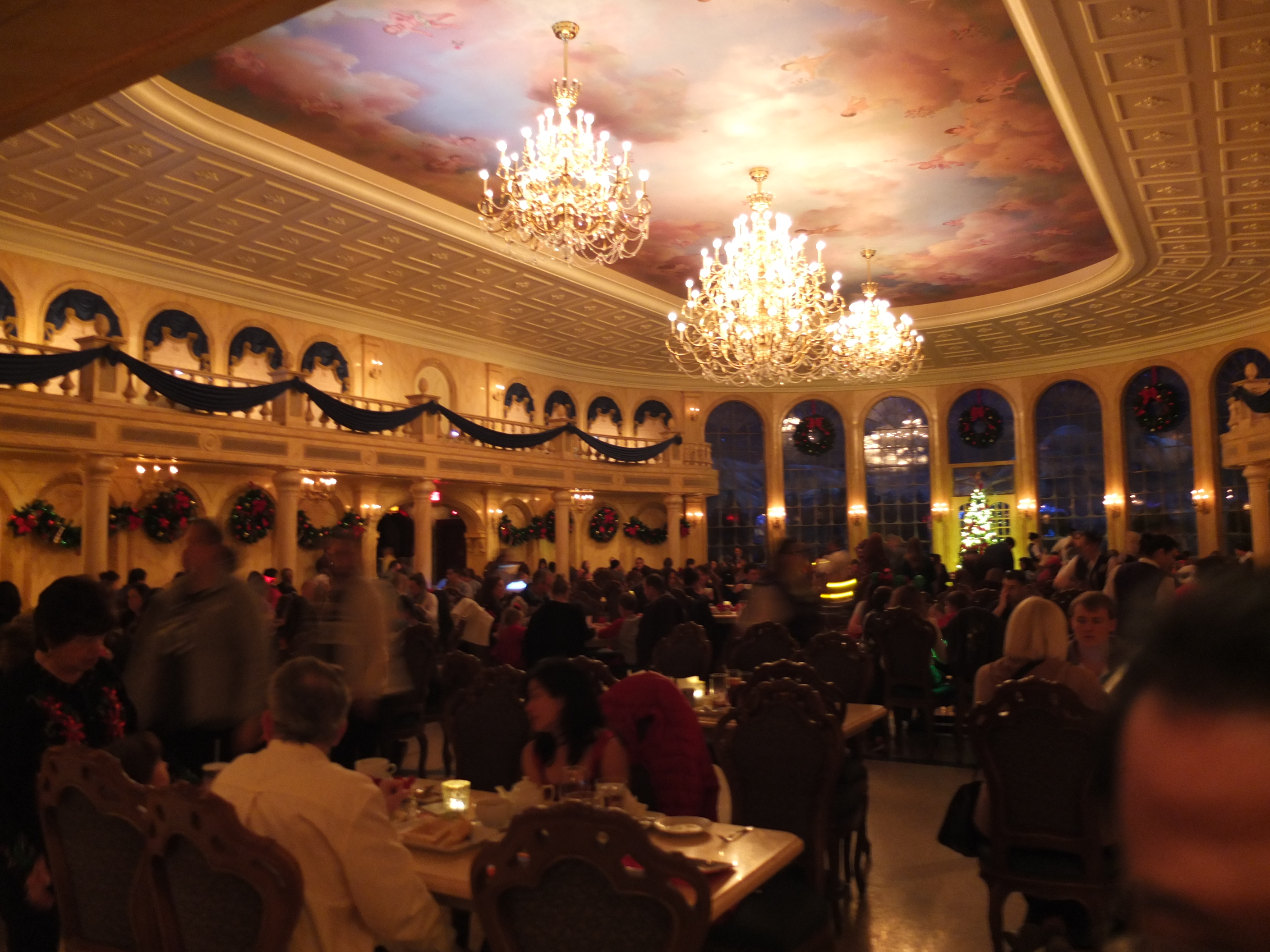 We checked in at the podium and requested that we do not sit at the West Wing as Ashley found it eerie. We were informed that they were running 15 minutes behind. However, it was not long before our buzzer lighted and were ushered into the Ballroom. Attention is paid in great, breath-taking detail here at the Be Our Guest restaurant. From the gorgeous chandeliers, grand columns, “in character” wait staff who call Beast their “master”, down to the very digital pixels used from the film for the snowflakes falling in the window scenes. Such detail truly makes it an awe-inspiring and breathtaking magical experience as if you are transported into the world of Beauty and the Beast.