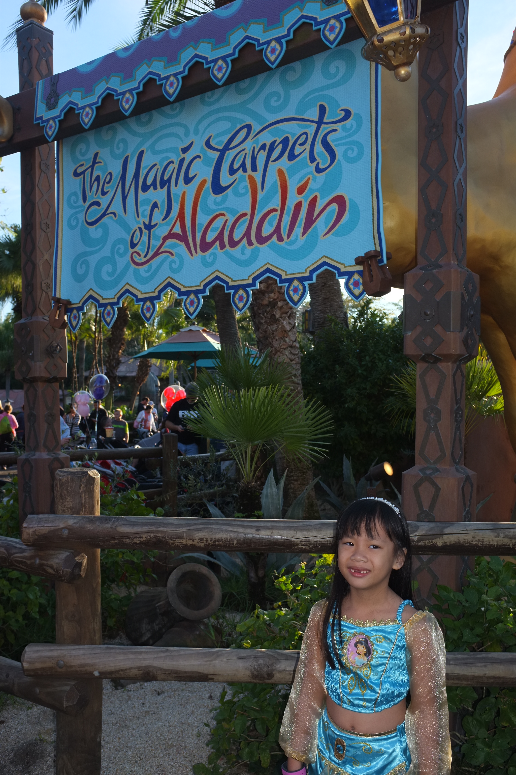 Next on our list was Pirates of the Carribbean took us on a voyage when pirates ruled the seas. Then we rode The Magic Carpets of Aladdin, which took us above Adventureland on the magic carpet. This is similar to Dumbo but you get to control the height of the magic carpet you were in. As we stepped out of the ride, we entered Agrabah. Ashley saw a musical Aladdin and Jasmine and wanted it very badly. We did not buy it as it was fragile and highly likely that it would be broken. She broke into tears but accepted the fact.