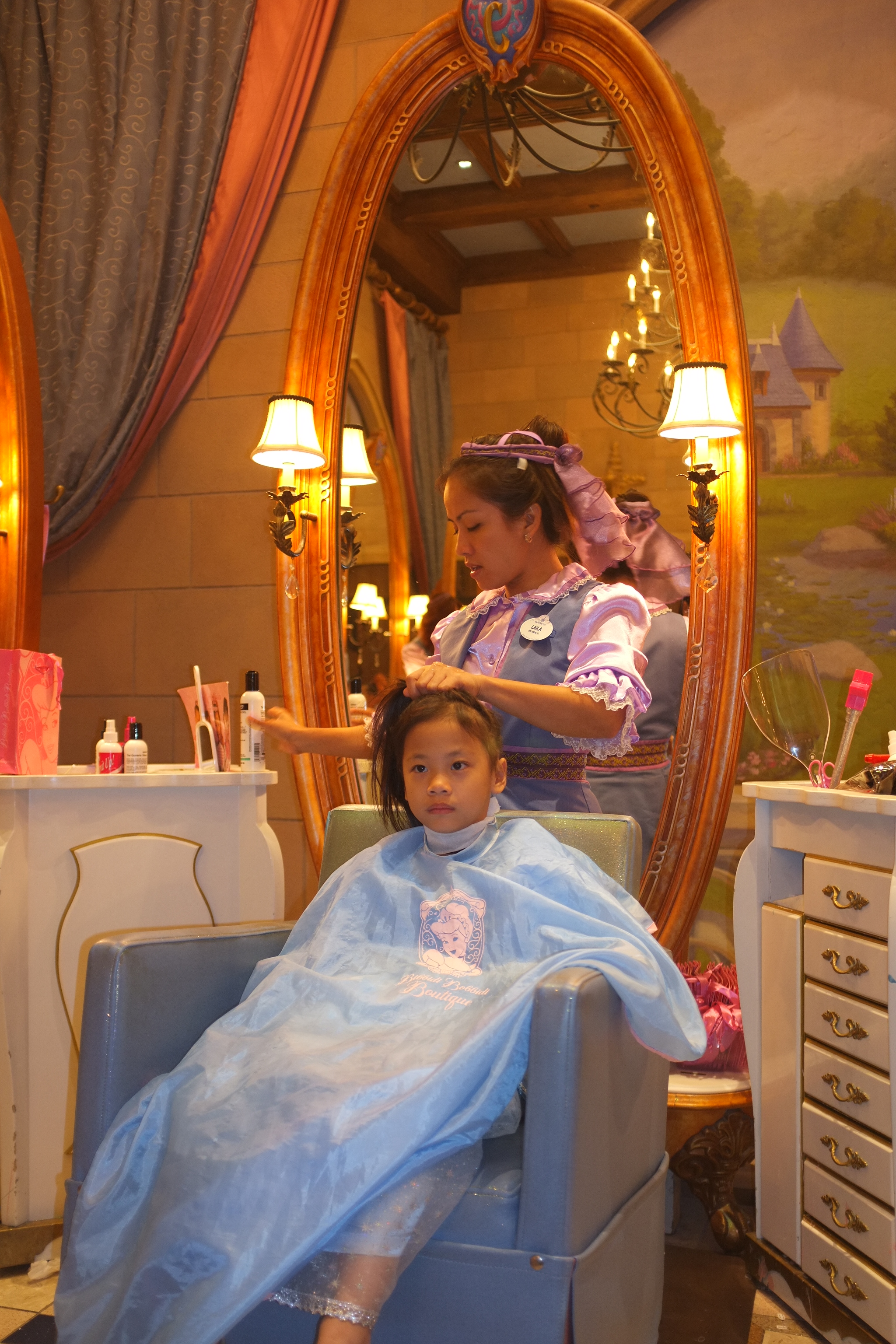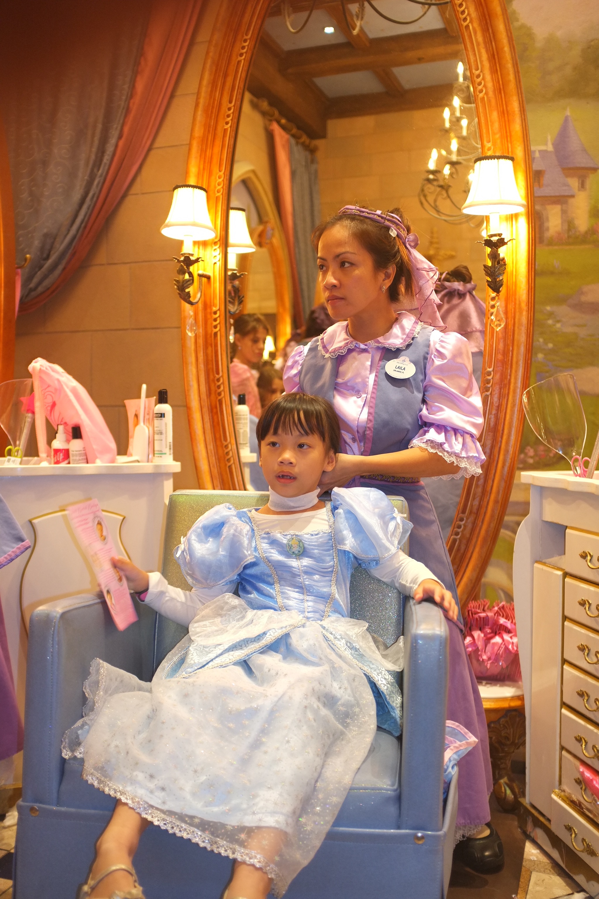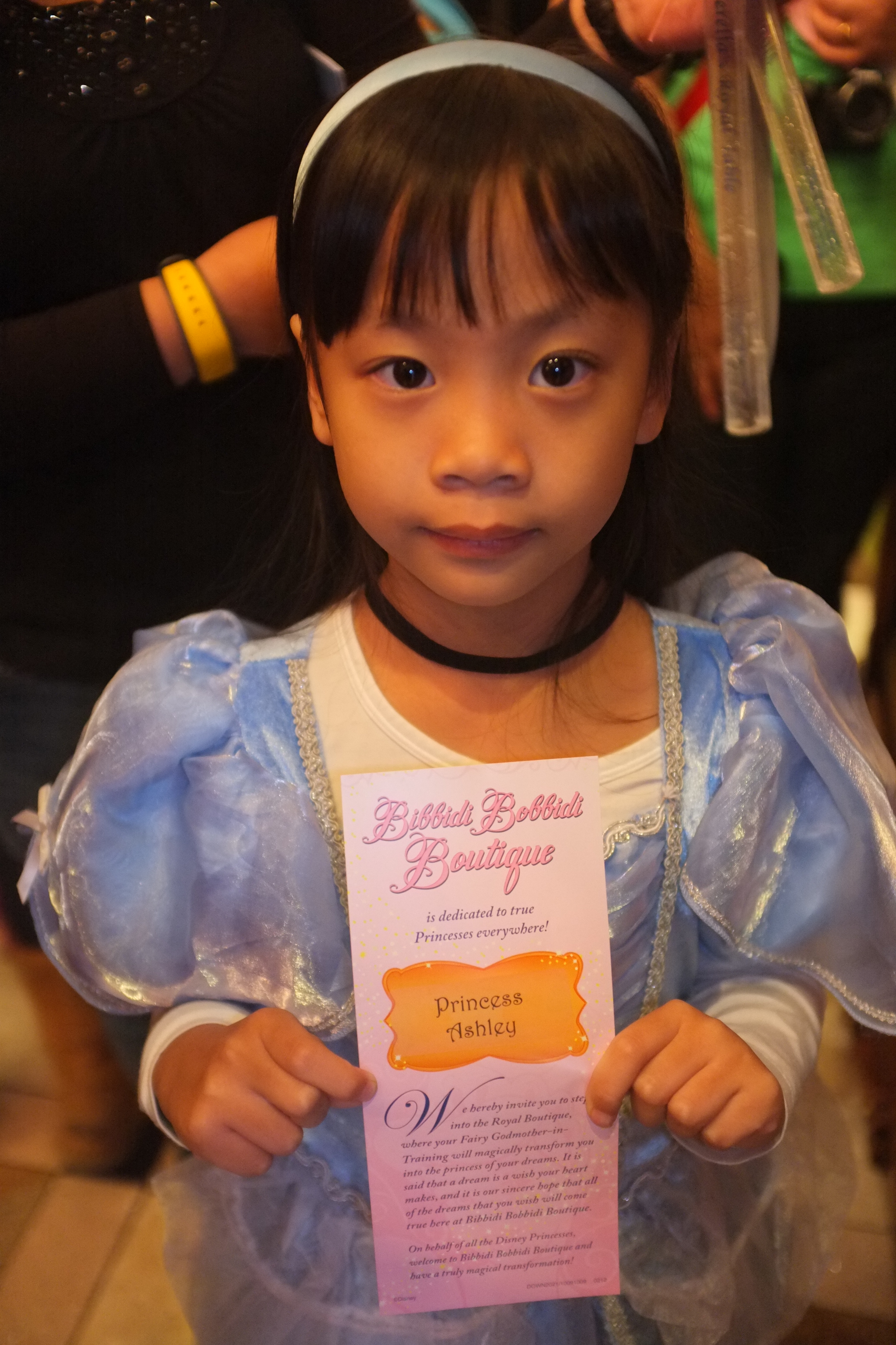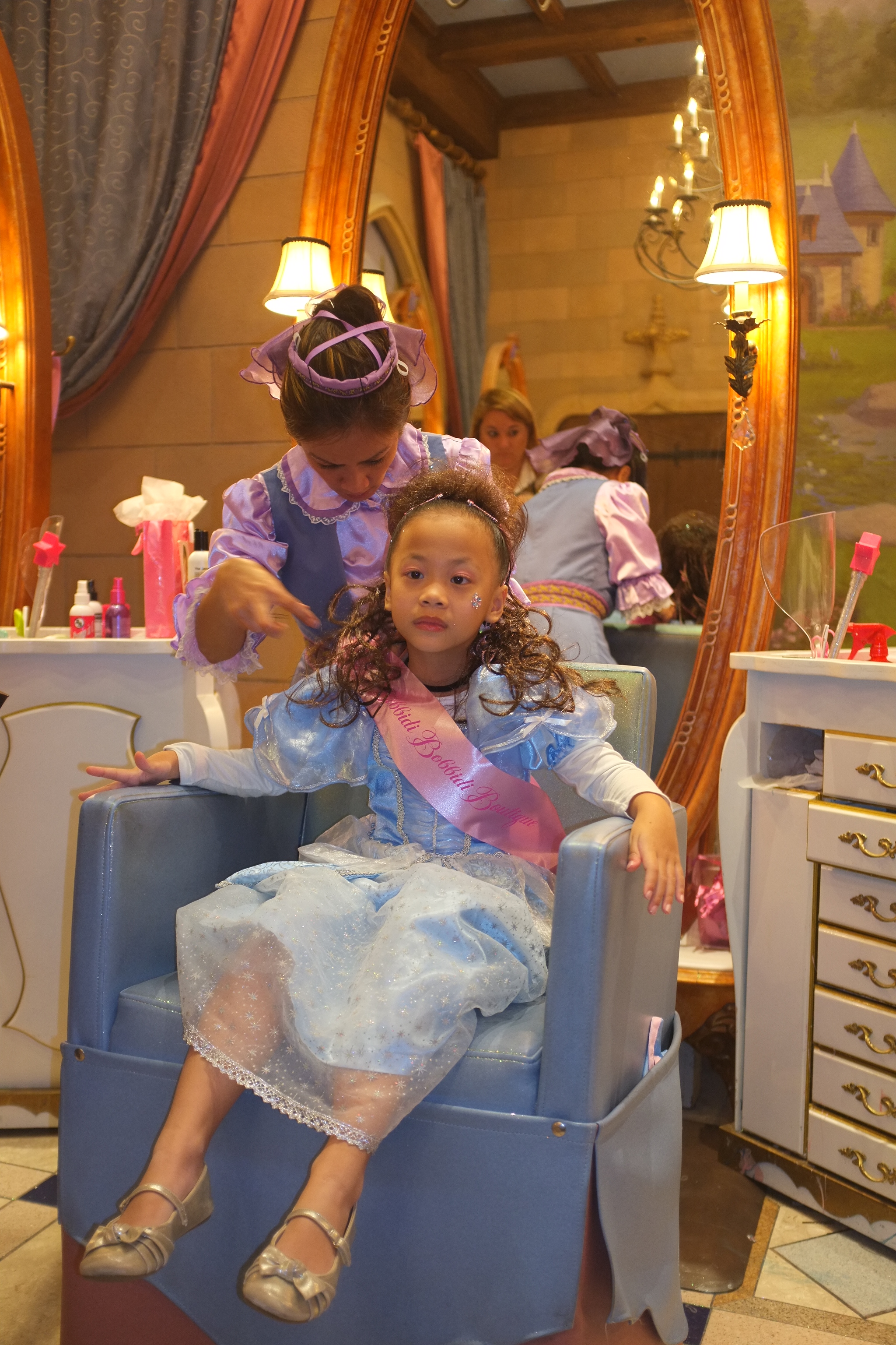 After lunch, we checked in at the Bibbidi Bobbidi Boutique, just across Cinderella’s Royal Table where we have made a reservation for a make-over package for Ashley. The boutique promises with a wave of her magic wand, your very own Fairy Godmother can turn little girls into a princesses. We were given a brochure with 4 hairstyles to choose from. Ashley was torn between the Fairytale Princess and Disney Diva style. She eventually chose the Diva style against ZA’s wishes that she choose the Fairytale Princess style. Ashley was in total heaven while getting transformed into a princess. She was treated like royalty. They let her choose between pink or blue polish, ( you get to keep both) which colour she would like on her eyes as well as what face gem she would like. The hair does get pulled pretty tight, but the Fairy Godmother was gentle. Throughout the experience, she was not allowed to look into the mirror. Finally, she was ready and with the wave of the wand, the Fairy Godmother told her to close her eyes before turning her over to face the mirror. The look on her face was priceless! She also gets to keep the makeup palette, a princess sash and a princess cinch bag. Although she looked lovely with the makeover, we very much preferred her old self.