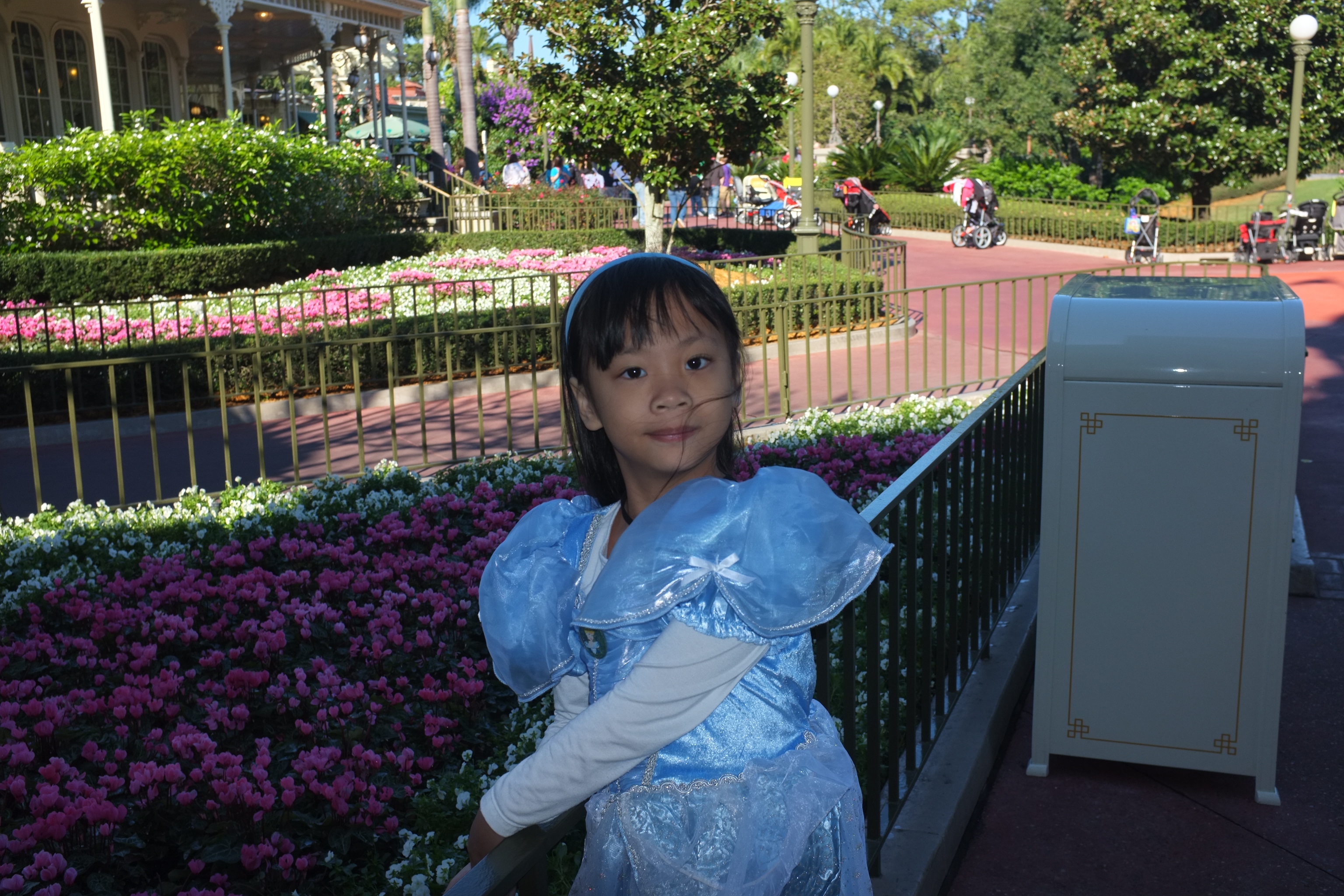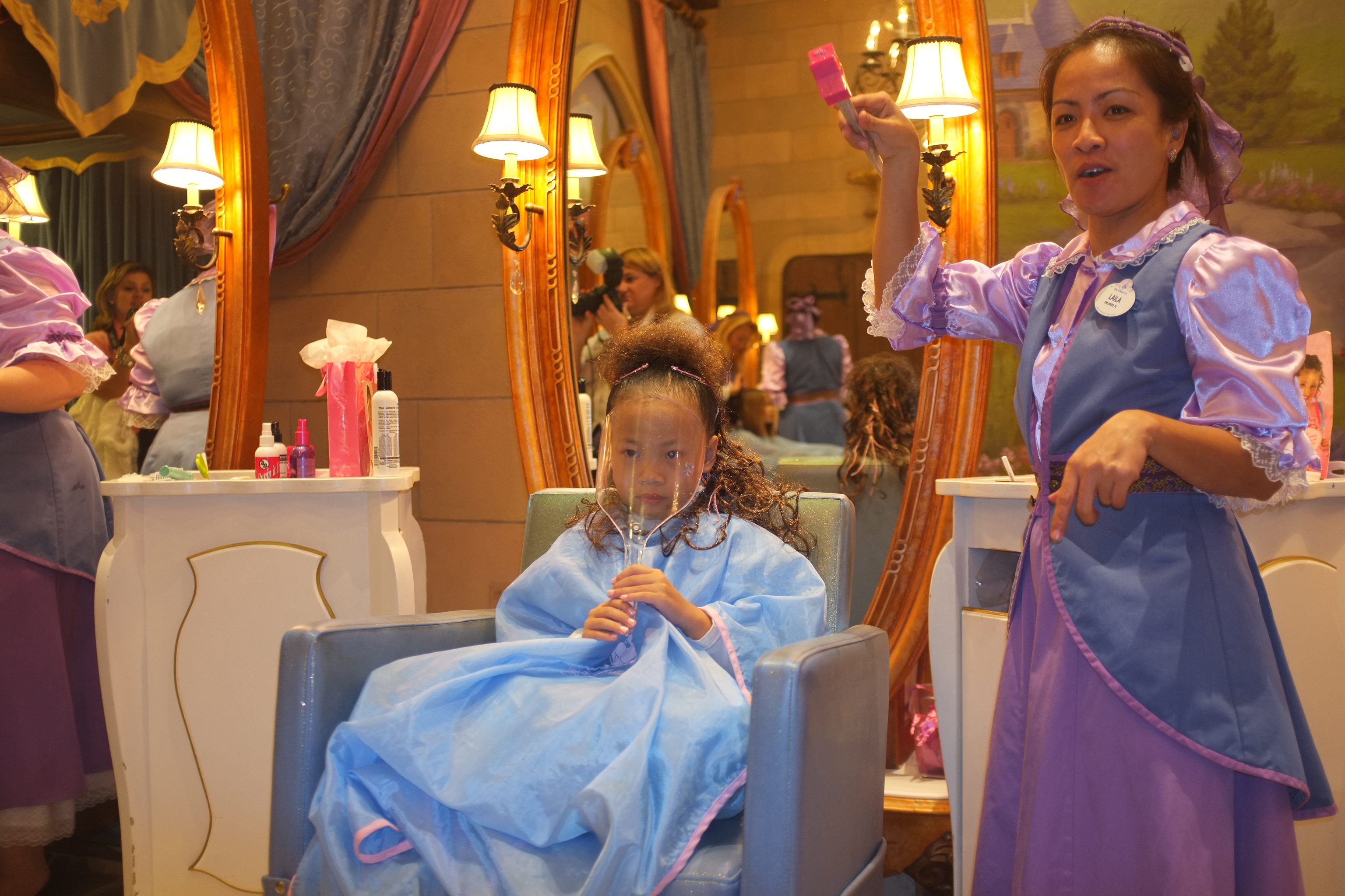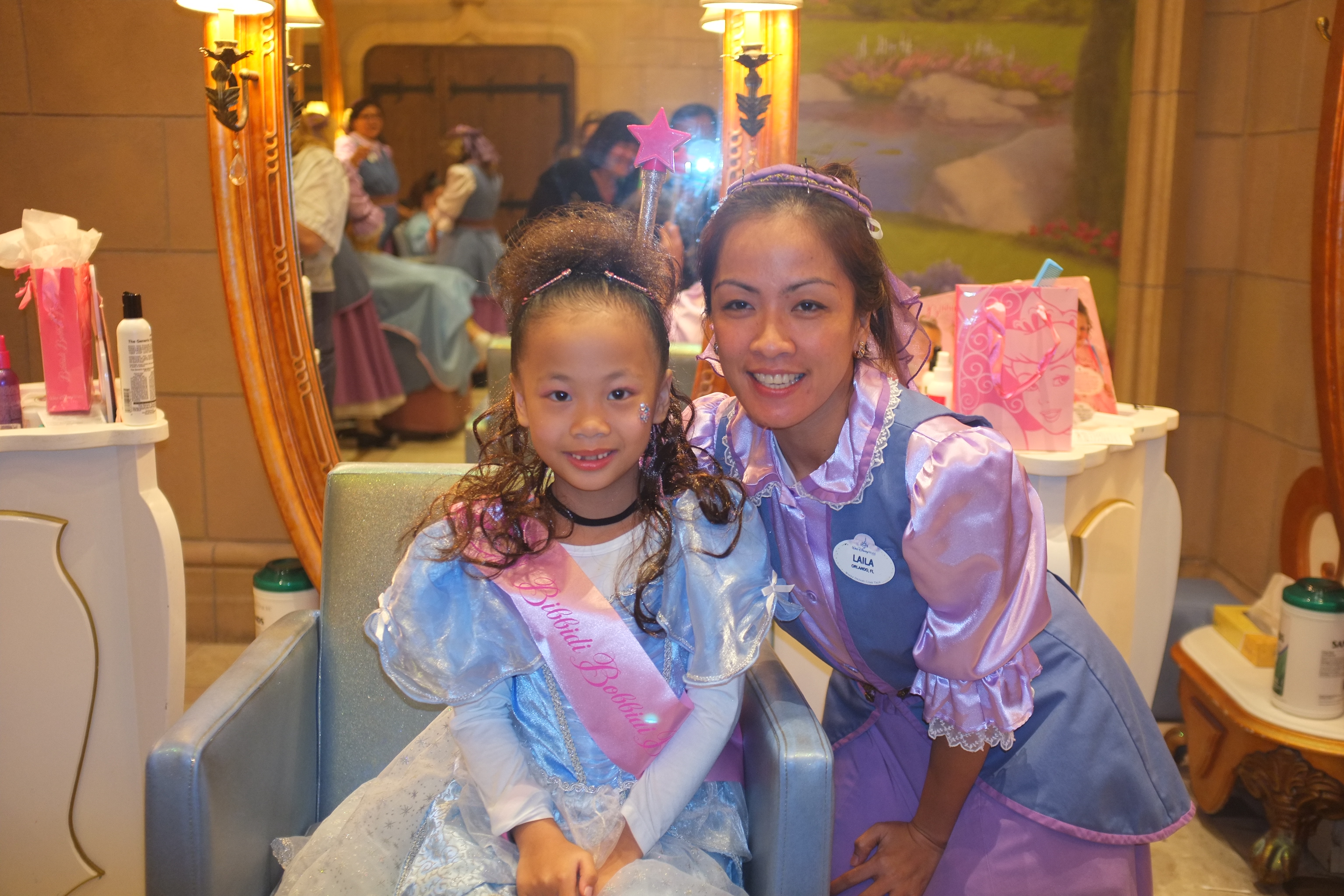 After lunch, we checked in at the Bibbidi Bobbidi Boutique, just across Cinderella’s Royal Table where we have made a reservation for a make-over package for Ashley. The boutique promises with a wave of her magic wand, your very own Fairy Godmother can turn little girls into a princesses. We were given a brochure with 4 hairstyles to choose from. Ashley was torn between the Fairytale Princess and Disney Diva style. She eventually chose the Diva style against ZA’s wishes that she choose the Fairytale Princess style. Ashley was in total heaven while getting transformed into a princess. She was treated like royalty. They let her choose between pink or blue polish, ( you get to keep both) which colour she would like on her eyes as well as what face gem she would like. The hair does get pulled pretty tight, but the Fairy Godmother was gentle. Throughout the experience, she was not allowed to look into the mirror. Finally, she was ready and with the wave of the wand, the Fairy Godmother told her to close her eyes before turning her over to face the mirror. The look on her face was priceless! She also gets to keep the makeup palette, a princess sash and a princess cinch bag. Although she looked lovely with the makeover, we very much preferred her old self.