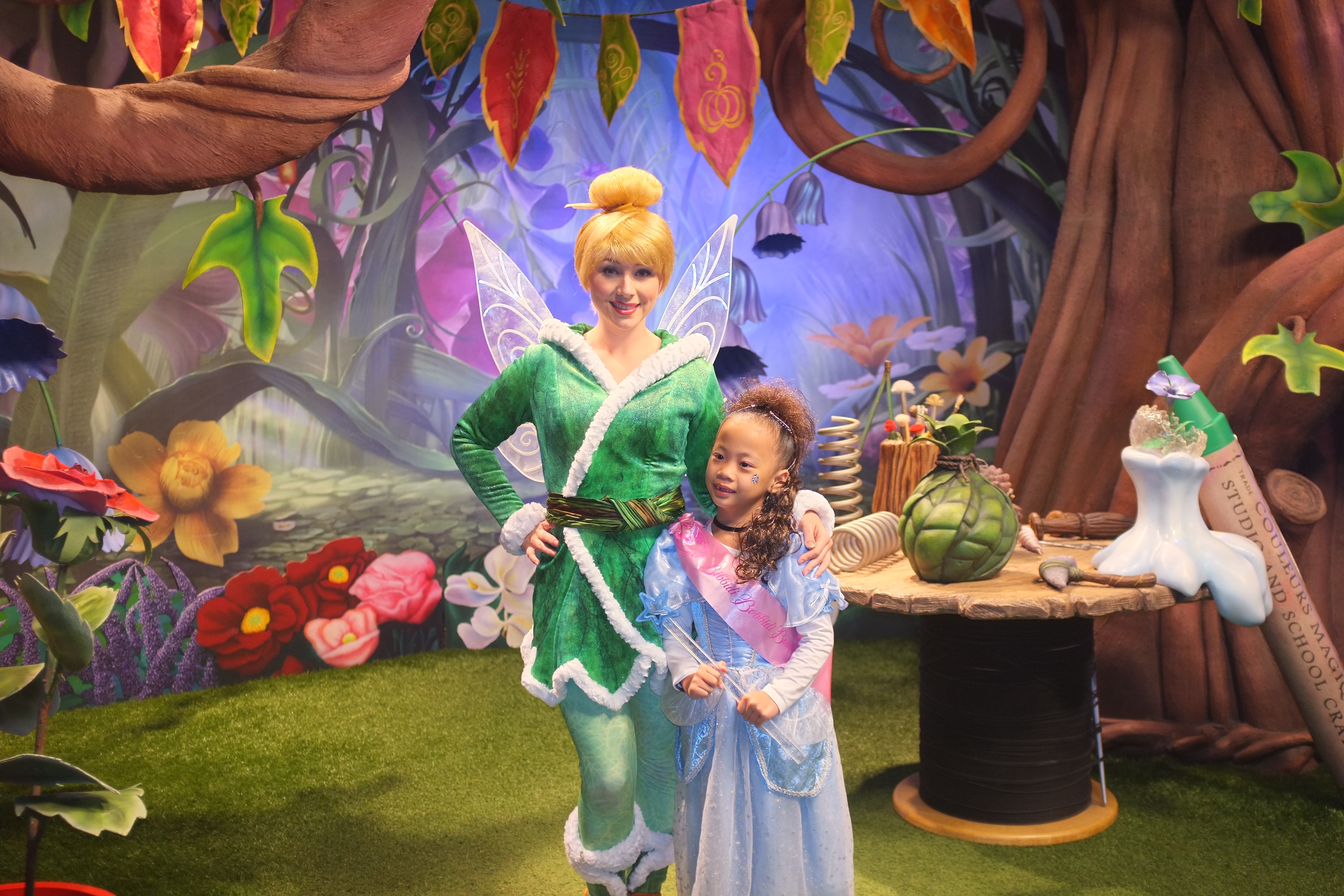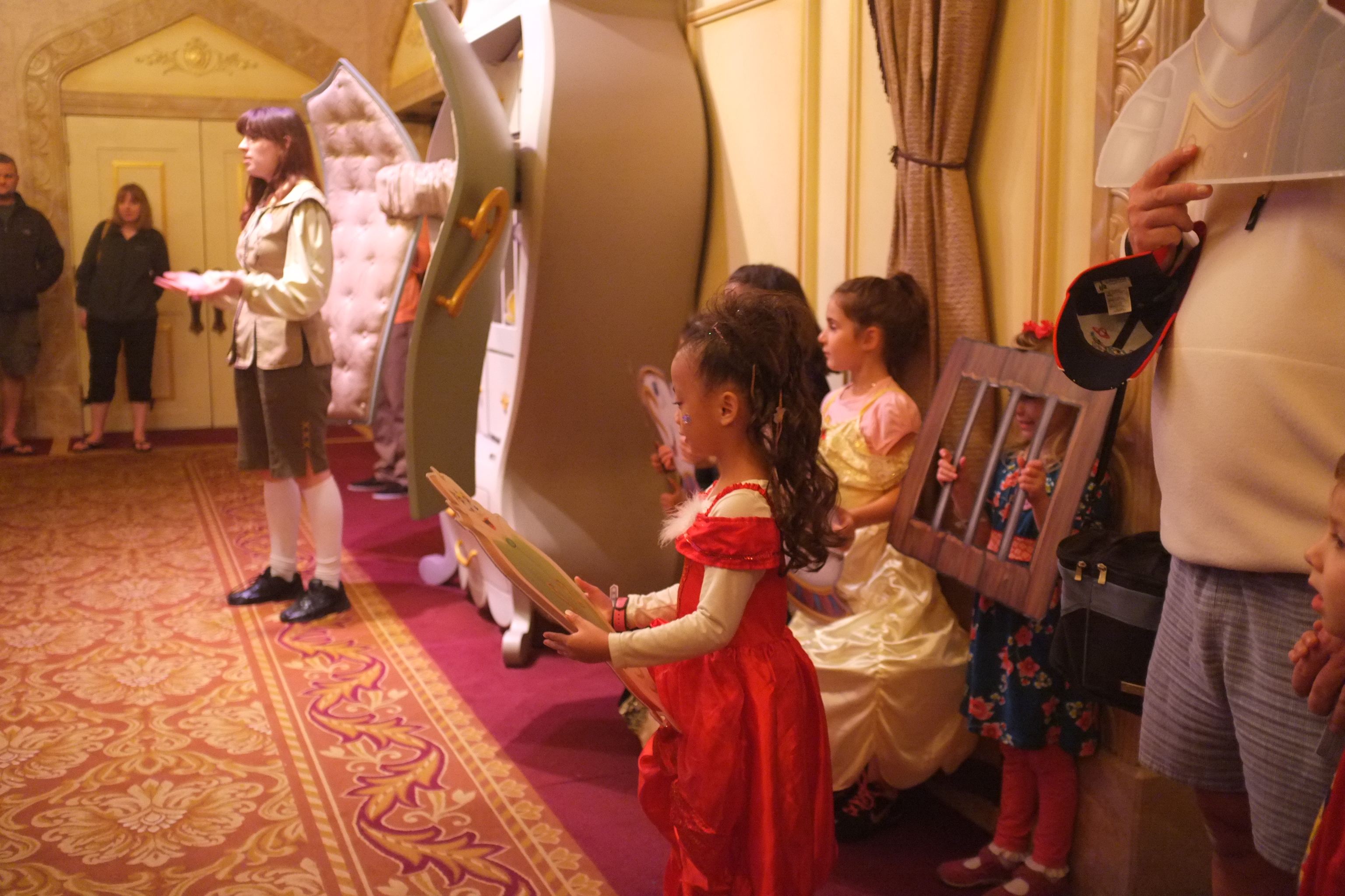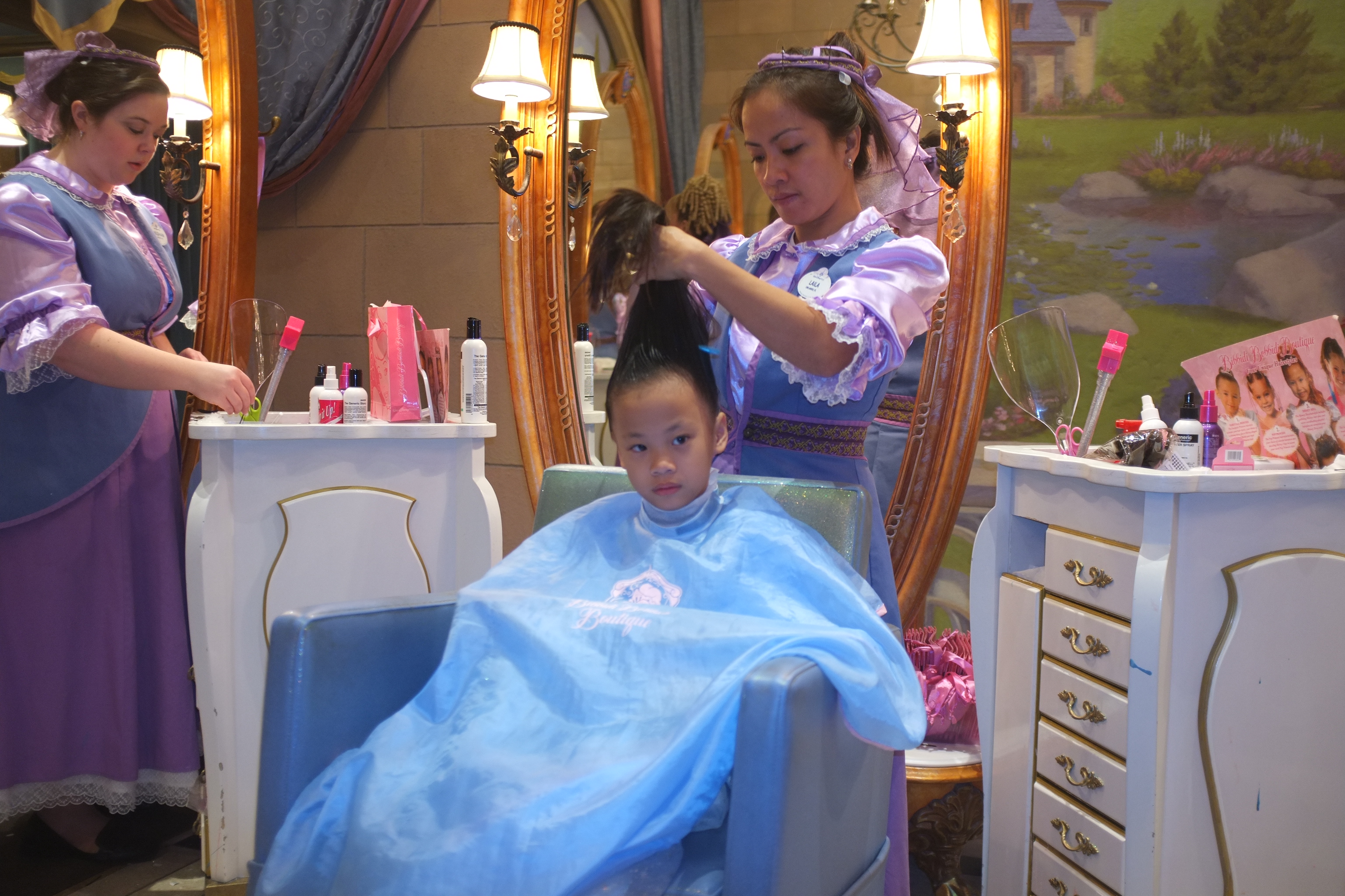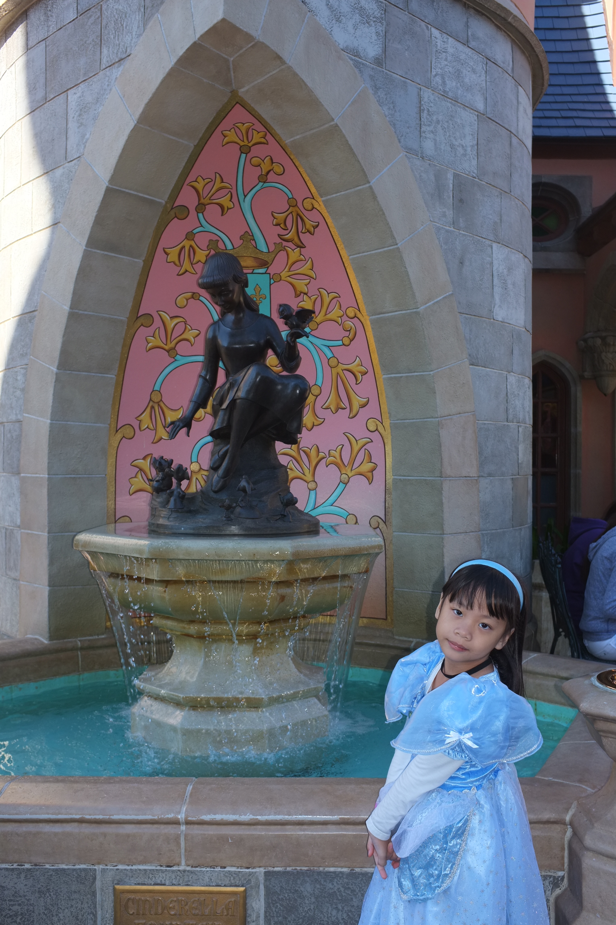 After lunch, we checked in at the Bibbidi Bobbidi Boutique, just across Cinderella’s Royal Table where we have made a reservation for a make-over package for Ashley. The boutique promises with a wave of her magic wand, your very own Fairy Godmother can turn little girls into a princesses. We were given a brochure with 4 hairstyles to choose from. Ashley was torn between the Fairytale Princess and Disney Diva style. She eventually chose the Diva style against ZA’s wishes that she choose the Fairytale Princess style. Ashley was in total heaven while getting transformed into a princess. She was treated like royalty. They let her choose between pink or blue polish, ( you get to keep both) which colour she would like on her eyes as well as what face gem she would like. The hair does get pulled pretty tight, but the Fairy Godmother was gentle. Throughout the experience, she was not allowed to look into the mirror. Finally, she was ready and with the wave of the wand, the Fairy Godmother told her to close her eyes before turning her over to face the mirror. The look on her face was priceless! She also gets to keep the makeup palette, a princess sash and a princess cinch bag. Although she looked lovely with the makeover, we very much preferred her old self.