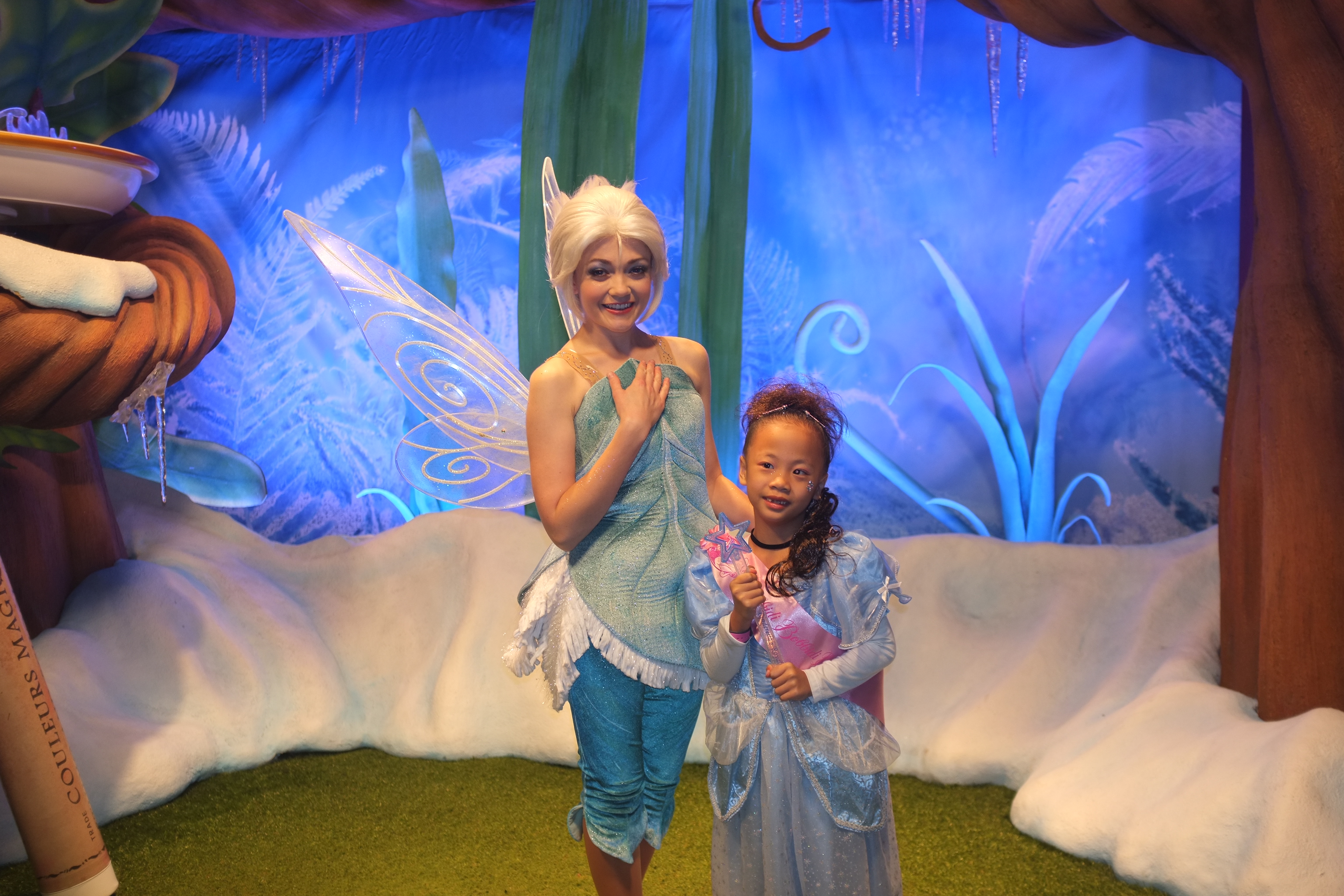 By now, the Christmas party has started. The Main Street was filled with people so we decided to do the reverse. The Princesses would only appear with their Princes at The Princess Fairytale Hall during Christmas Party nights. We headed there to meet them. The first line was for Cinderella and Prince Charming and Aurora and Prince Philip. Ashley was given much attention by the Princes to her delight. Next, we stood in line to meet Rapunzel and Flynn Rider and Snow White and The Prince. While meeting Rapunzel and Flynn, Ashley asked Flynn if he really wanted to steal the crown or did the Stabbington Brothers made him do so. He was really cute and told her they made him do so but has the crown with him in safe custody. He made her promise not to tell this secret, opened his bag and showed her the shiny crown. We were amazed by the details Disney went into right to the character meet and greet itself.