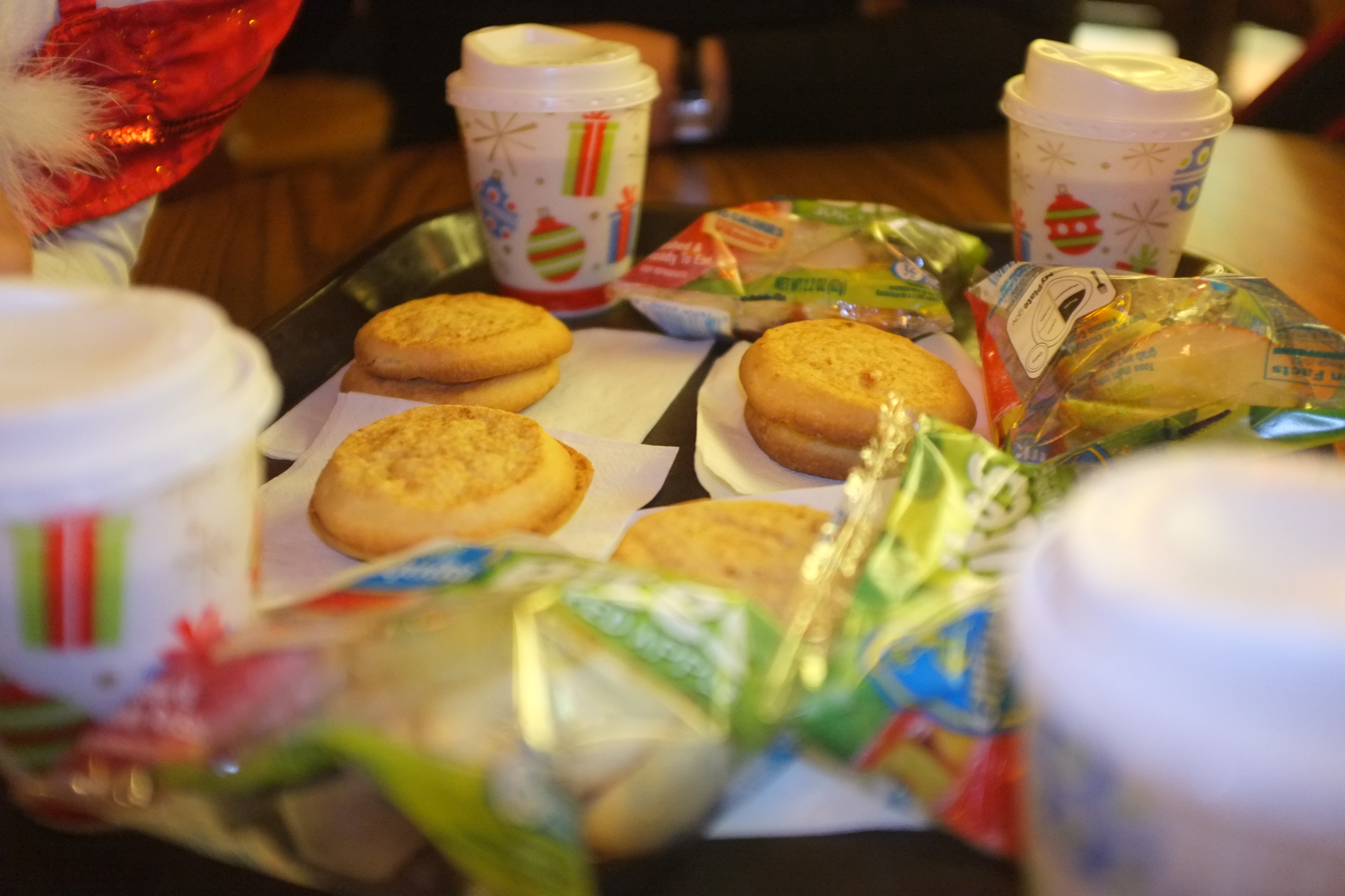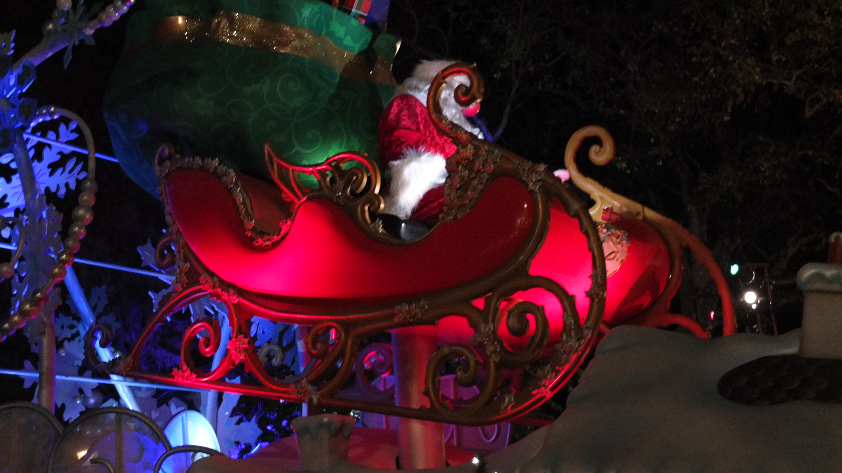 We stopped next at Pinocchio Village Haus to get some complimentary Hot Chocolate, Cookies and Apple Slices. The Hot Chocolate was really good and especially appreciated during cold nights like this. We headed over to Main Street to stake out a place to watch Holiday Wishes next. Holiday Wishes is definitely our highlight of the night. It is amazing in its ability to thematically incorporate fireworks so they fit not only the name of the show, but more importantly, with the accompanying song lyrics. It was truly spectacular. We wanted to do the meet and greet with the Seven Dwarfs who only appear during Christmas parties but the line was way too long so we gave up. Next, we watched the Mickey’s Once Upon Christmastime Parade. This parade has marching toy soldiers, dancing reindeer and gingerbread men, and not to mention Santa Claus. The floats are colourful, Chip & Dale are mischievous, and Mickey & Minnie are dressed in their holiday finery. The Princesses also appear with their Princes and Belle was decked out in her red Christmas outfit. The one thing we were truly impressed was the incorporating of scent during the parade. We could smell the candies as the floats with candies passed us.