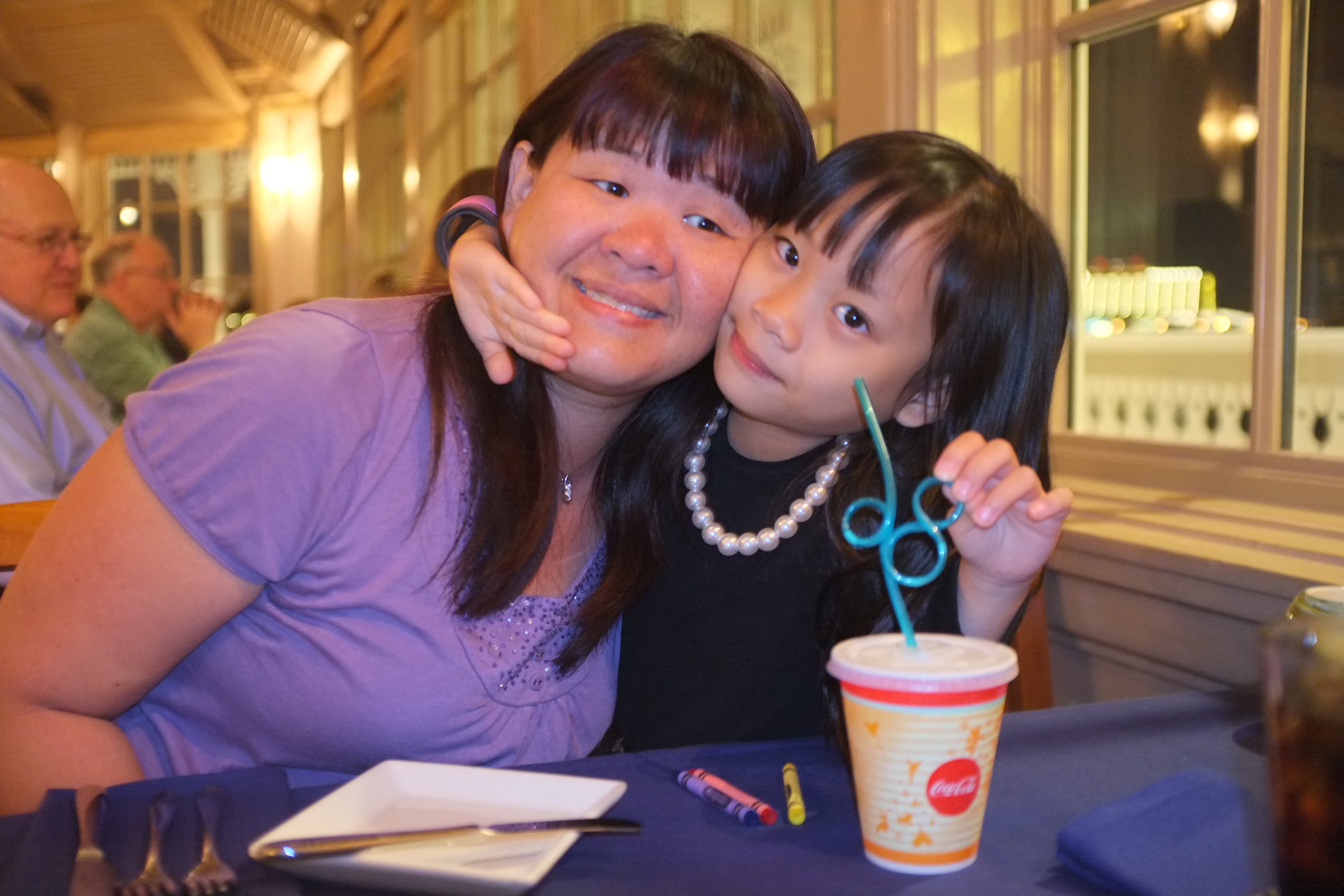 We had a dinner reservation at Narcoossee’s at Grand Floridian Resort and Spa. It is the only signature dining location we booked as it had a relaxed atmosphere. Narcoossee’s is located at the end of the Grand Floridian transportation boat dock and took quite a bit of walking to get there. It is a waterfront octagon shaped building which allows for maximum capacity window seating with spectacular views of the Seven Seas Lagoon and Cinderella’s castle. We were 20 minutes late and checked in at the podium. While waiting to be seated, Ashley couldn’t wait to go to its verandah for the great view outside. It was not long before we were ushered to our table. We were lucky enough to get a window table. We ordered a Lobster Bisque to share. Ashley wanted Macaroni and Cheese again while the rest of us ordered the signature dish – Butter Poached Maine Lobster Tail with 14oz Boneless Ribeye Steak. Soon, our drinks arrived with complimentary freshly baked bread and salted butter. The bread had perfect textures of crusty on the outside and soft on the inside. The Lobster Bisque was tasty with lots of lobster meat. Soon, our entrees arrived and Ashley was so excited that our macaroni is Mickey shaped. The steak were cooked perfectly and the lobster tail fresh and sweet. Ashley loved the lobster tail too. While we were eating, we could see the Electrical Water Pageant. After the parade ended, we had full view of Magic Kingdom’s fireworks from our seat complete with piped in music. While most of us chose to watch it from the verandah, Jarod preferred to watch it from his seat. Ashley was laughing in excitement as she ran to the verandah to get a good spot to watch it. Although we were watching it across the lagoon, we had perfect unblocked view. It was so much better than staying at the park and trying to stake a spot to watch it with all the crowd. For desserts, we all returned to our favourite. Ashley had her Vanilla Ice Cream, ZA had Apple Tart with Caramel Sauce and Jarod and I had the Almond Crusted Cheesecake with Lambert Cherry Sauce. It was the perfect ending to our meal. With this meal, we used up all our dining credits for table service restaurant. It would have cost us USD 300 otherwise.