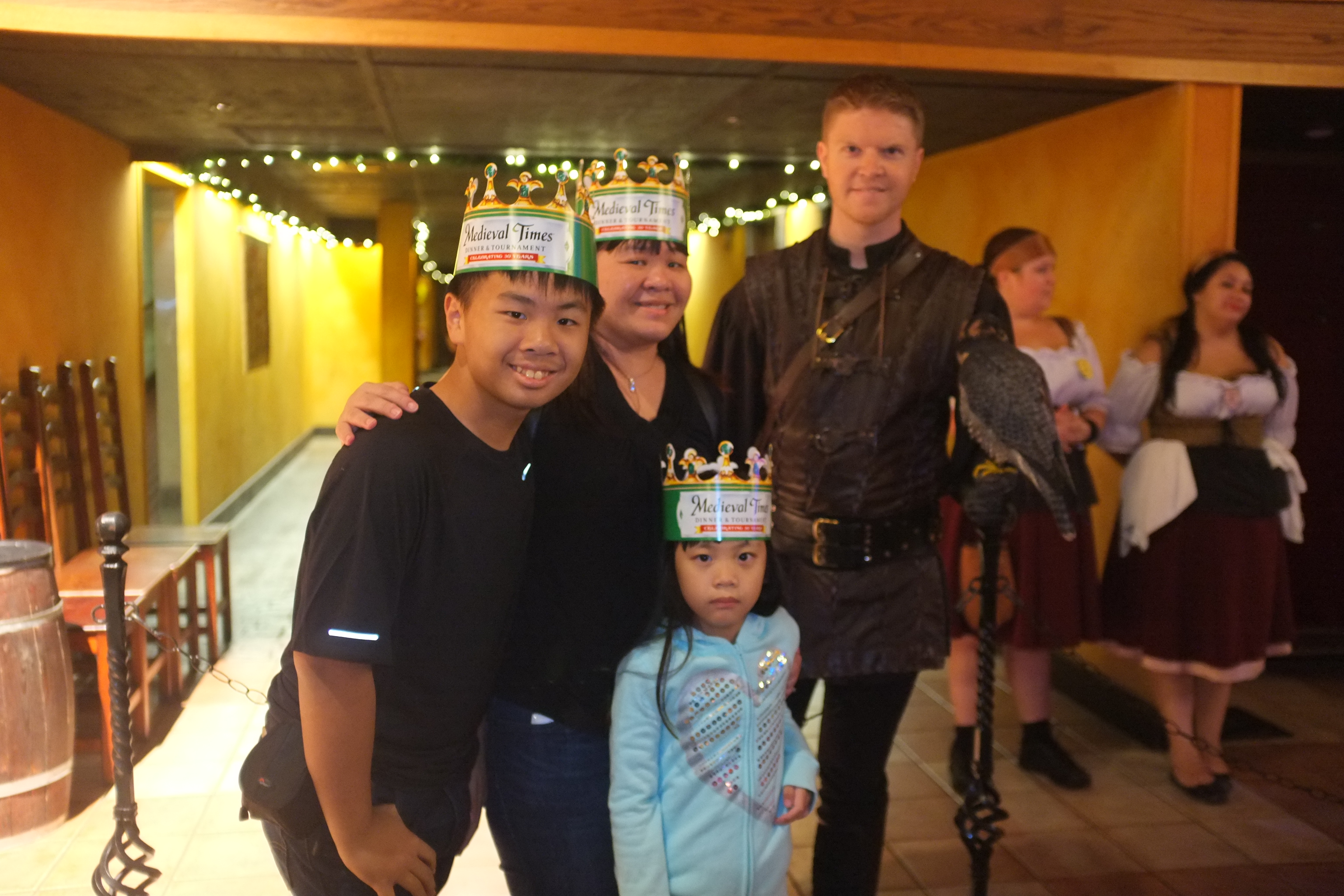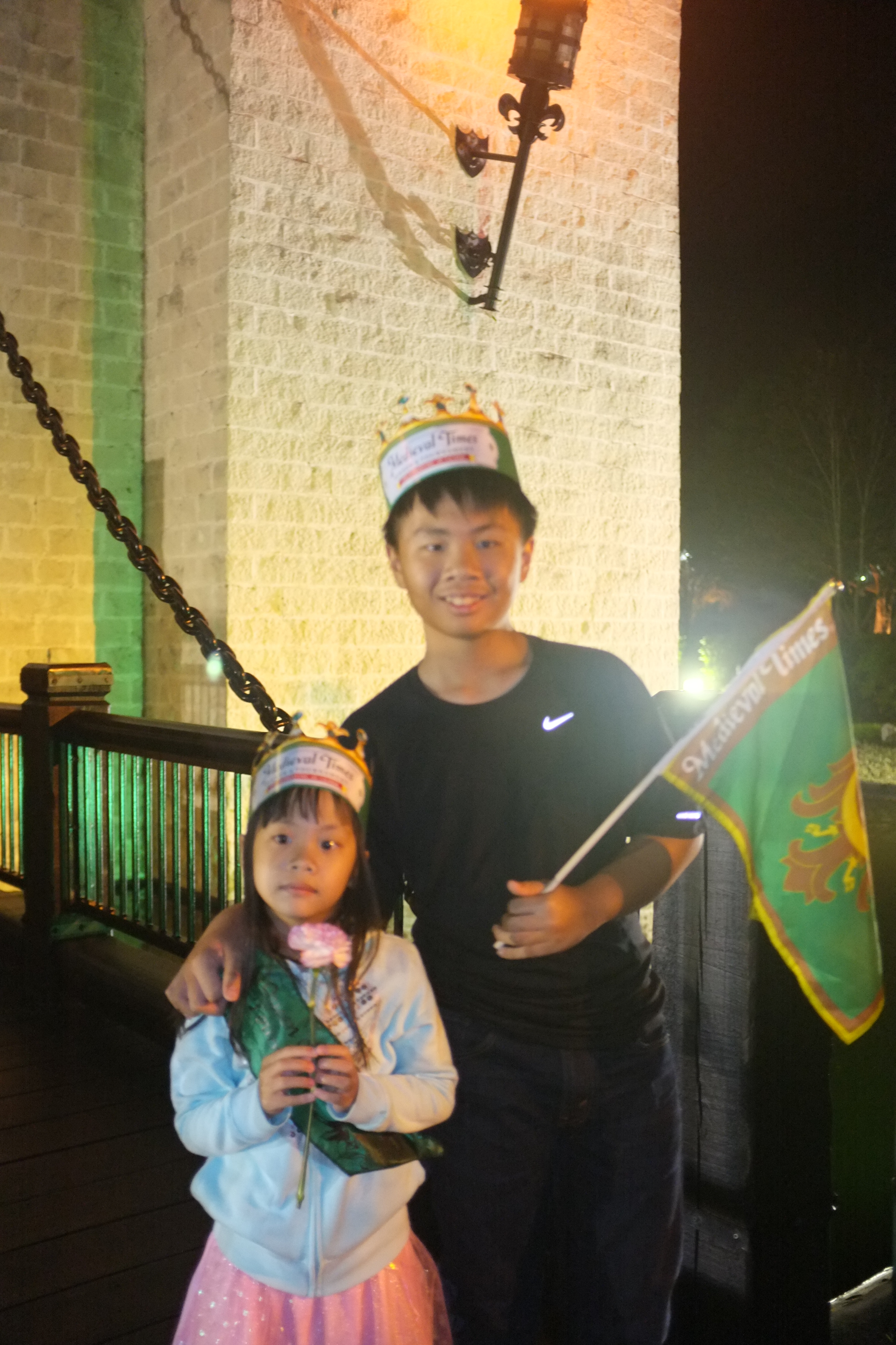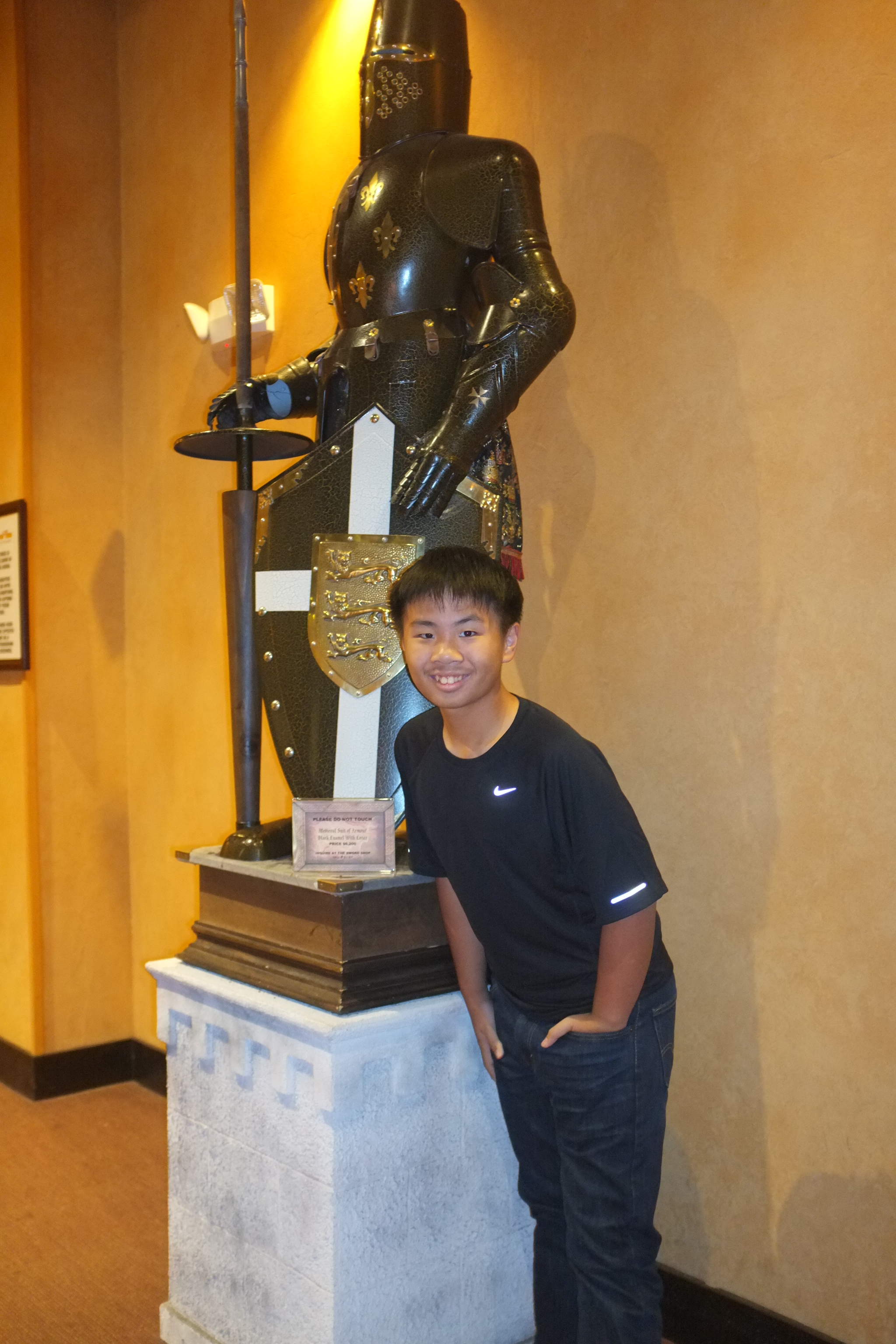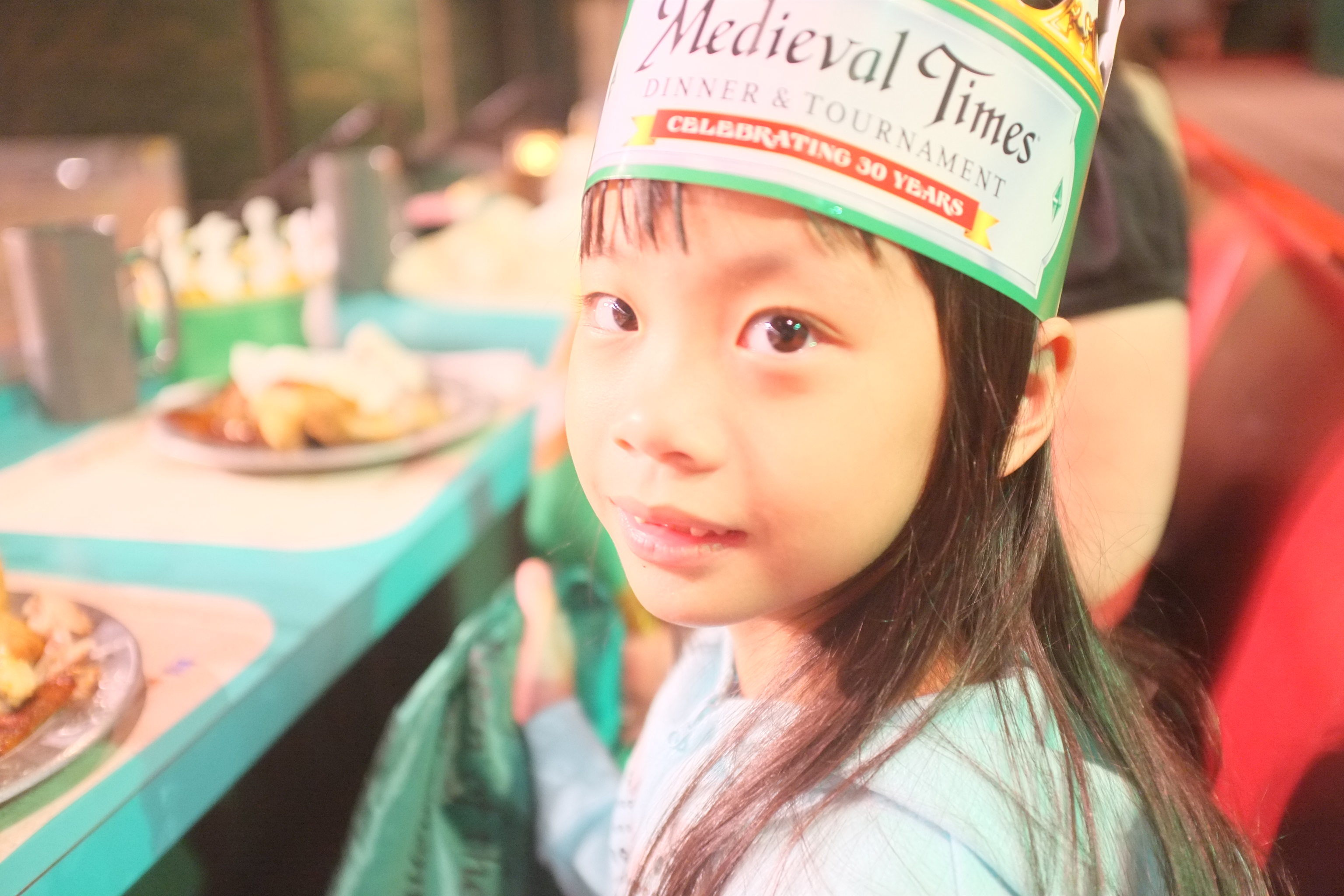 Before the show started, Ashley was very cranky due to lack of sleep. However, once the show started, she was drawn into it and woke up. She bought a green flag to support our Green Knight. The dinner started with tomato bisque and garlic bread. We cheered as the Green Knight rode in front of our table, he had with him 3 stalks of flowers. He threw 2 to the back and Ashley was really trying to catch one. As he is left with the last flower, he rode up to Ashley and handed it to her. Ashley was ecstatic! In the meantime, we were served roasted chicken, ribs and potato. We were so engrossed with the show that we hardly remembered to eat our food. The Knights played some tournament games and our Knight emerged first. We were then told that the Knight will present a Queen of Tournament sash to a special someone. To our pleasant surprise, he stopped in front of Ashley and presented her the sash on a spear. The audience were all cheering for her and the surprise look on Ashley’s face was priceless! The photographer helped her put on her sash and took pictures of her and us as family. We of course bought this photo package at USD 20. After which, more fighting amongst the Knights continued until the winner emerged. Ashley was really hoping that our Knight would win and he did not disappoint!