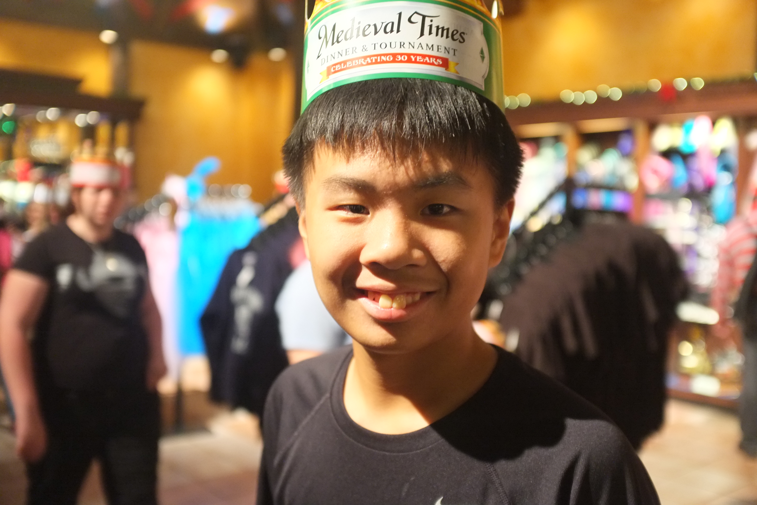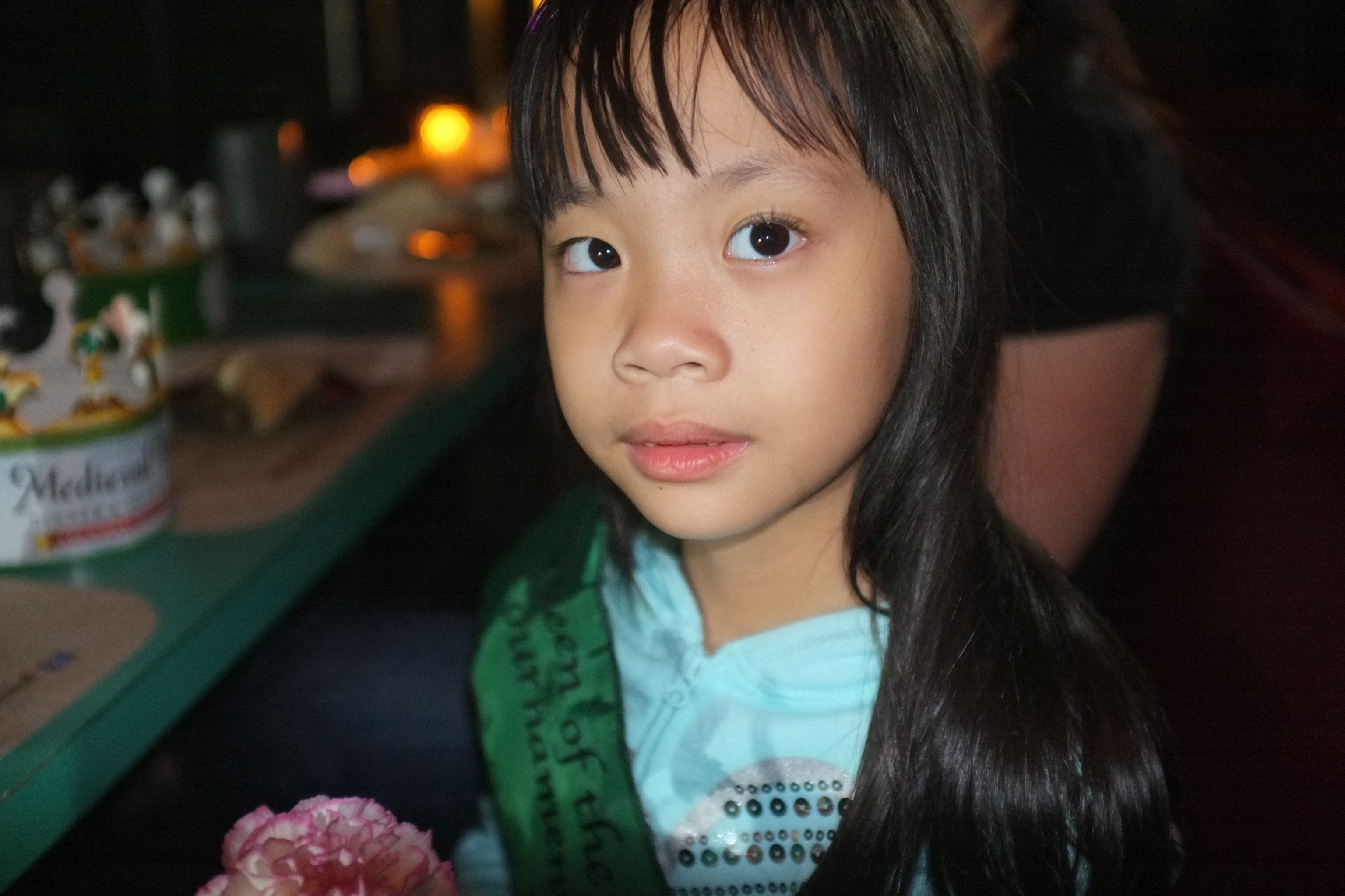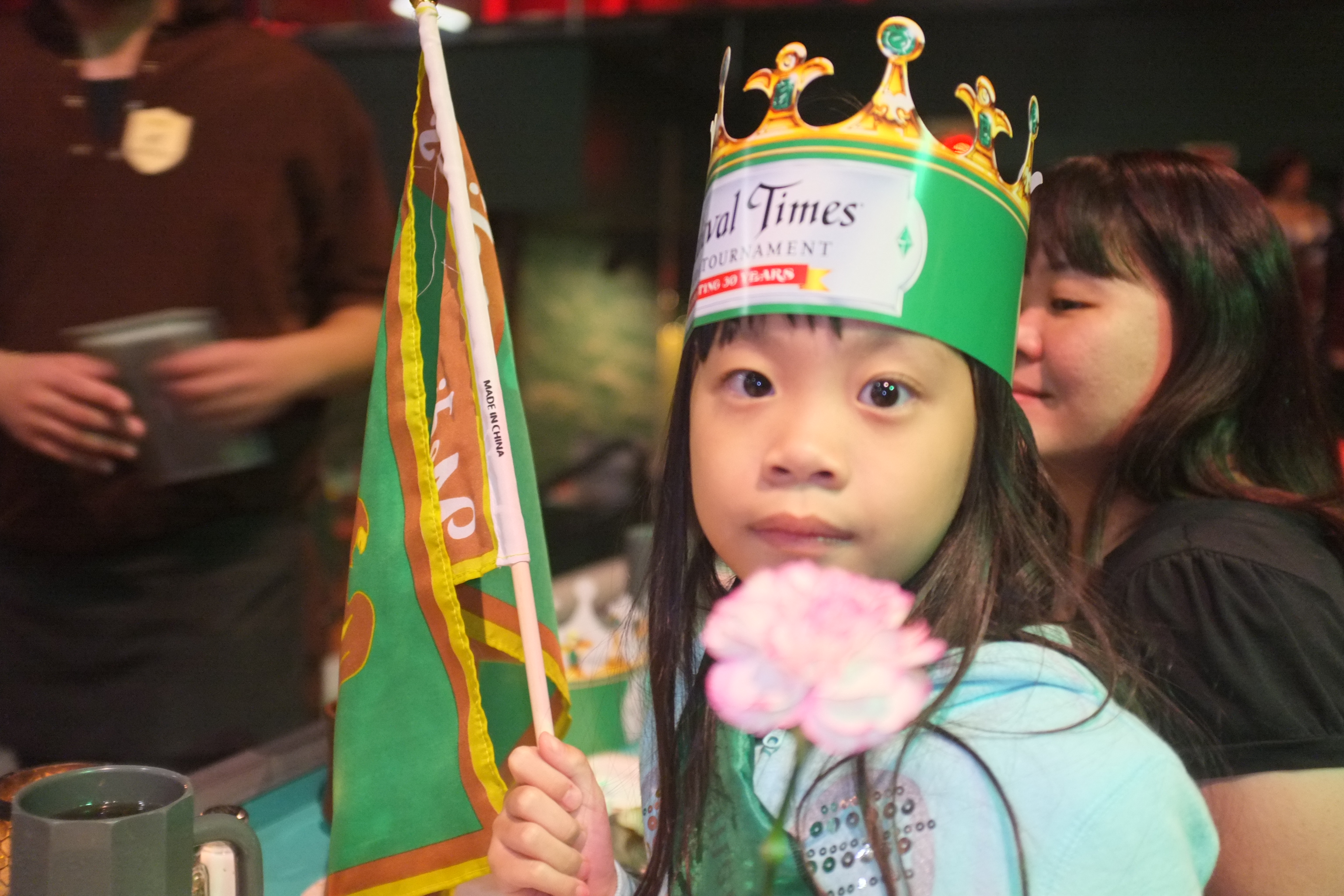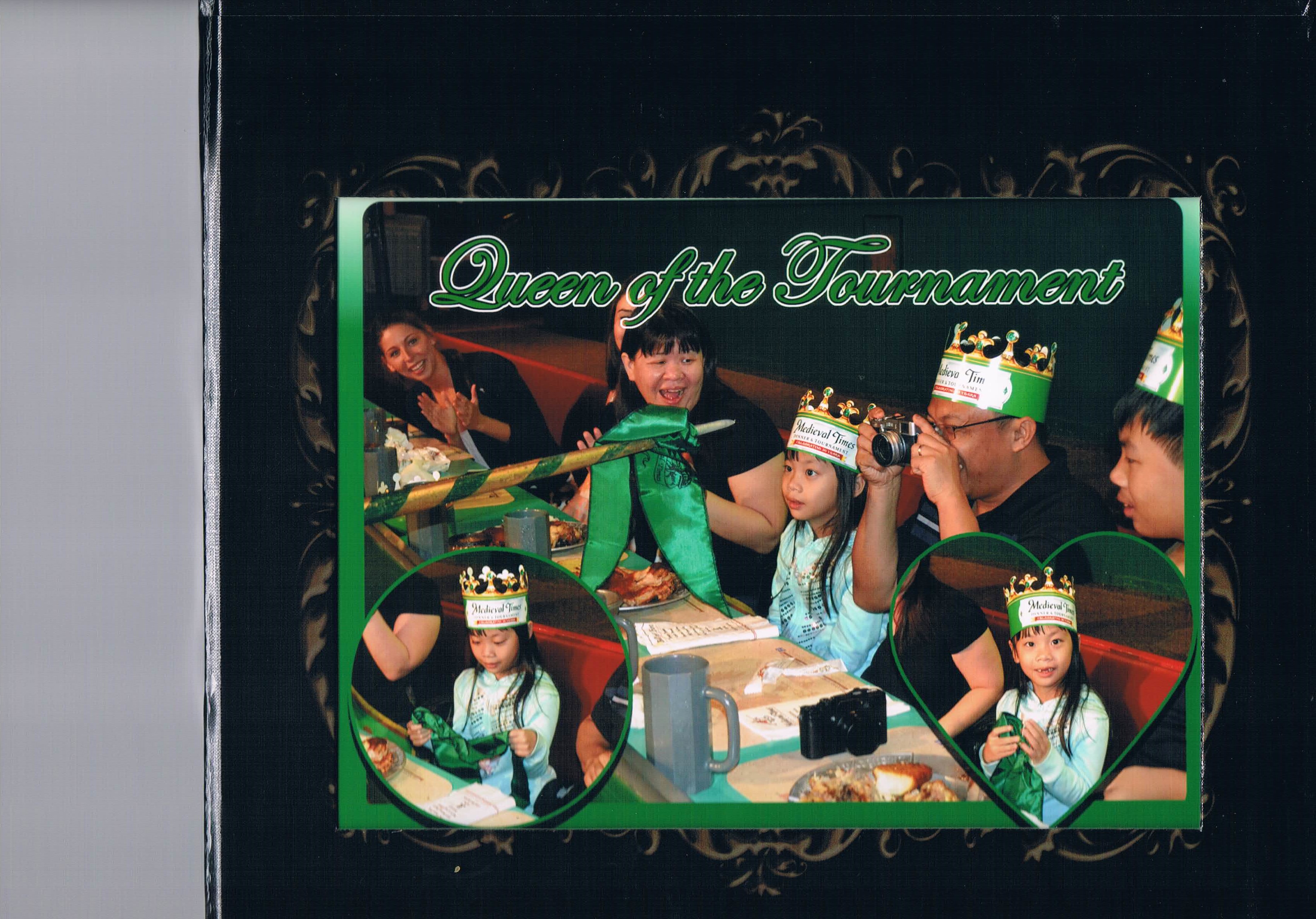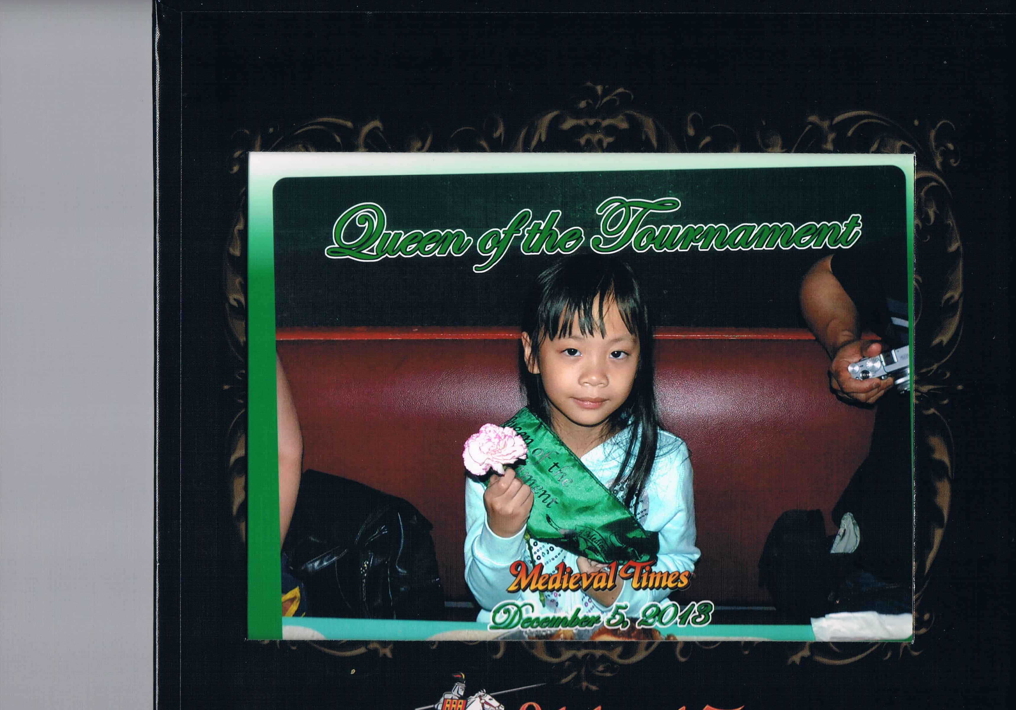Before the show started, Ashley was very cranky due to lack of sleep. However, once the show started, she was drawn into it and woke up. She bought a green flag to support our Green Knight. The dinner started with tomato bisque and garlic bread. We cheered as the Green Knight rode in front of our table, he had with him 3 stalks of flowers. He threw 2 to the back and Ashley was really trying to catch one. As he is left with the last flower, he rode up to Ashley and handed it to her. Ashley was ecstatic! In the meantime, we were served roasted chicken, ribs and potato. We were so engrossed with the show that we hardly remembered to eat our food. The Knights played some tournament games and our Knight emerged first. We were then told that the Knight will present a Queen of Tournament sash to a special someone. To our pleasant surprise, he stopped in front of Ashley and presented her the sash on a spear. The audience were all cheering for her and the surprise look on Ashley’s face was priceless! The photographer helped her put on her sash and took pictures of her and us as family. We of course bought this photo package at USD 20. After which, more fighting amongst the Knights continued until the winner emerged. Ashley was really hoping that our Knight would win and he did not disappoint!