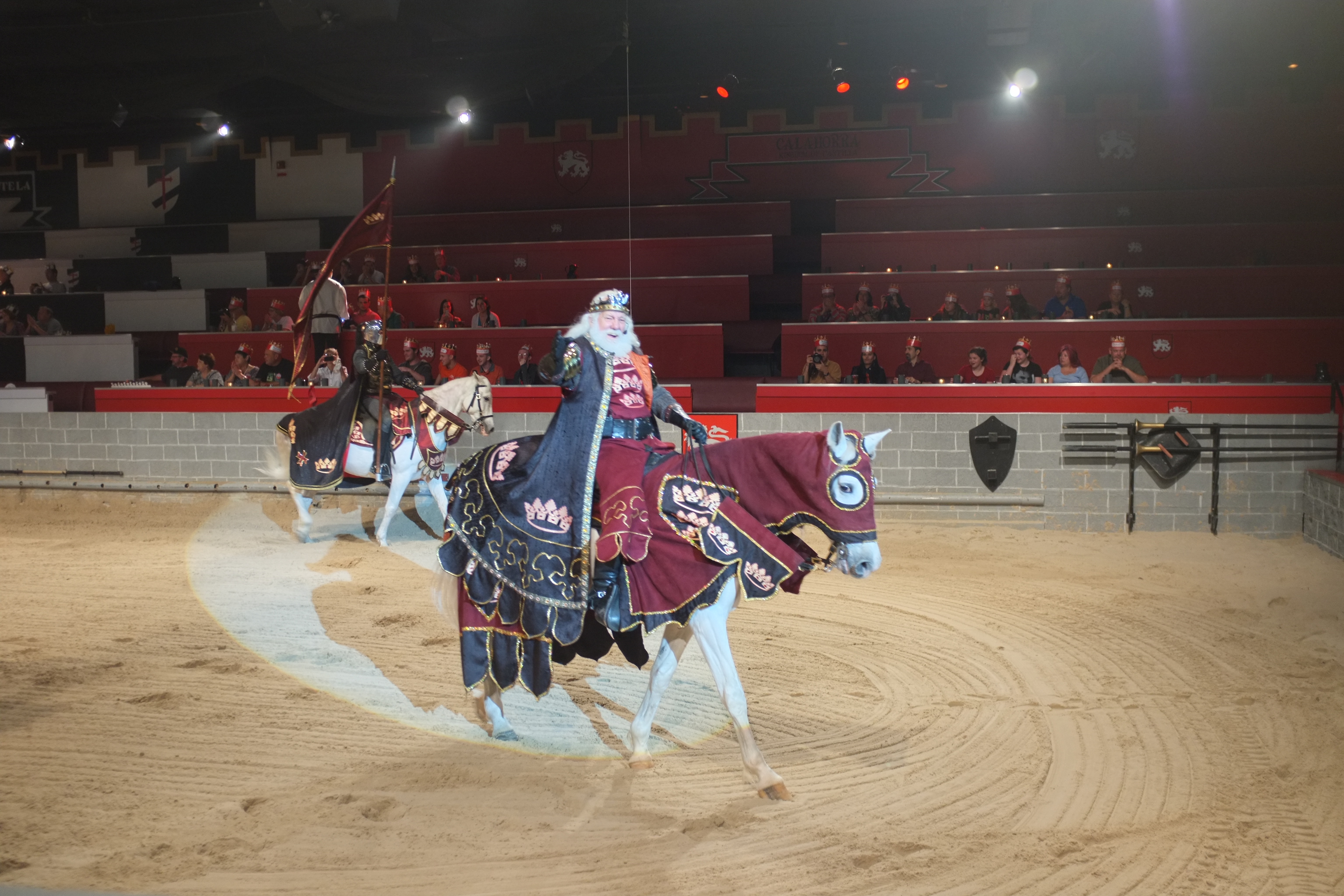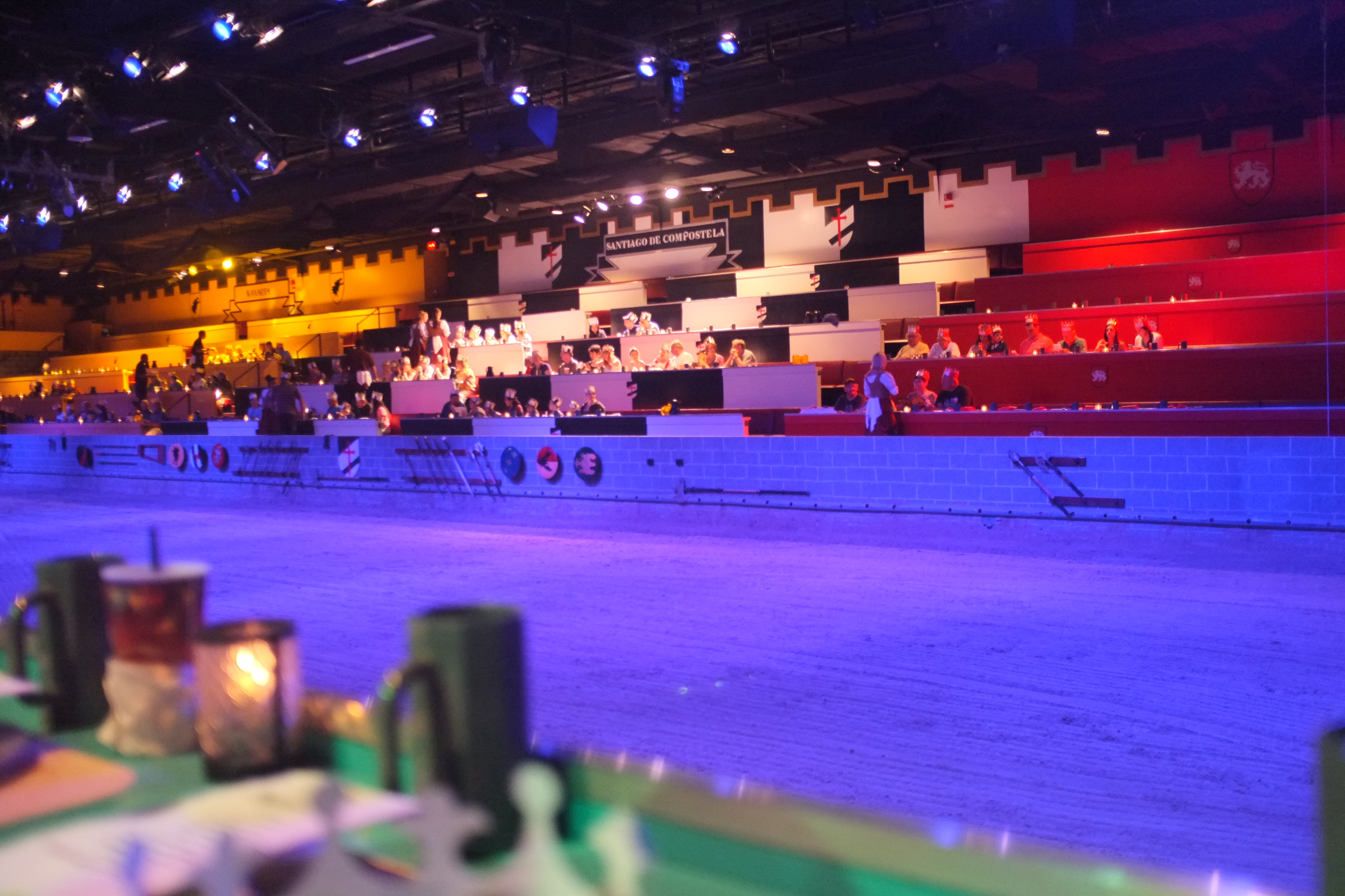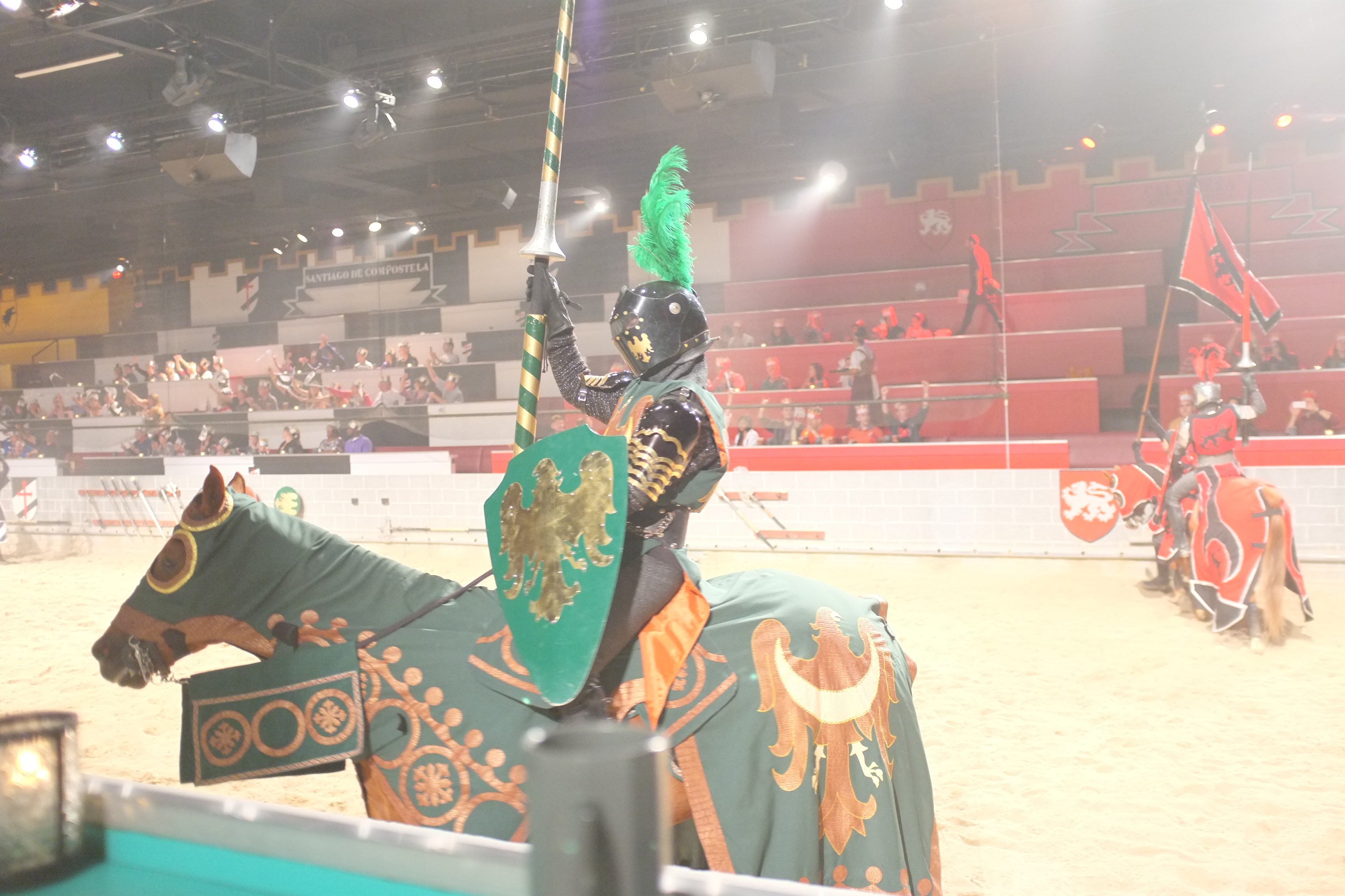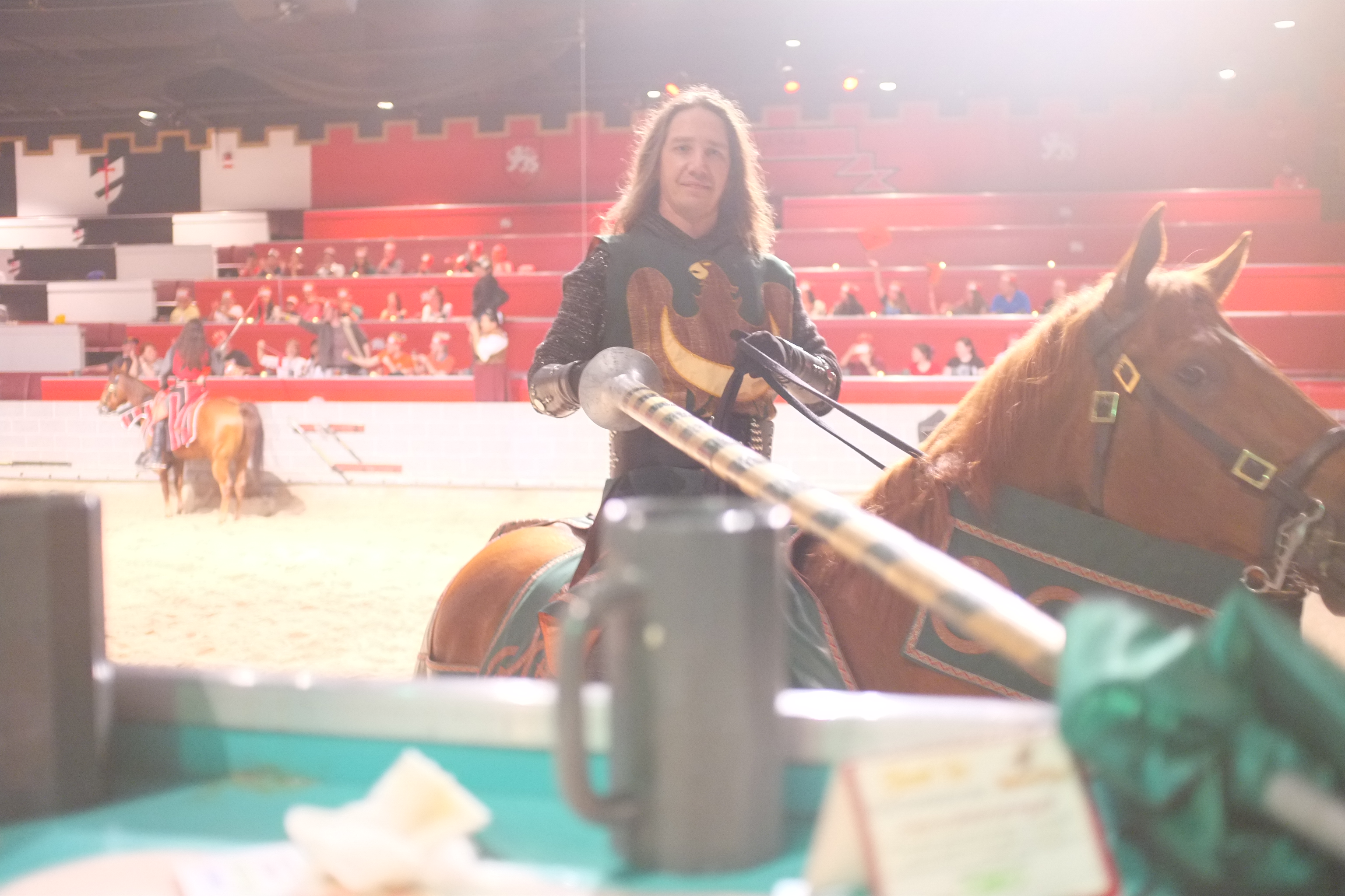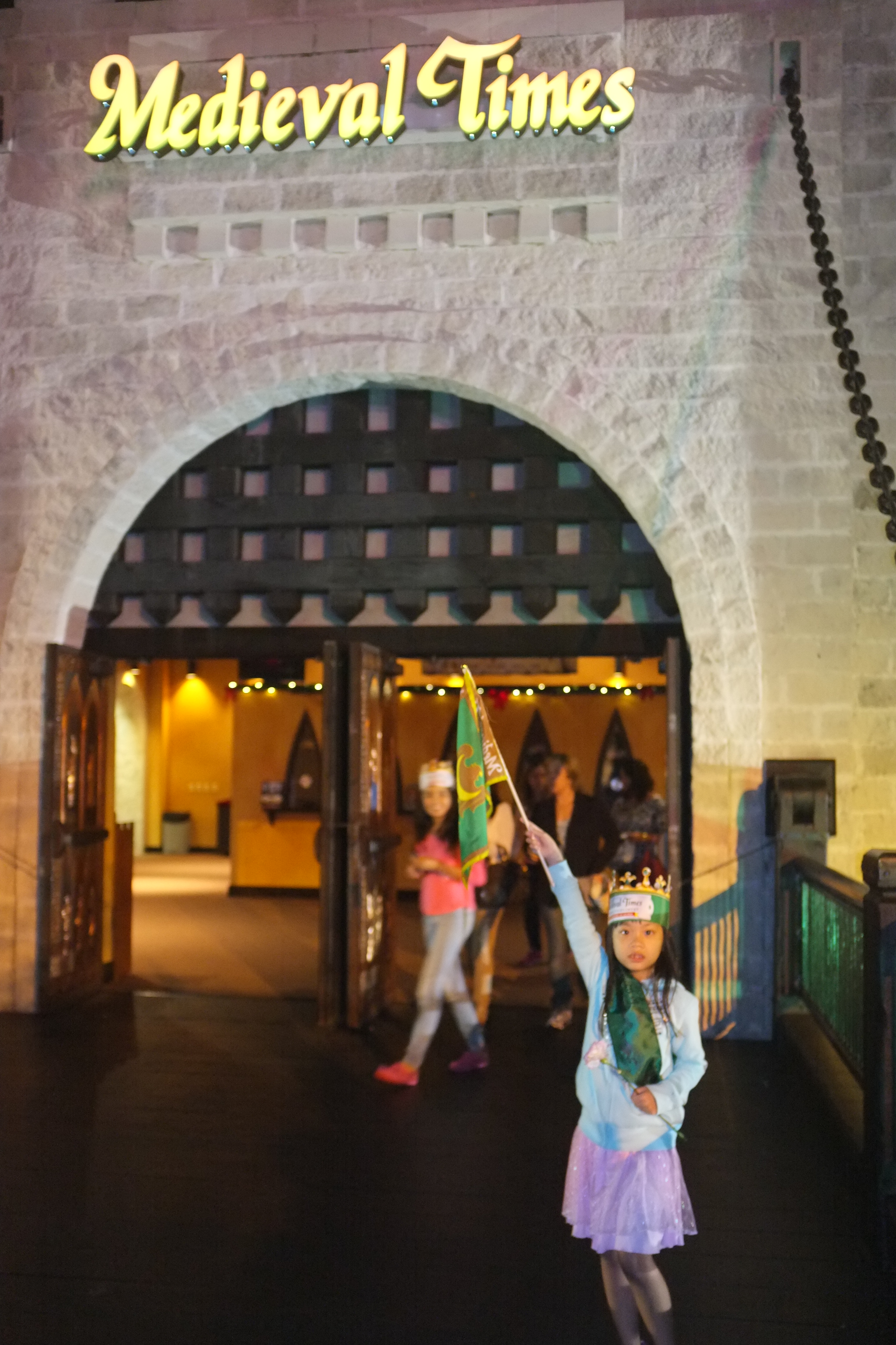 We have made reservations at The Medieval Times Dinner & Tournament at 6pm. There was a traffic congestion on our way there. We arrived at the Orlando castle, checked in and were assigned the Green table no. 1, which is the front row and given green crowns. This is a dinner show with 6 knights donning armour, clash in a jousting tournament for the title of King’s champion.