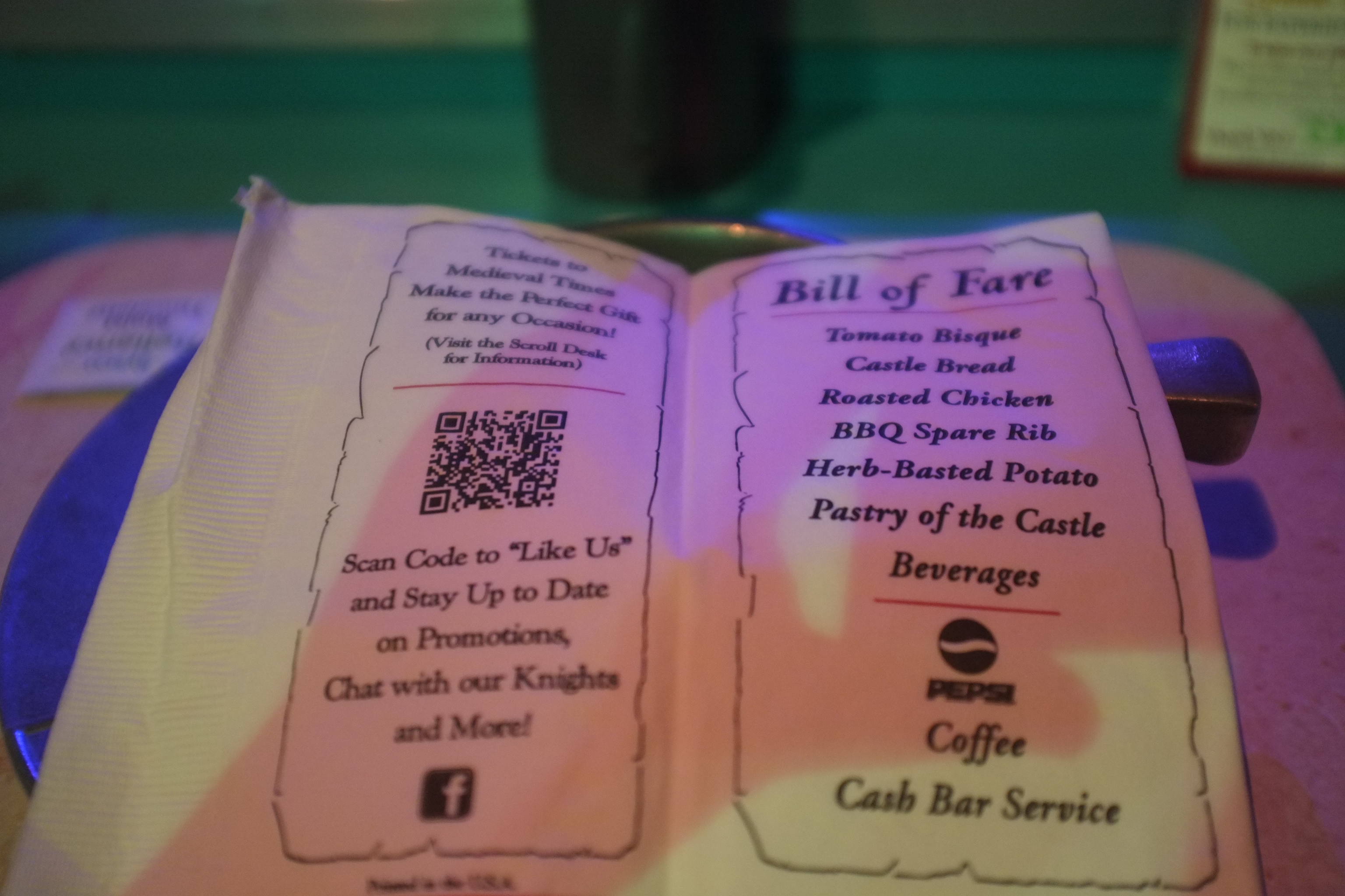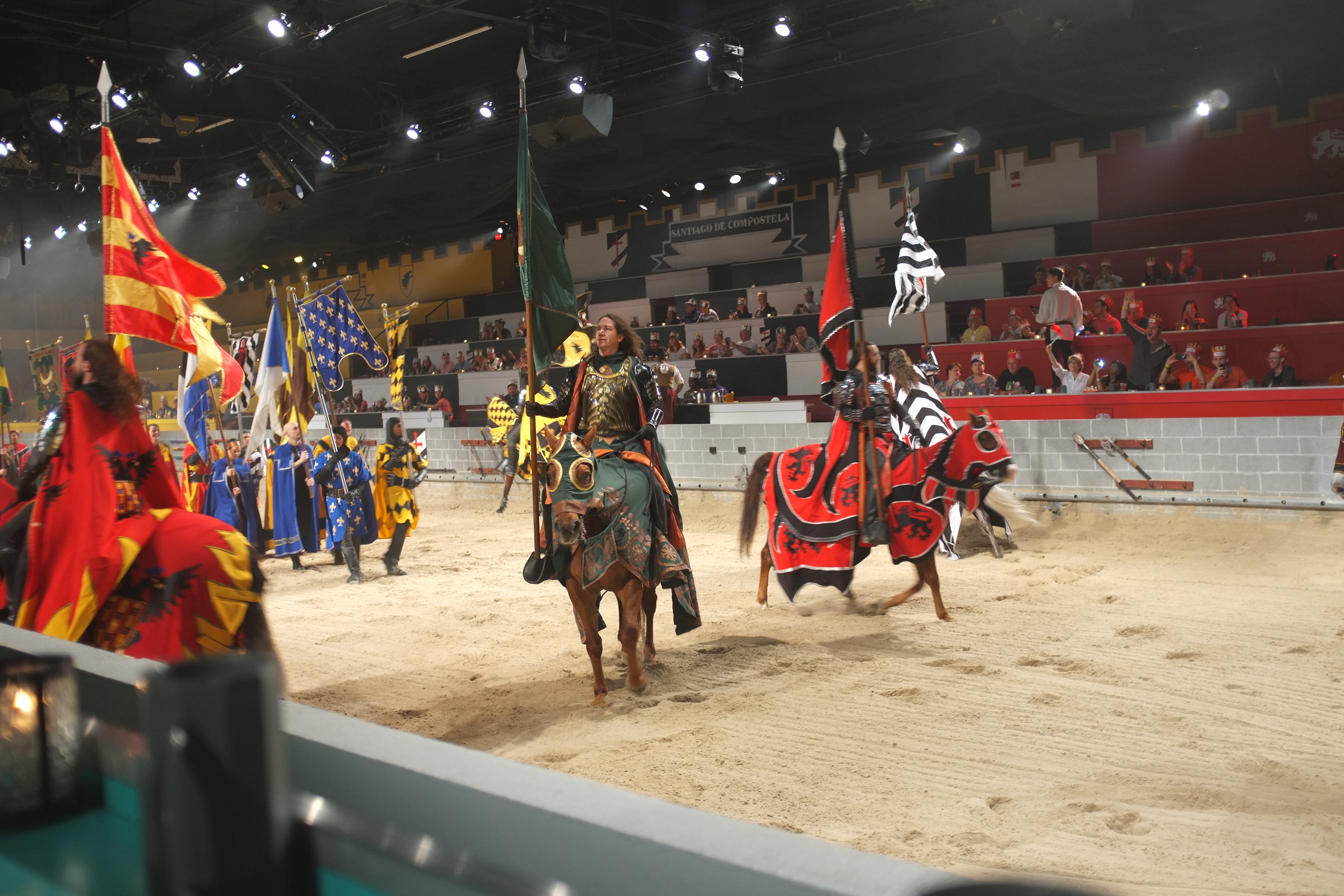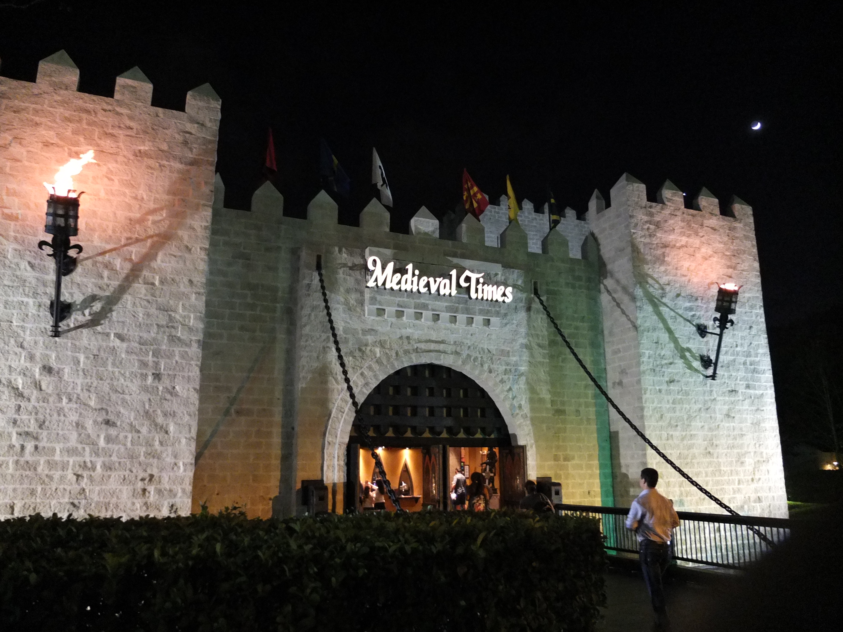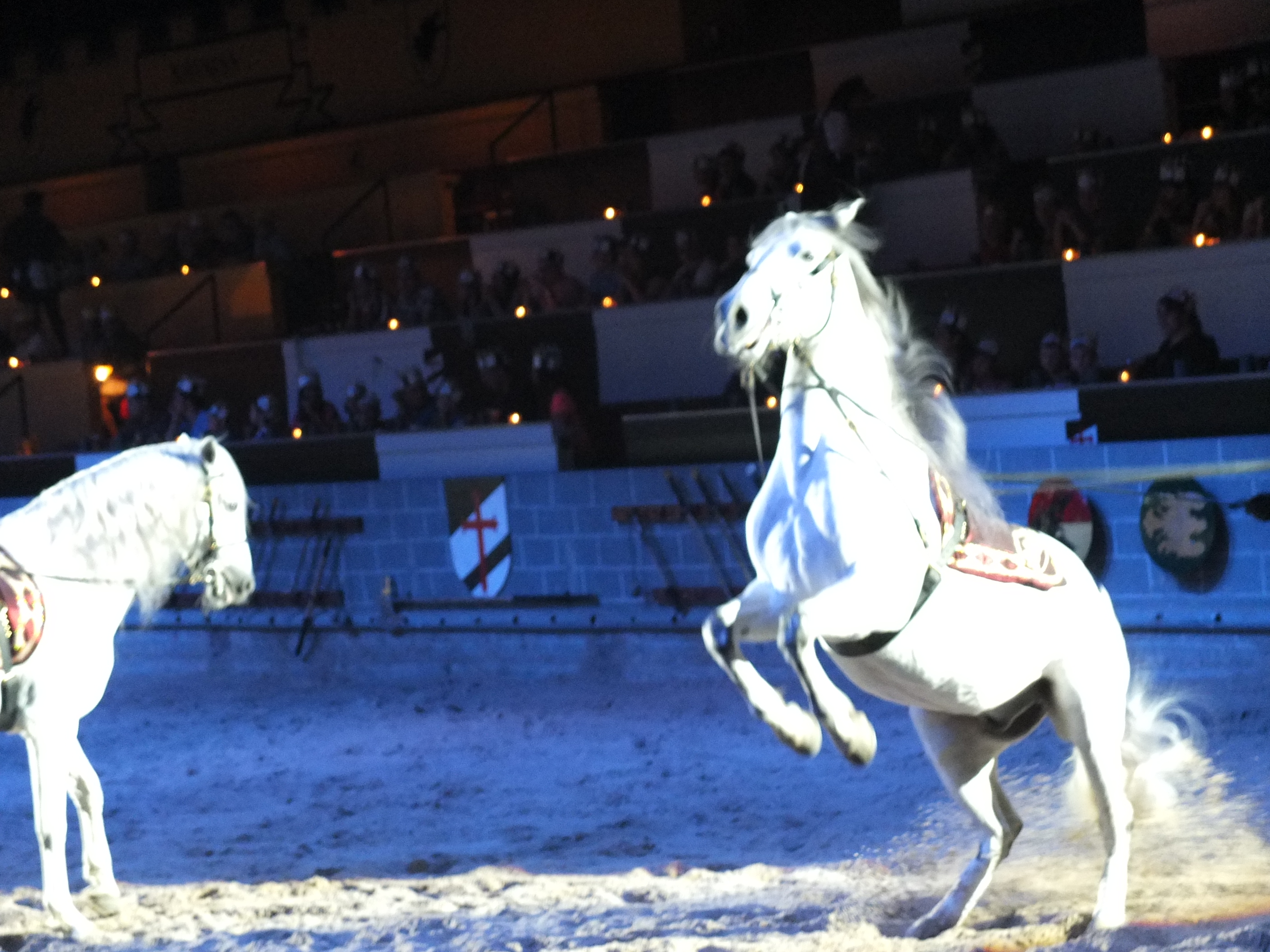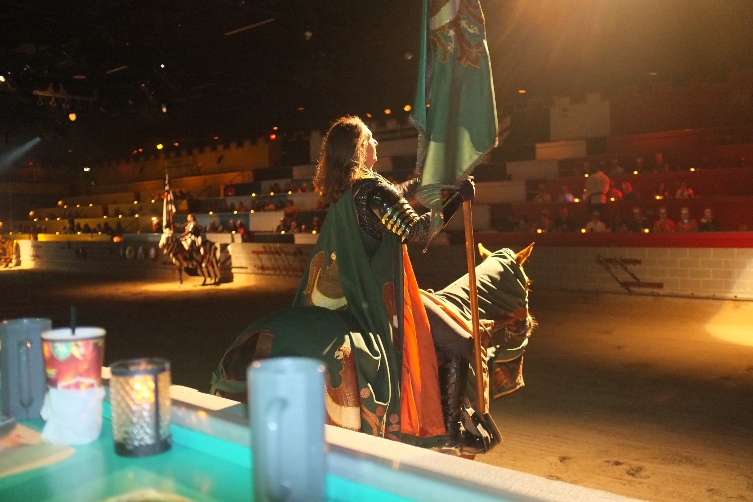 We have made reservations at The Medieval Times Dinner & Tournament at 6pm. There was a traffic congestion on our way there. We arrived at the Orlando castle, checked in and were assigned the Green table no. 1, which is the front row and given green crowns. This is a dinner show with 6 knights donning armour, clash in a jousting tournament for the title of King’s champion.