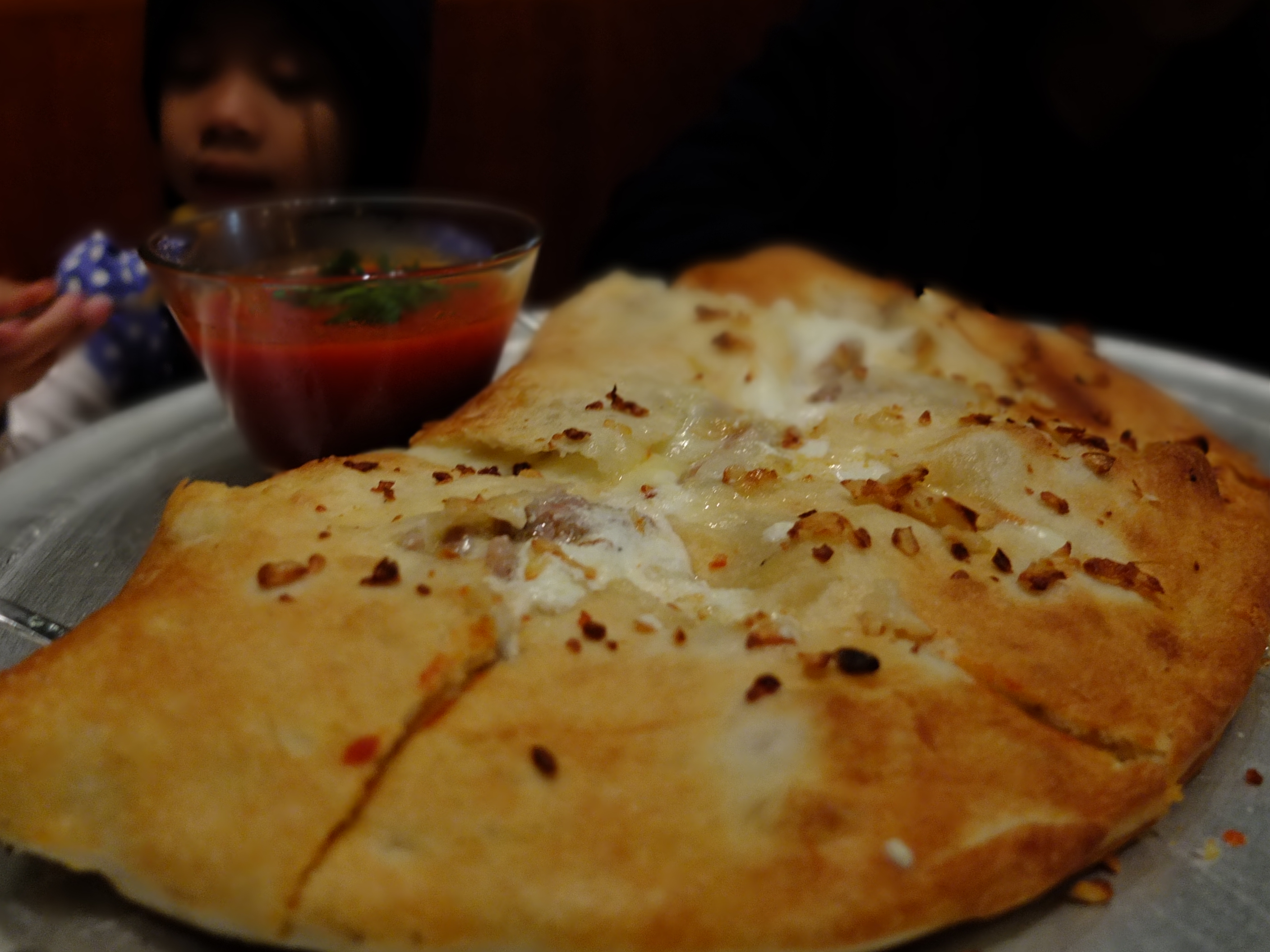 We headed back to John’s Pizzeria for brunch again as Ashley missed the Shirley Temple. This is our last opportunity to dine here as they will be closed at 4pm today and on Christmas day. As we walked on the street, the wind was chilly and Ashley complained that her cheeks were freezing. I was covering her cheeks with my hands to keep her warm. She was glad to be indoor when we reached the restaurant. We ordered the Baked Ziti and sides Sausage and Meatball. Since we had the pizza yesterday, we decided to try the Calzone with garlic sausage. Needless to mention, our drinks was a pitcher of Shirley Temple. While the pizza we had yesterday was good, the Calzone pales in comparison although the garlic sausage topping was good. We liked the meatball and concluded that if we should return, we would order the traditional pizza with meatball topping.