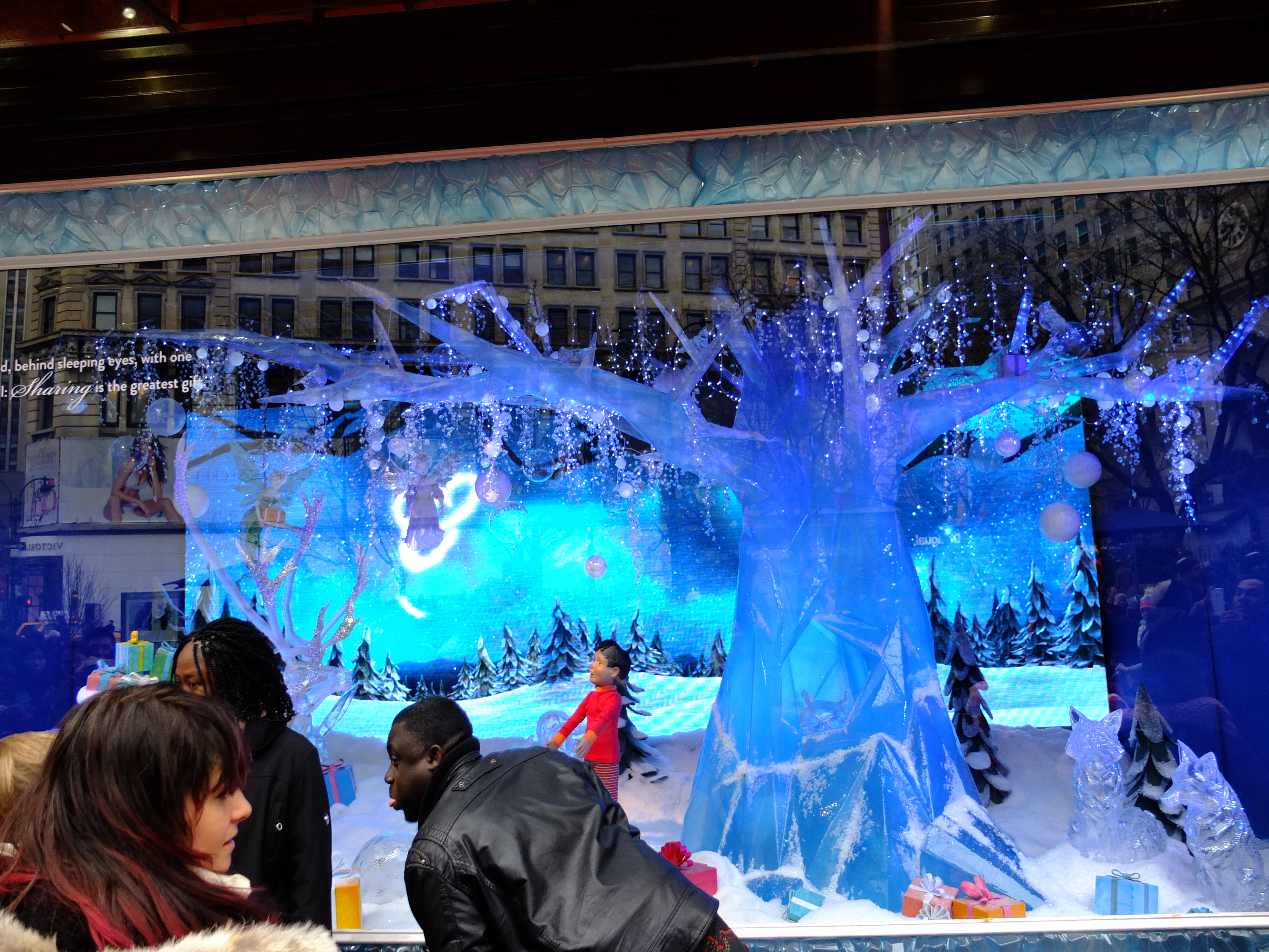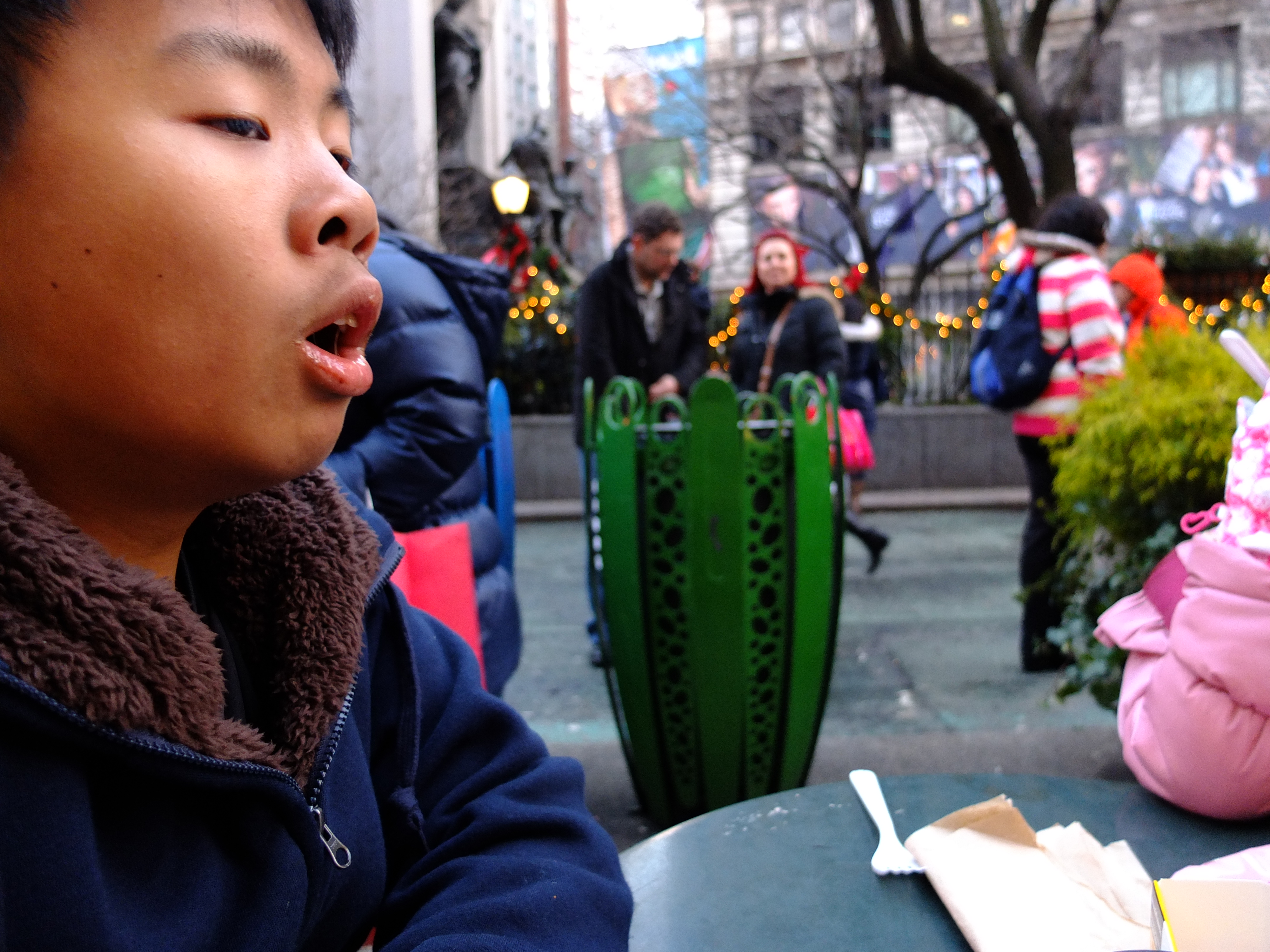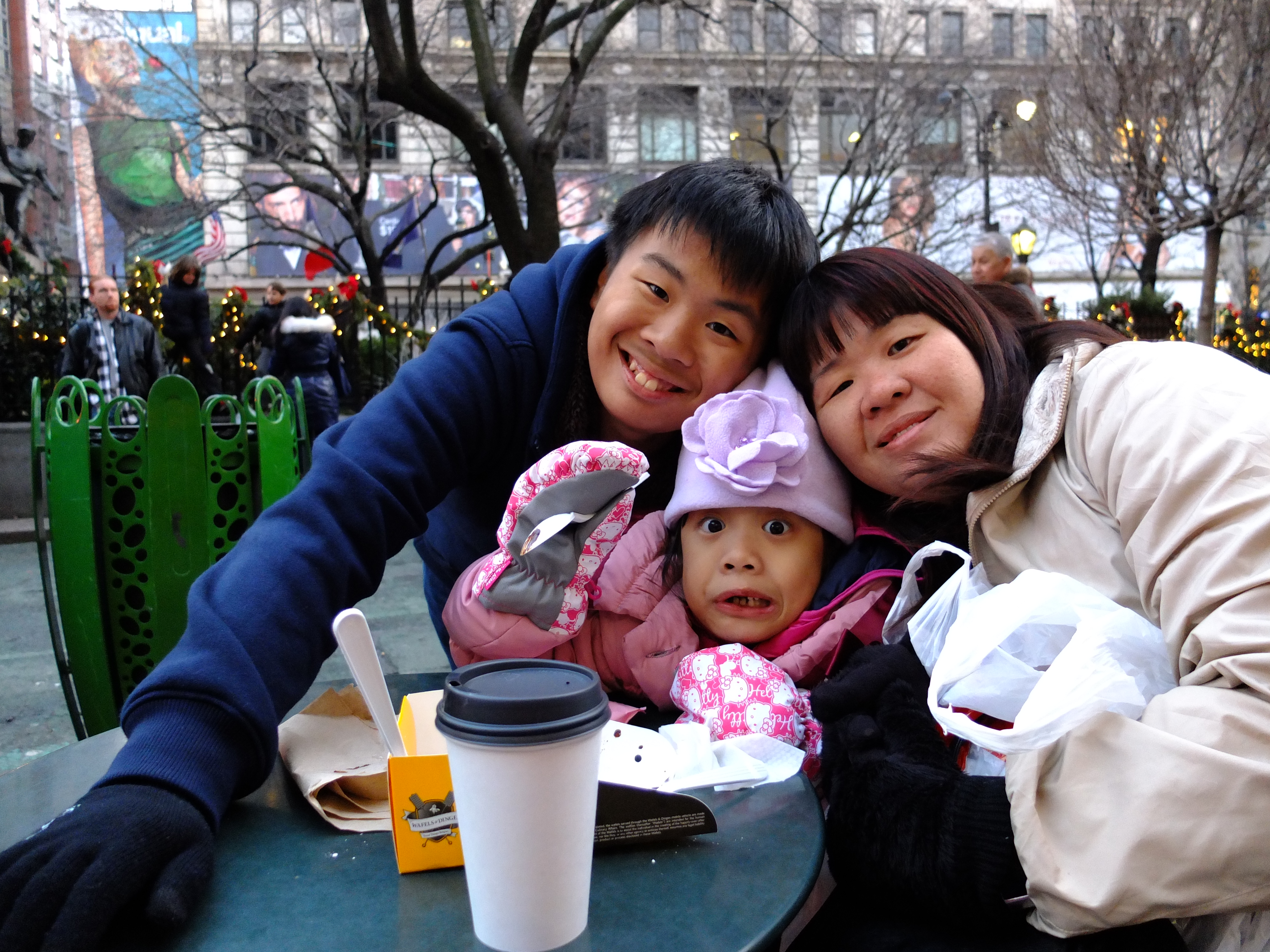 We left Macy’s and stopped outside for a snack. ZA bought Waffles with Ice Cream and Coffee from the Wafels & Dinges cart. The waffles tasted good and we enjoyed people watching from our table too. The snow did not happen and our dream of a White Christmas did not come true.