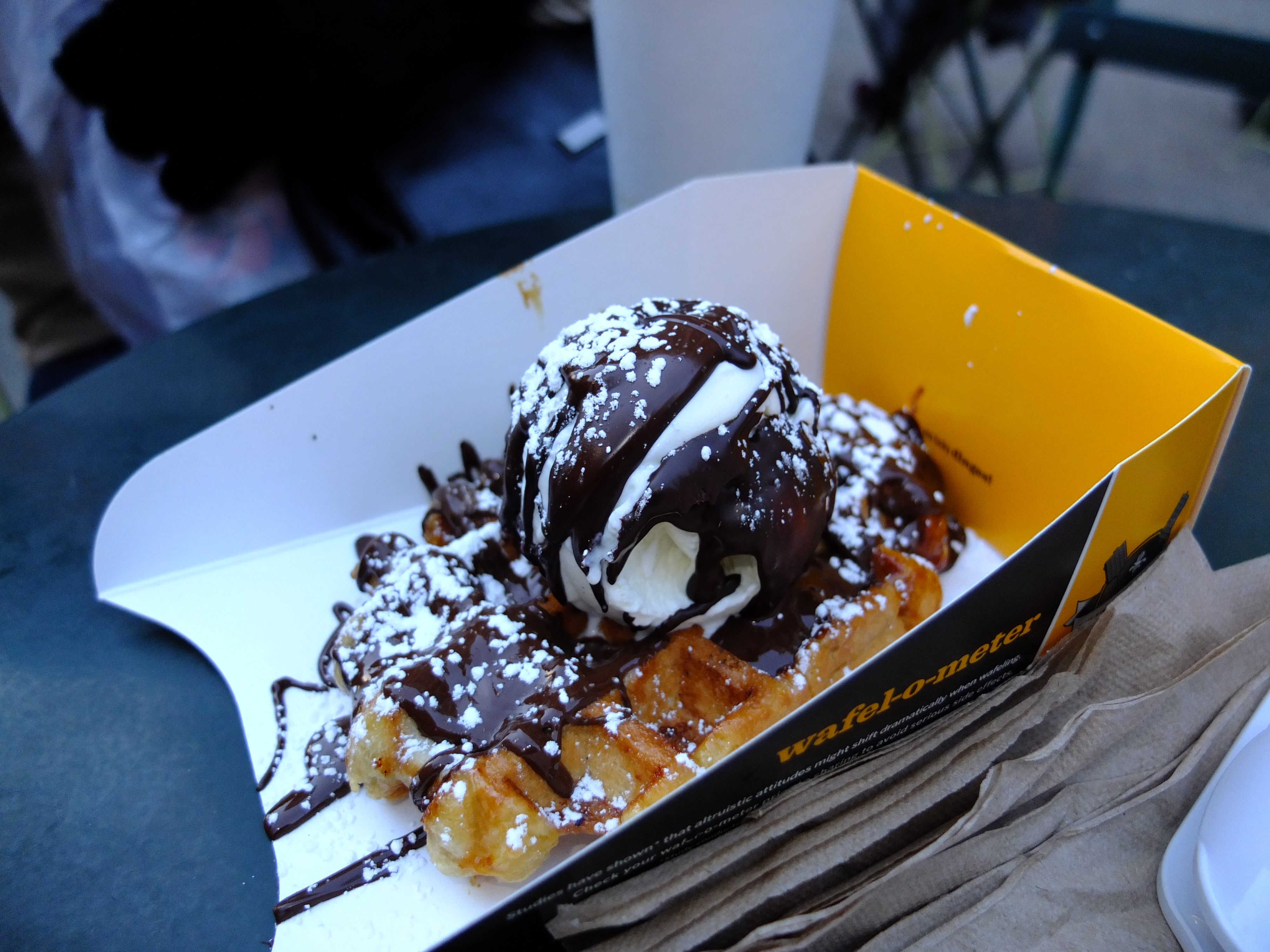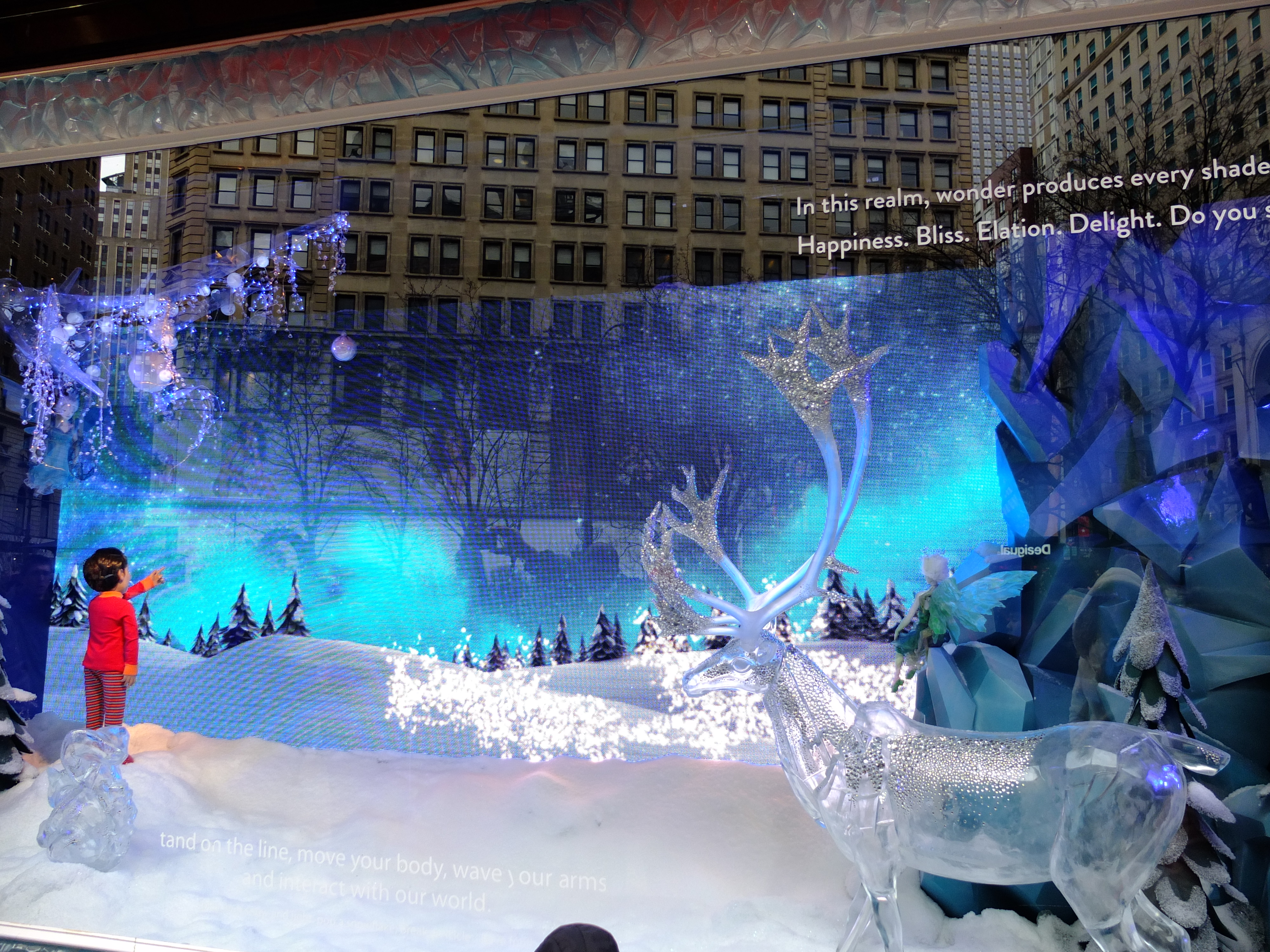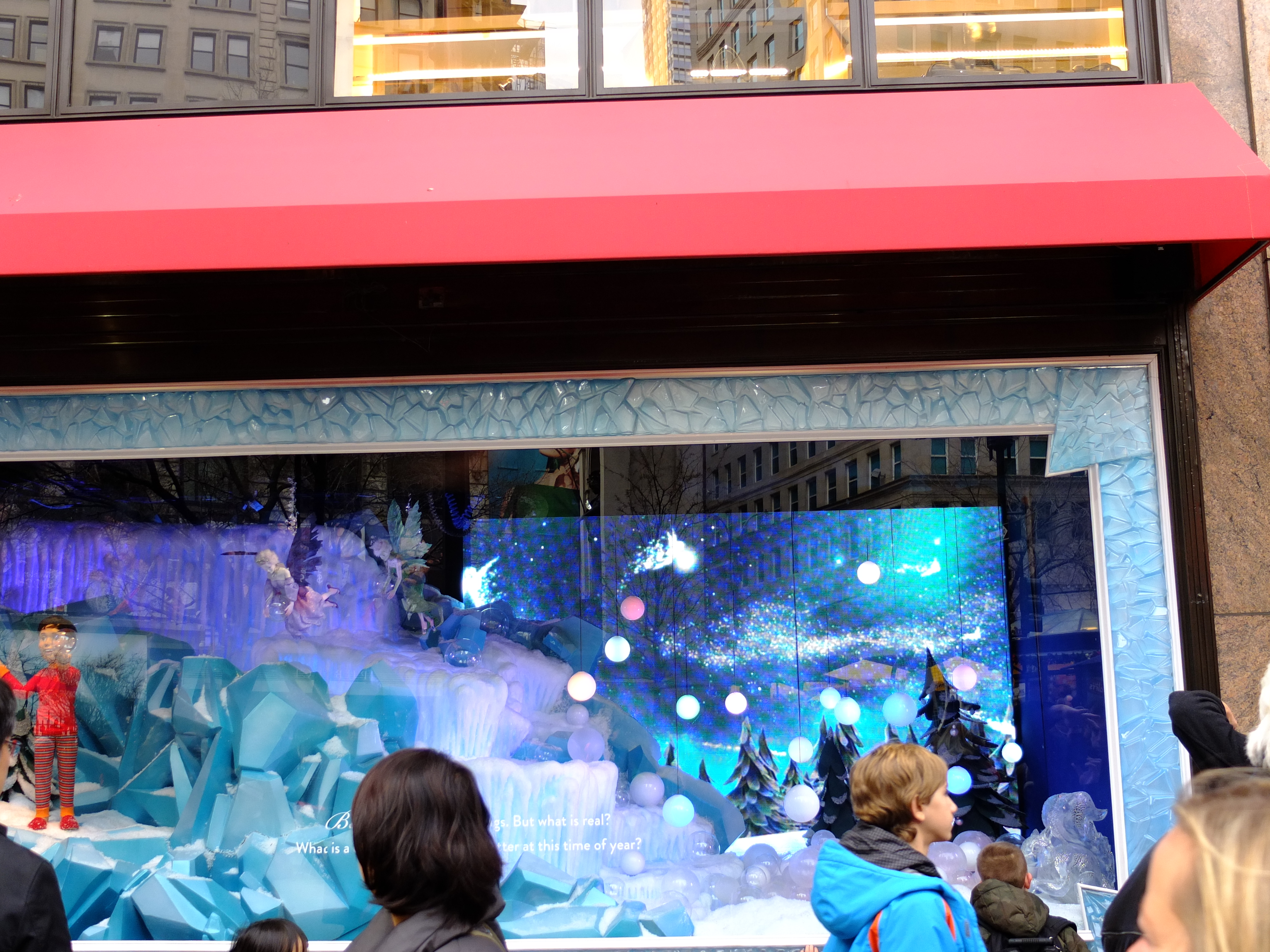 We left Macy’s and stopped outside for a snack. ZA bought Waffles with Ice Cream and Coffee from the Wafels & Dinges cart. The waffles tasted good and we enjoyed people watching from our table too. The snow did not happen and our dream of a White Christmas did not come true.