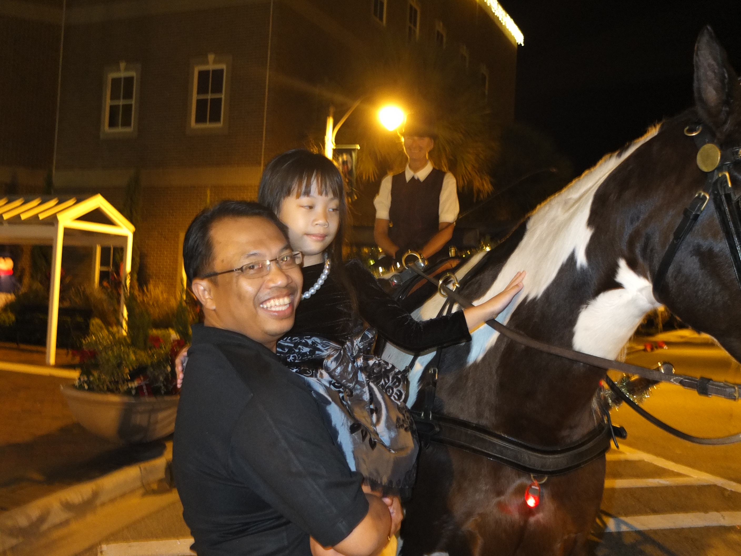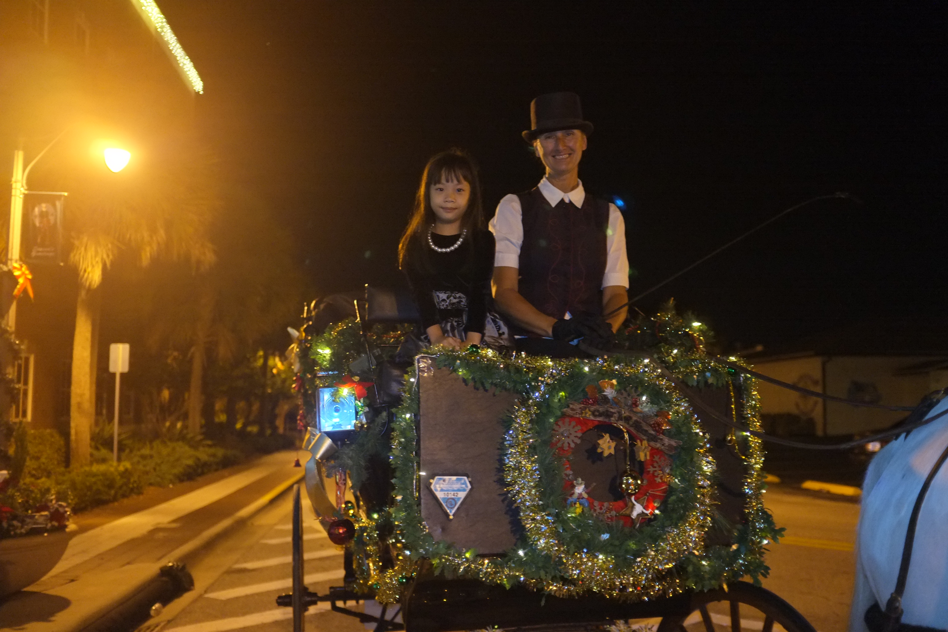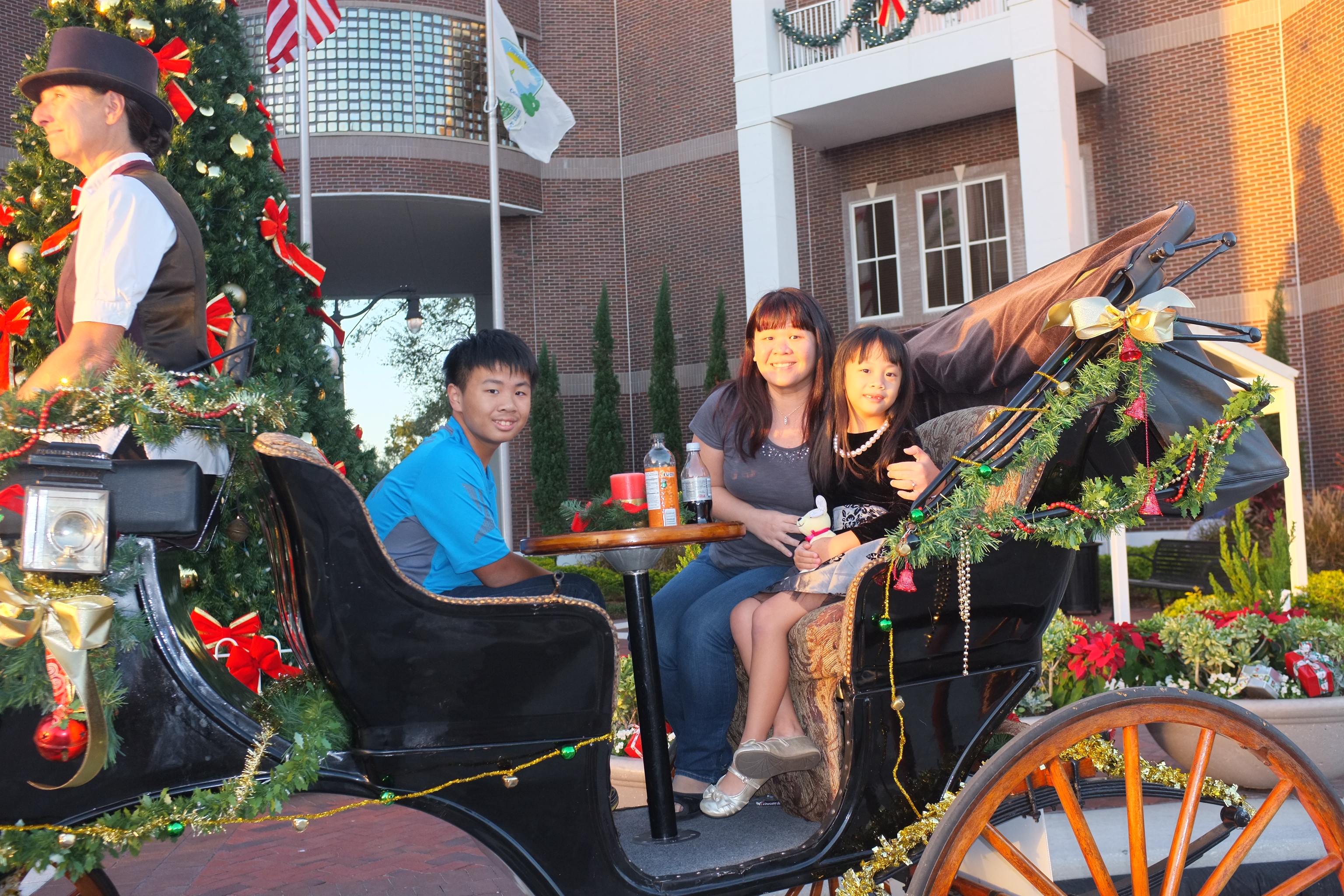 At 4.30pm, we set off to St Cloud, a city 30 miles from Orlando. We have booked a carriage ride with All Hitched Up for a sunset ride to Crabby Bill’s Seafood and thereafter, pick-up from the restaurant for the Christmas lights tour. When we arrived at the City Hall of St Cloud, we saw the horse drawn carriage pulling up. Teresa, the driver is friendly and introduced Coaster, the horse. Ashley was really excited! We took some pictures and are all set for the ride. The carriage itself is very comfortable and even has a small table with drink holders. The ride to the restaurant took us through an old charming neighbourhood. Everyone we met while we were on the carriage ride smiled and waved to us. The ride lasted about 15 minutes.