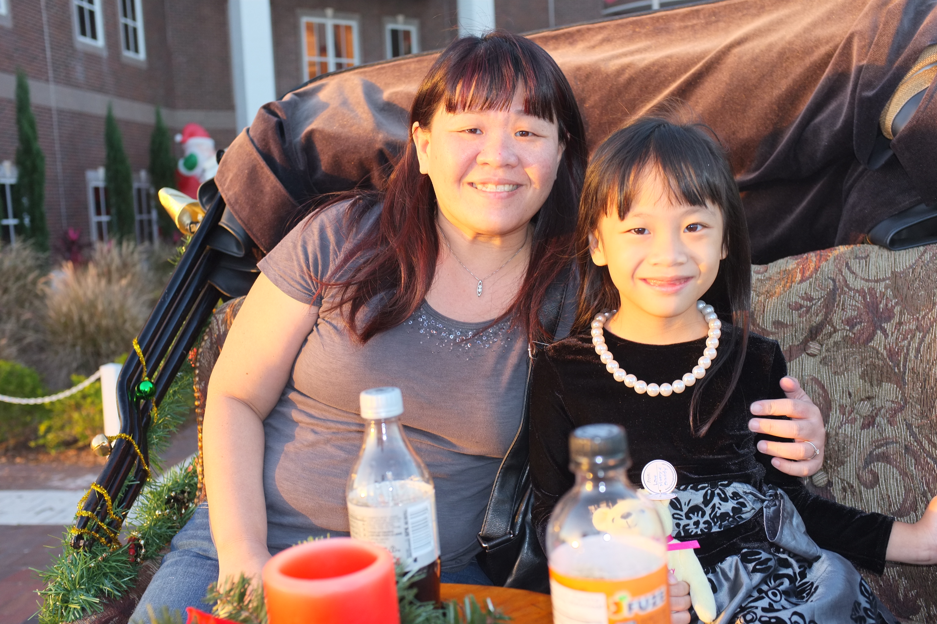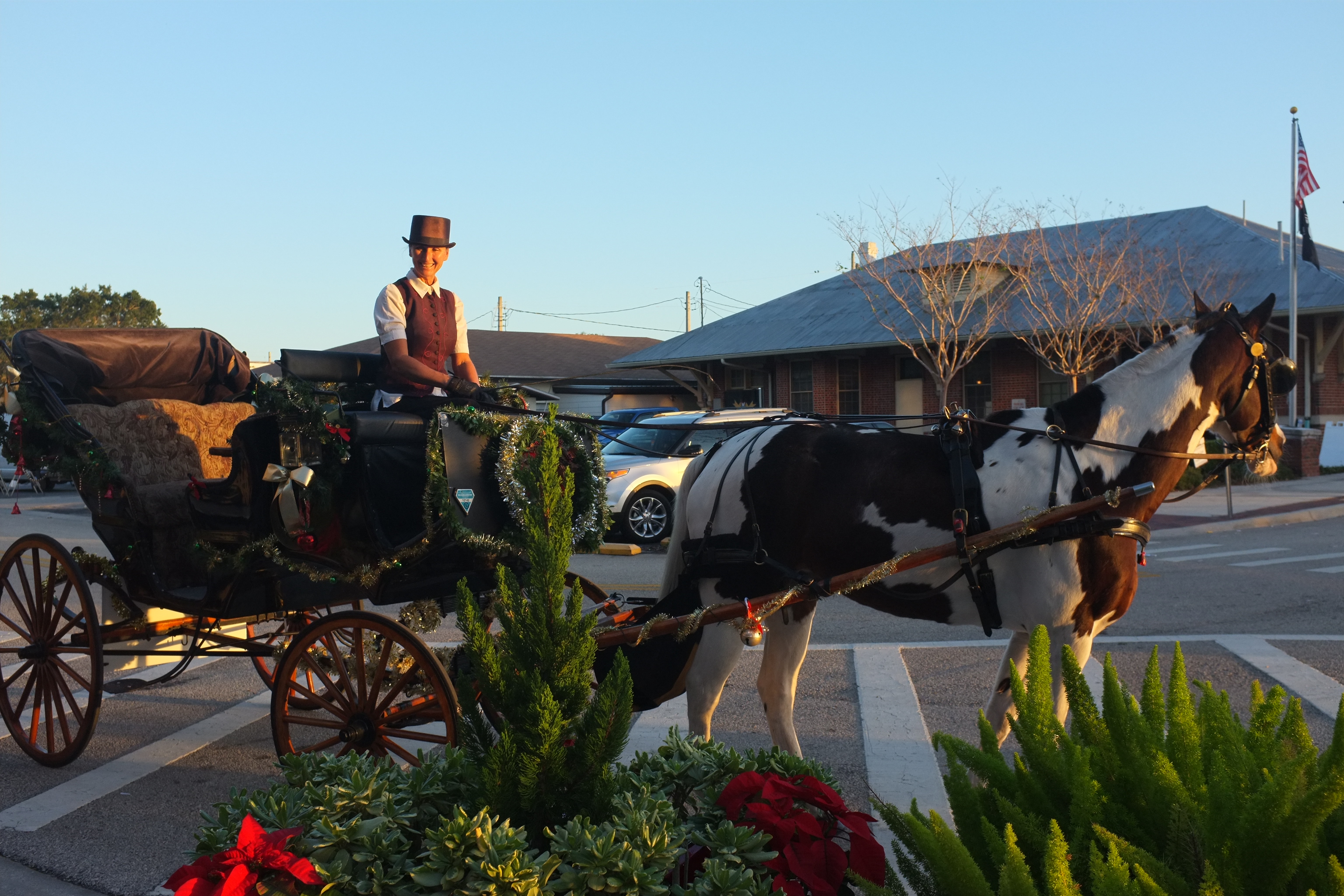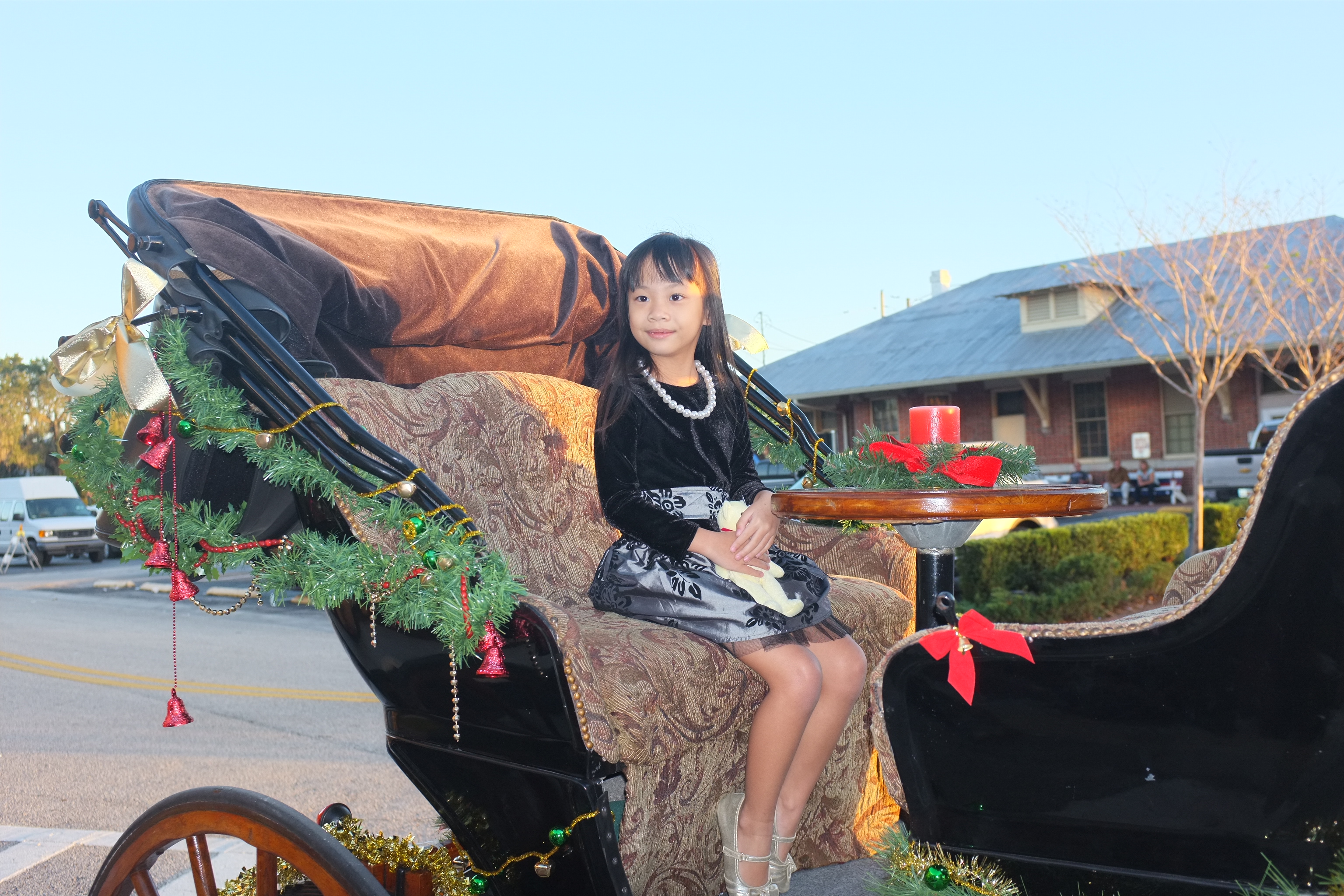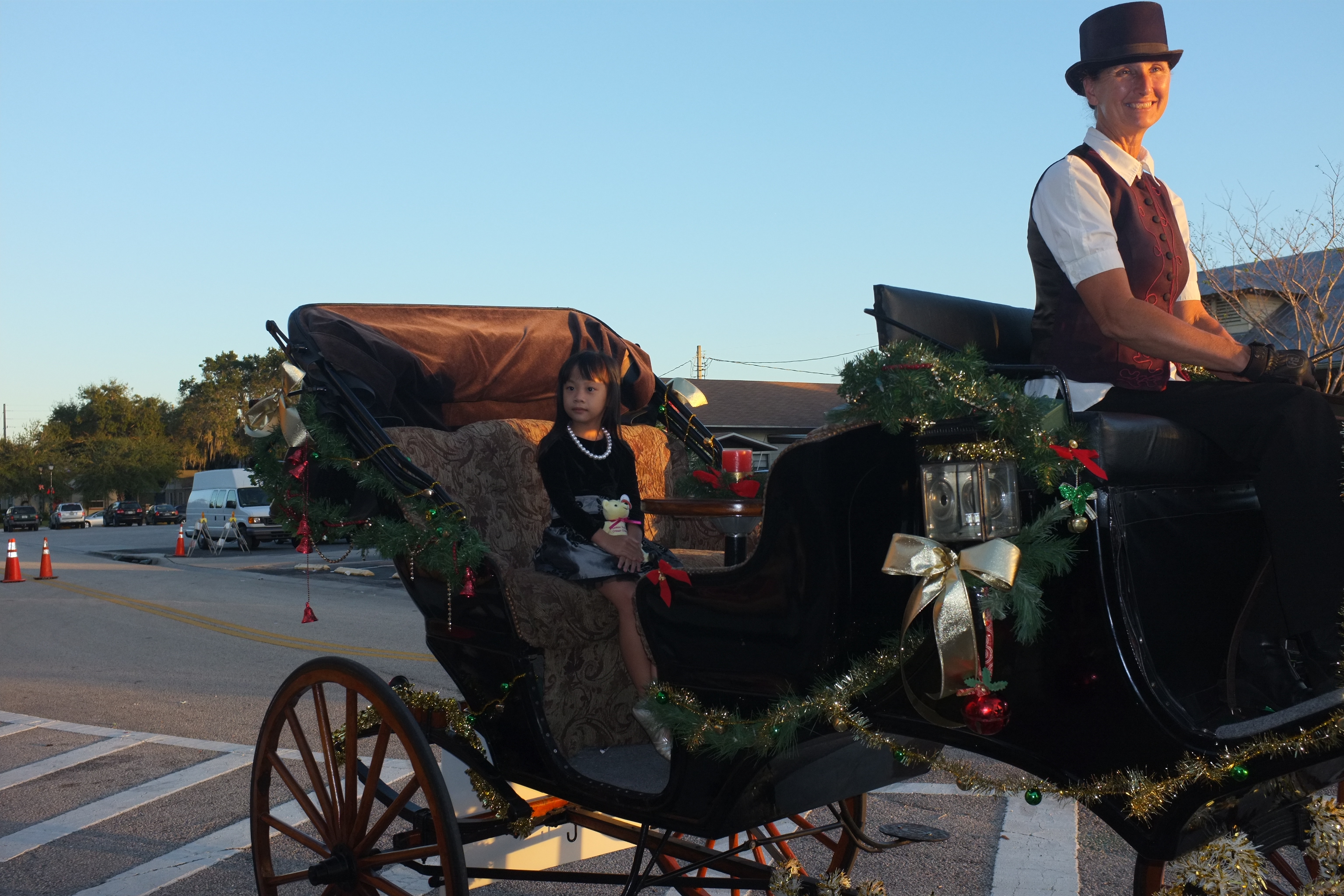 At 4.30pm, we set off to St Cloud, a city 30 miles from Orlando. We have booked a carriage ride with All Hitched Up for a sunset ride to Crabby Bill’s Seafood and thereafter, pick-up from the restaurant for the Christmas lights tour. When we arrived at the City Hall of St Cloud, we saw the horse drawn carriage pulling up. Teresa, the driver is friendly and introduced Coaster, the horse. Ashley was really excited! We took some pictures and are all set for the ride. The carriage itself is very comfortable and even has a small table with drink holders. The ride to the restaurant took us through an old charming neighbourhood. Everyone we met while we were on the carriage ride smiled and waved to us. The ride lasted about 15 minutes.