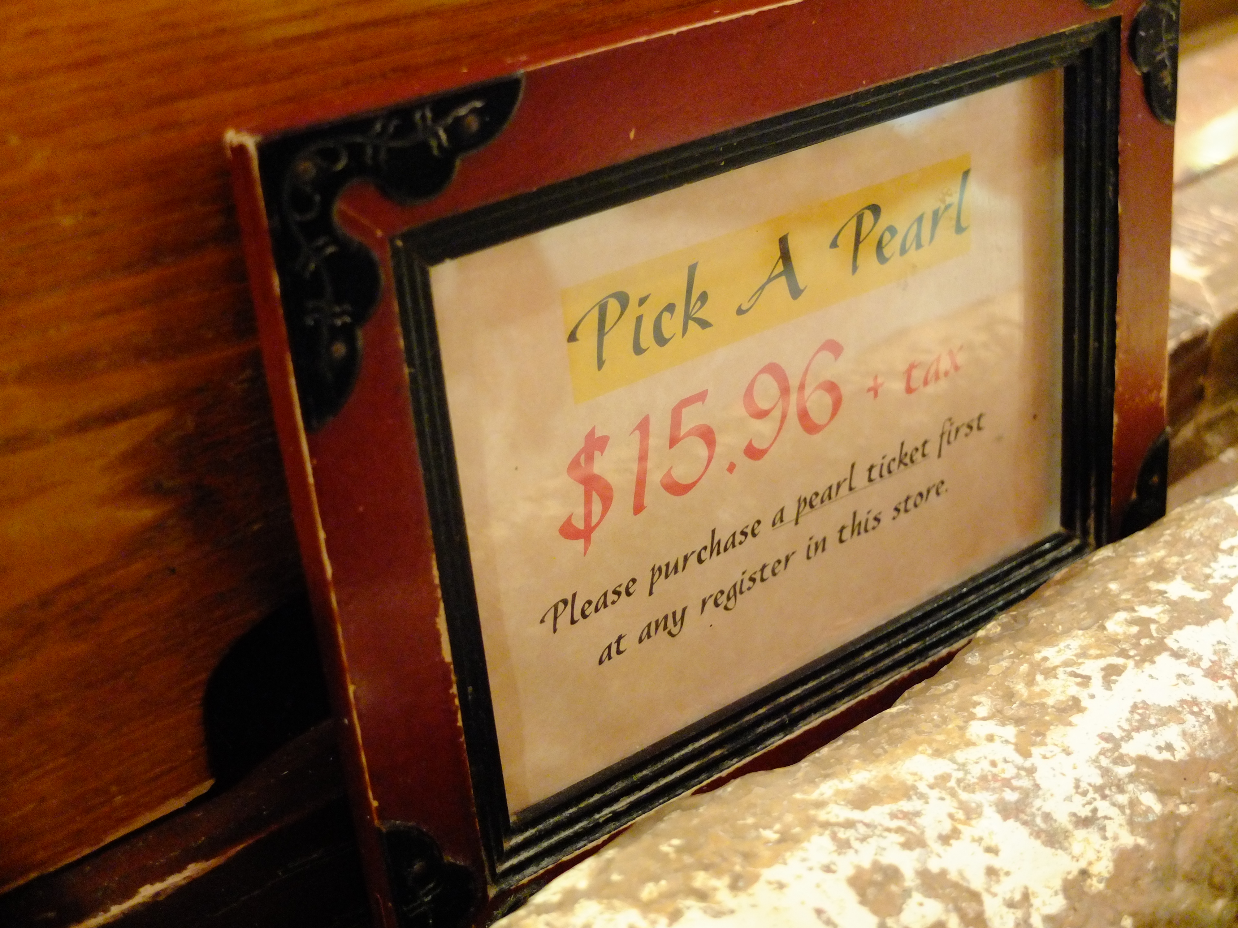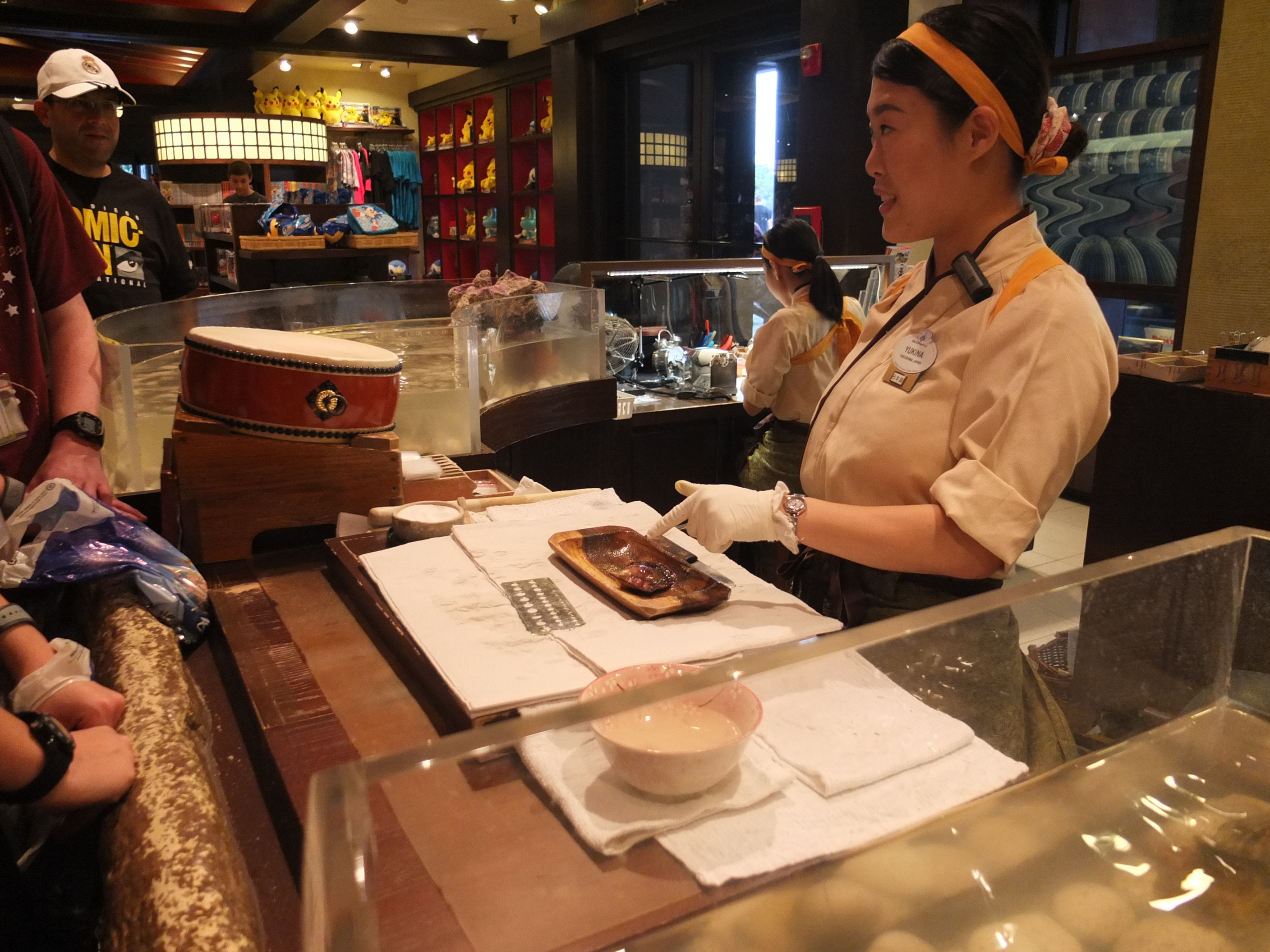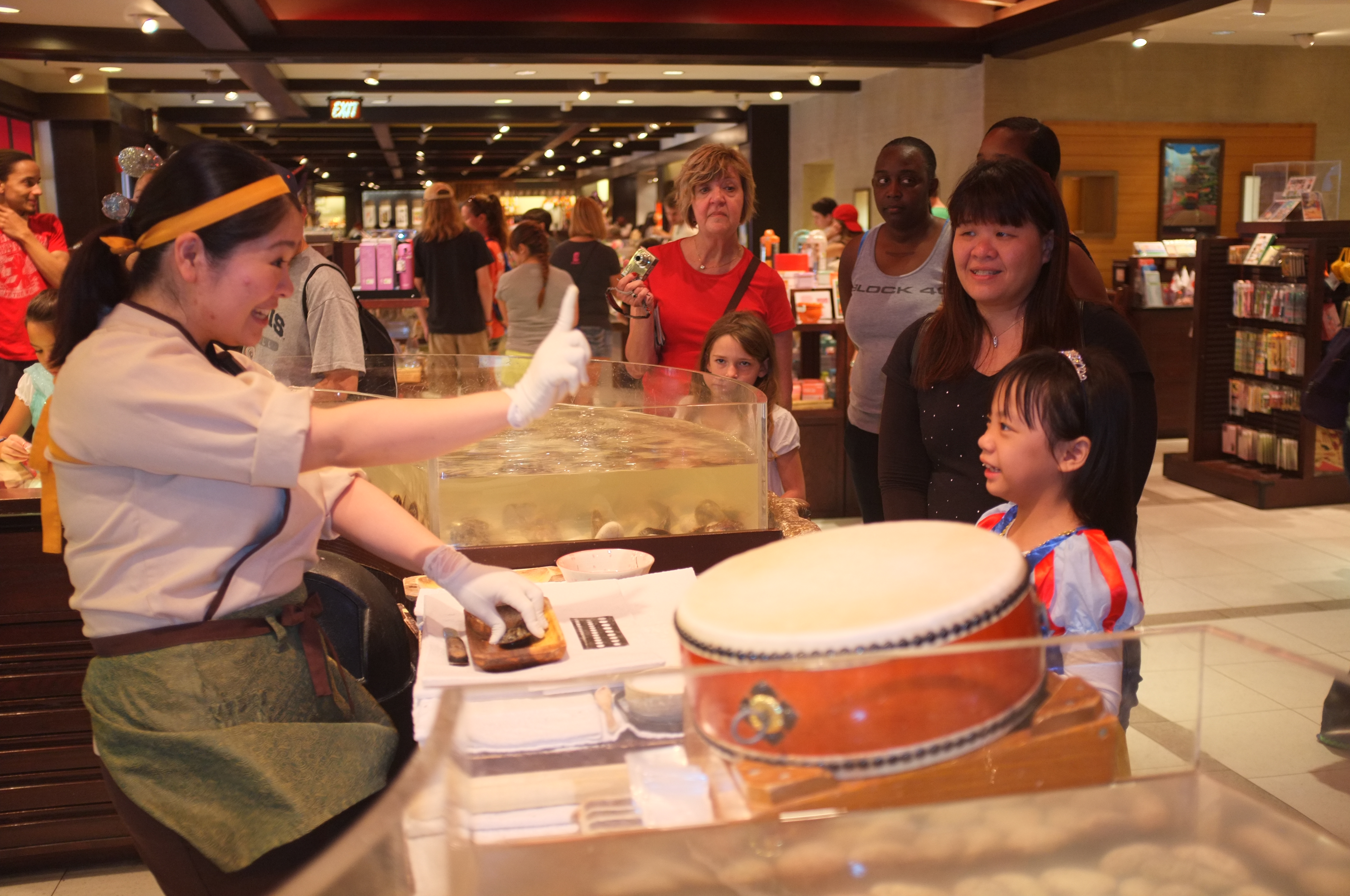 After lunch, we visited Mitsukoshi Store located in the Japan Pavillion. While Jarod was hunting for his anime stuffs, Ashley was immediately attracted by the Pick-A-Pearl station where the atmosphere was festive with lots of cheering and drum banging. There was a large, shallow tank of water with several oysters placed on the bottom. At the station, you get to choose an oyster and at the count of three to one in Japanese, the cast member cracks opens the oyster in front of you. Ashley was so amused by it so we purchased a ticket at the counter and she picked an oyster. Ashley then began her countdown ‘San, Nin, Ichi’ and out came her whitish pearl! The cast member measured the pearl, which was a size 7. She then cleaned and displayed the pearl in a dish filled with a white sandy salt. She told us this was good for the pearl. She banged her drum and everyone cheered as she shouted how lucky we are! Ashley could not contain her excitement as she headed over to the jewelry counter to have her pearl mounted to a piece of jewelry. She had been eyeing a heart shaped pendant and settled for it together with a necklace. We would have to come back in 2 hours time to pick it up.