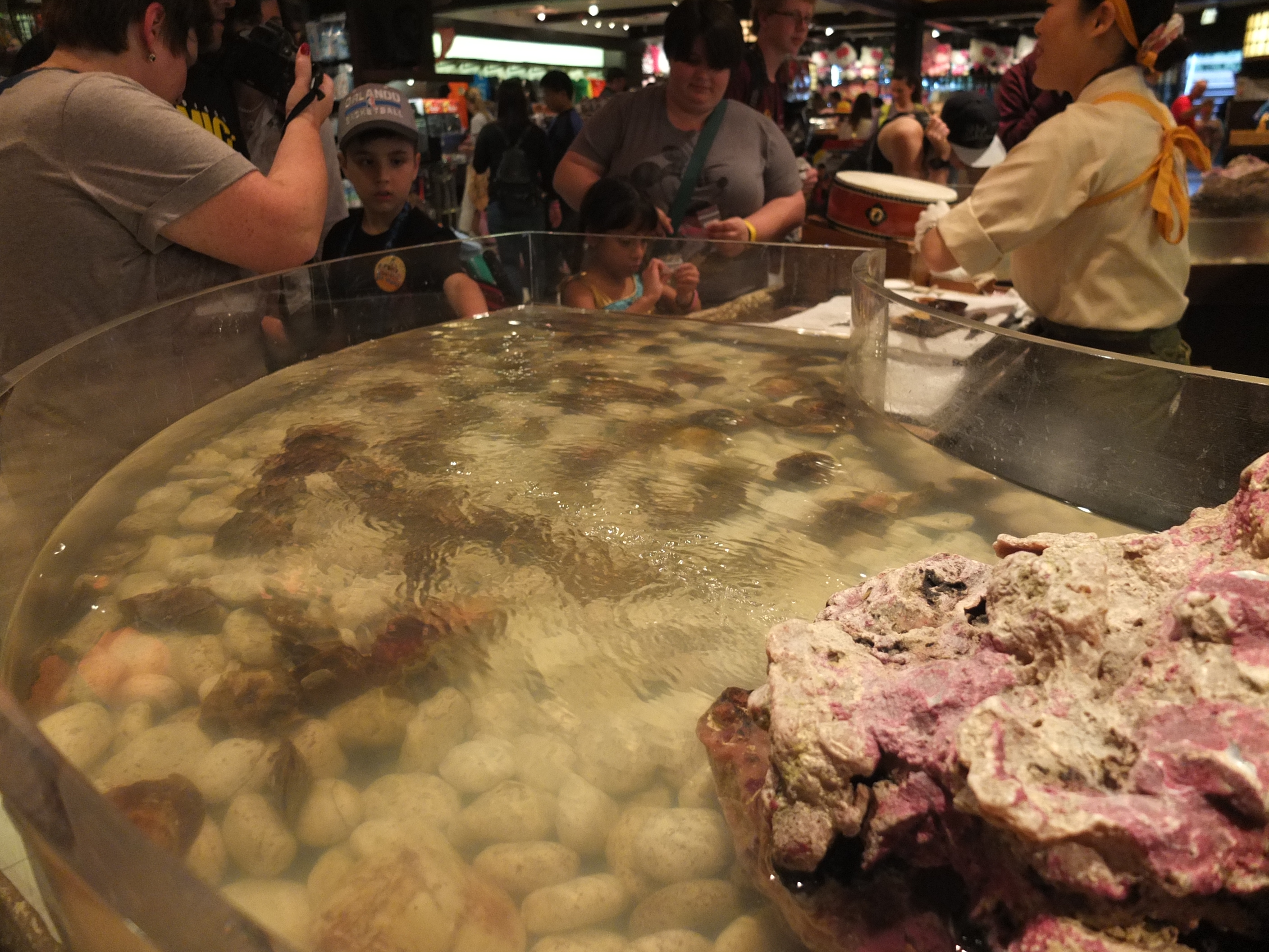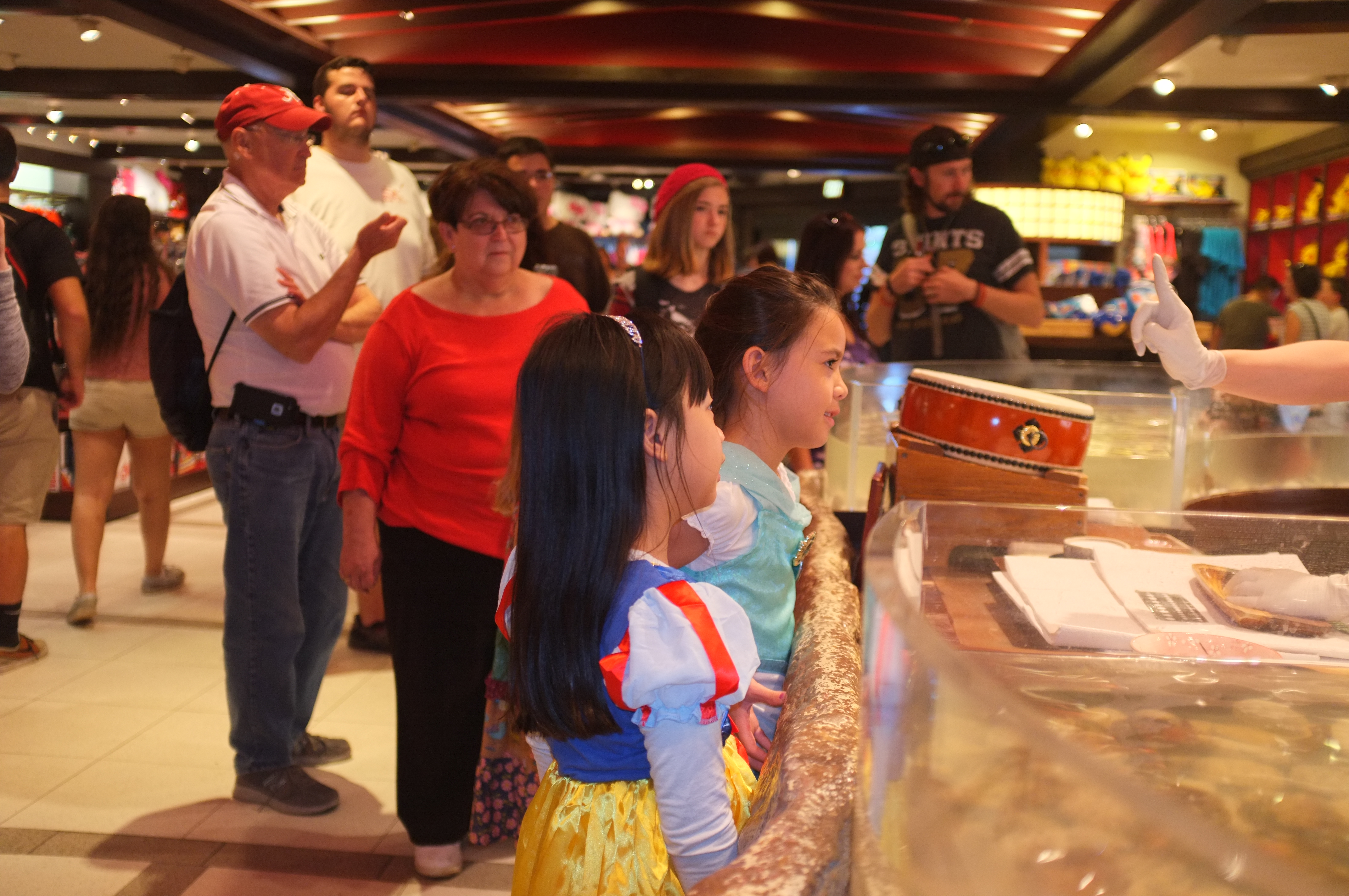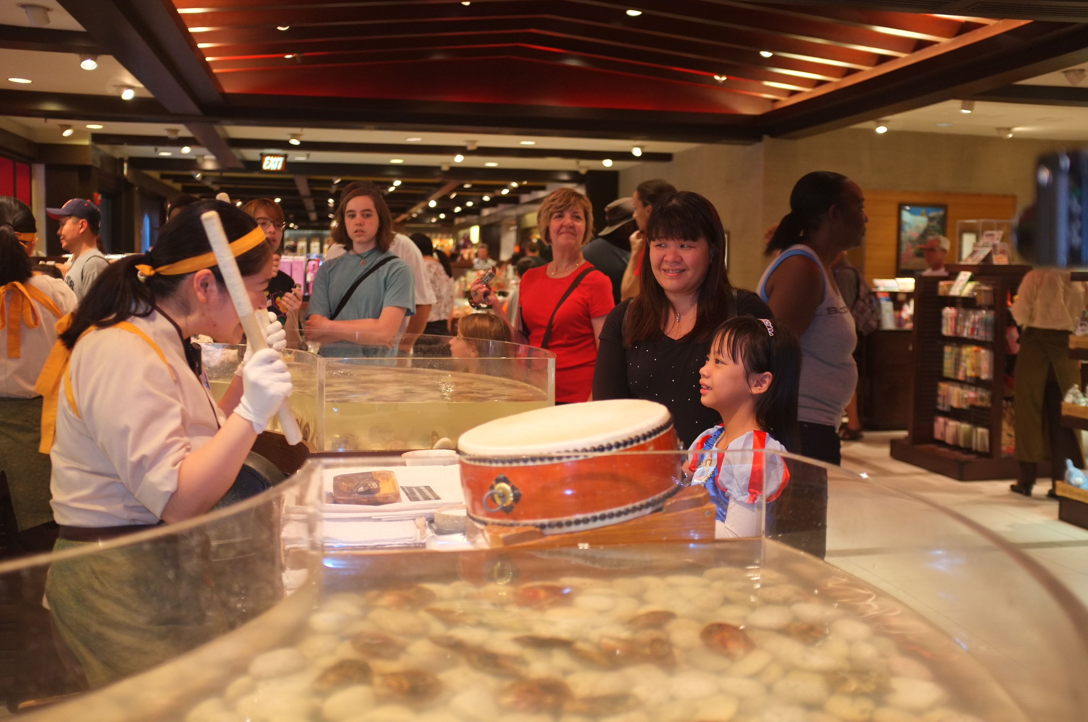 After lunch, we visited Mitsukoshi Store located in the Japan Pavillion. While Jarod was hunting for his anime stuffs, Ashley was immediately attracted by the Pick-A-Pearl station where the atmosphere was festive with lots of cheering and drum banging. There was a large, shallow tank of water with several oysters placed on the bottom. At the station, you get to choose an oyster and at the count of three to one in Japanese, the cast member cracks opens the oyster in front of you. Ashley was so amused by it so we purchased a ticket at the counter and she picked an oyster. Ashley then began her countdown ‘San, Nin, Ichi’ and out came her whitish pearl! The cast member measured the pearl, which was a size 7. She then cleaned and displayed the pearl in a dish filled with a white sandy salt. She told us this was good for the pearl. She banged her drum and everyone cheered as she shouted how lucky we are! Ashley could not contain her excitement as she headed over to the jewelry counter to have her pearl mounted to a piece of jewelry. She had been eyeing a heart shaped pendant and settled for it together with a necklace. We would have to come back in 2 hours time to pick it up.