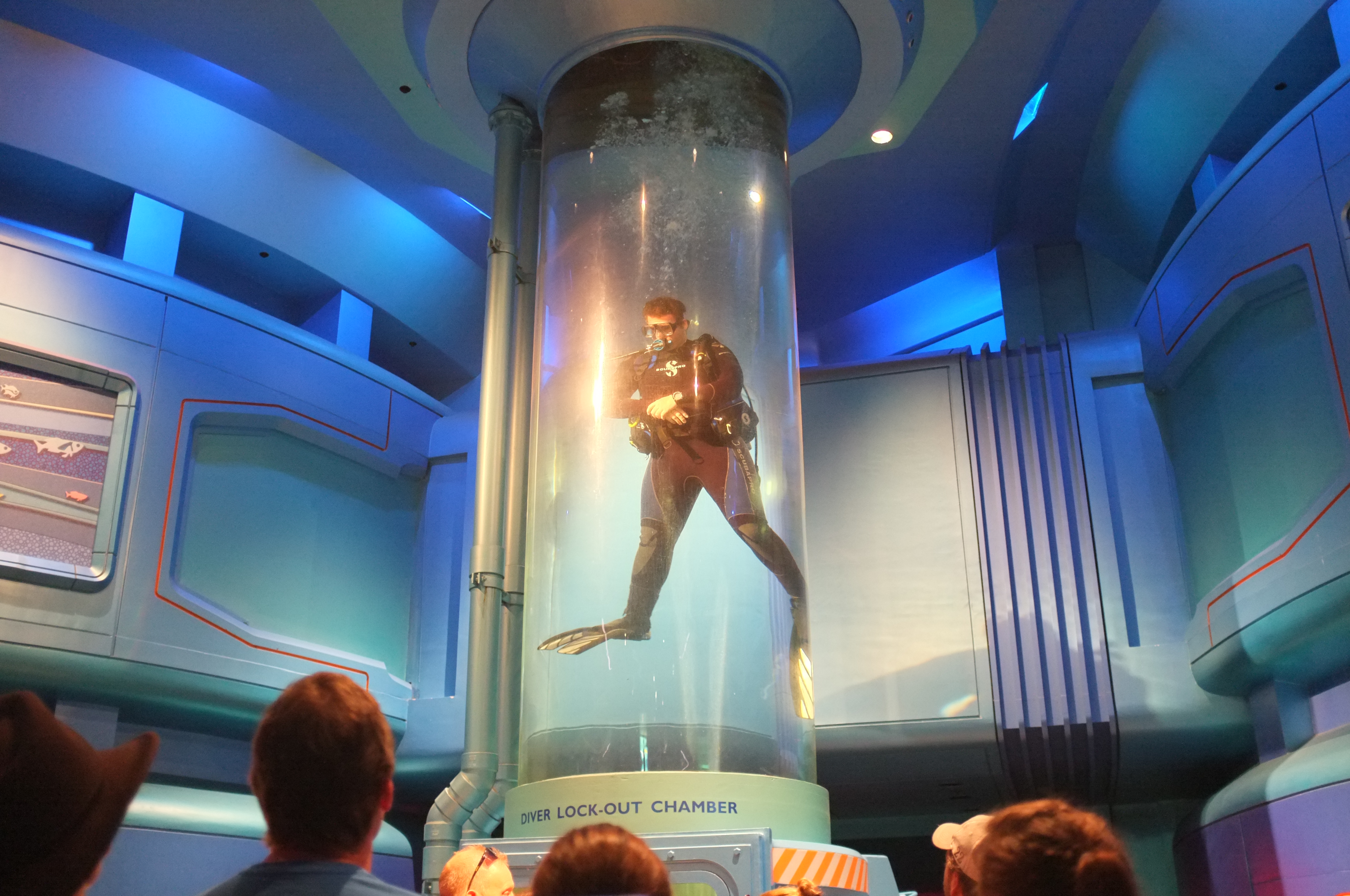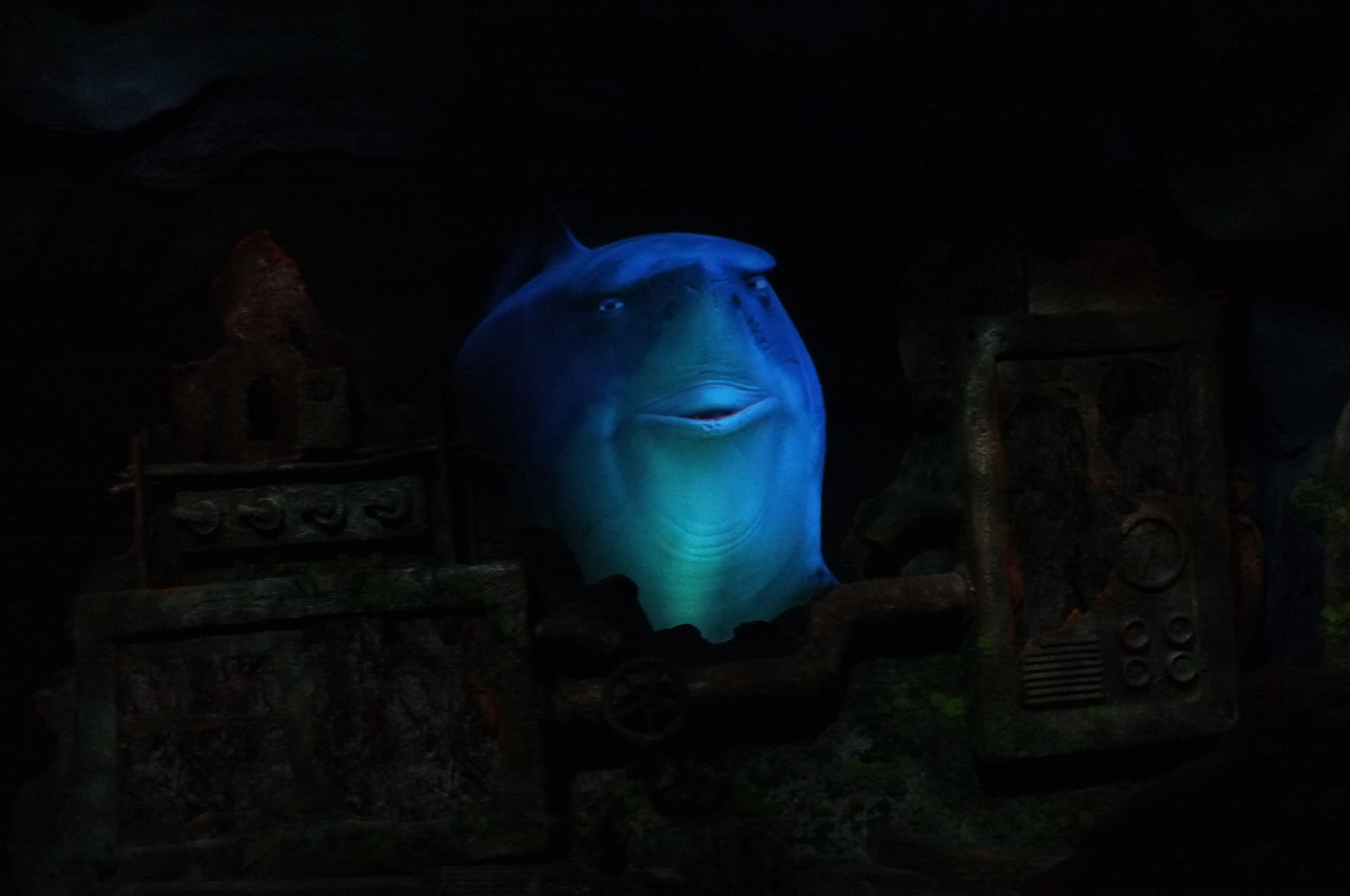 Our next ride was The Seas with Nemo & Friends. This is a high-tech ride featuring characters from the animated hit Finding Nemo. We boarded a “clamobile” and descended below the waves into a “Big Blue World” where Nemo and his friends flit through brightly colored coral reefs and gently swaying sea anemones. The attraction features technology that makes it seem as if the animated characters are swimming with live fish. It was very cool. After the ride, we walked around the massive 5.7-million-gallon saltwater aquarium filled with marine life and some of the real-life counterparts of the characters from the film.