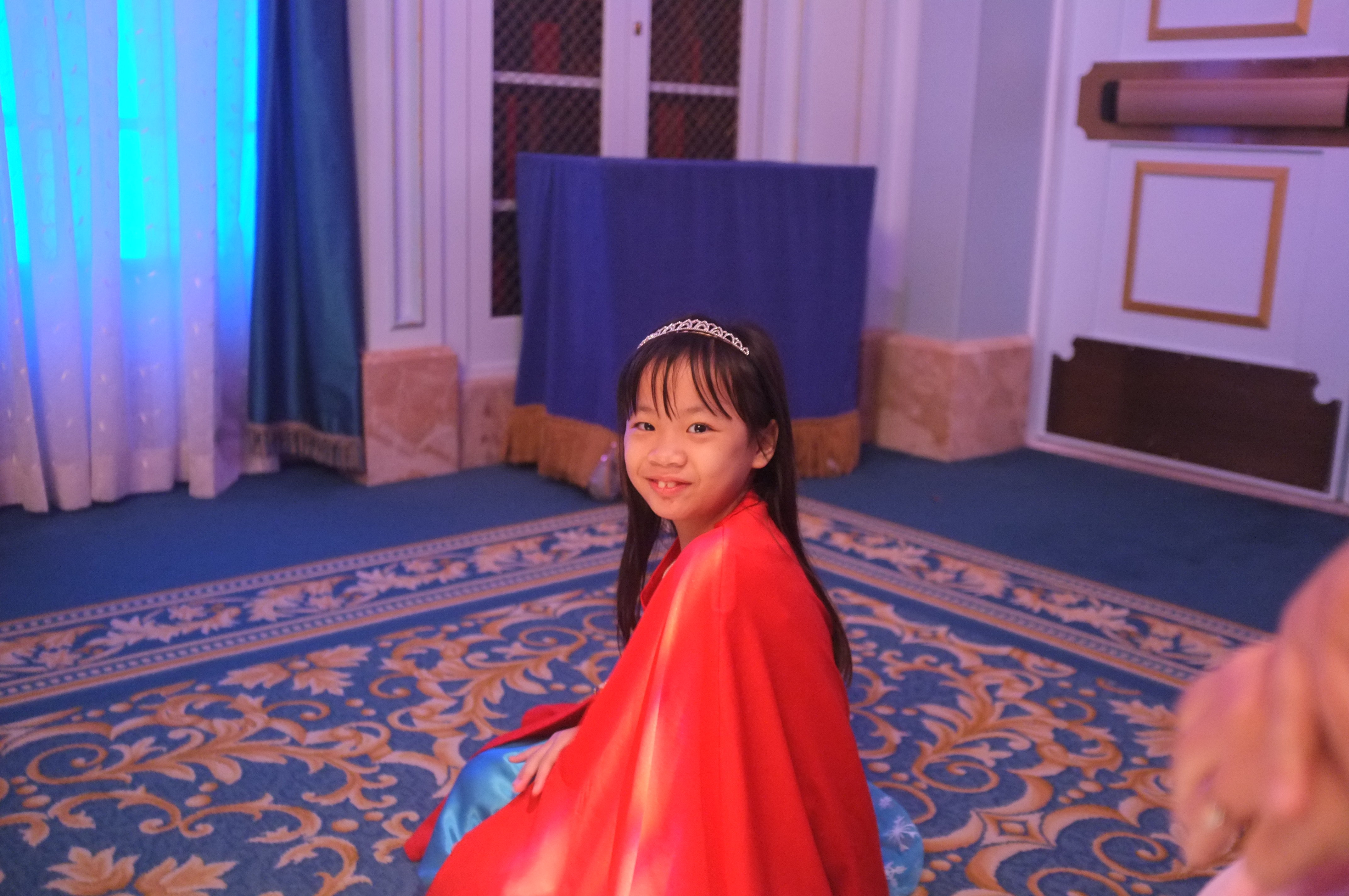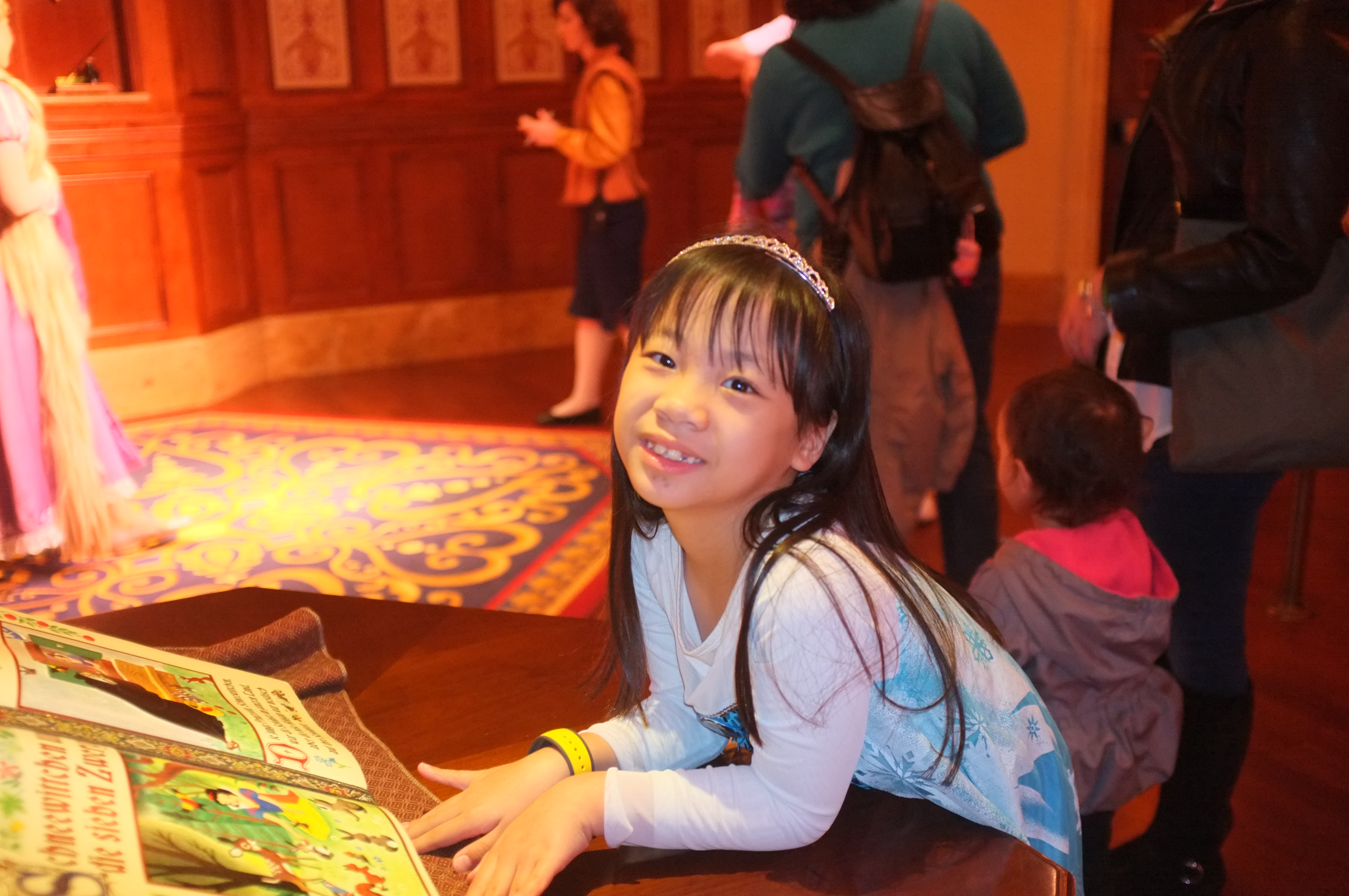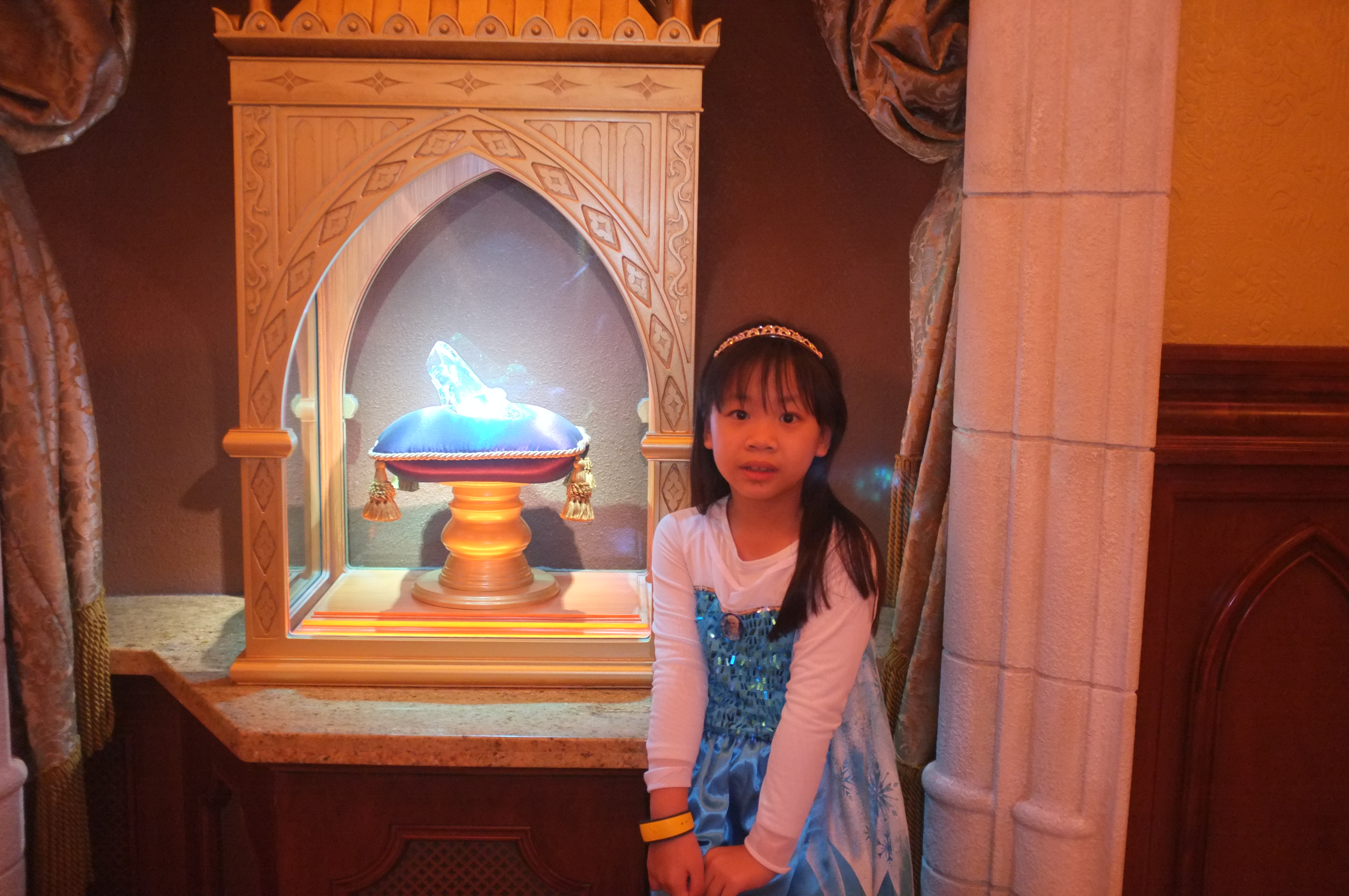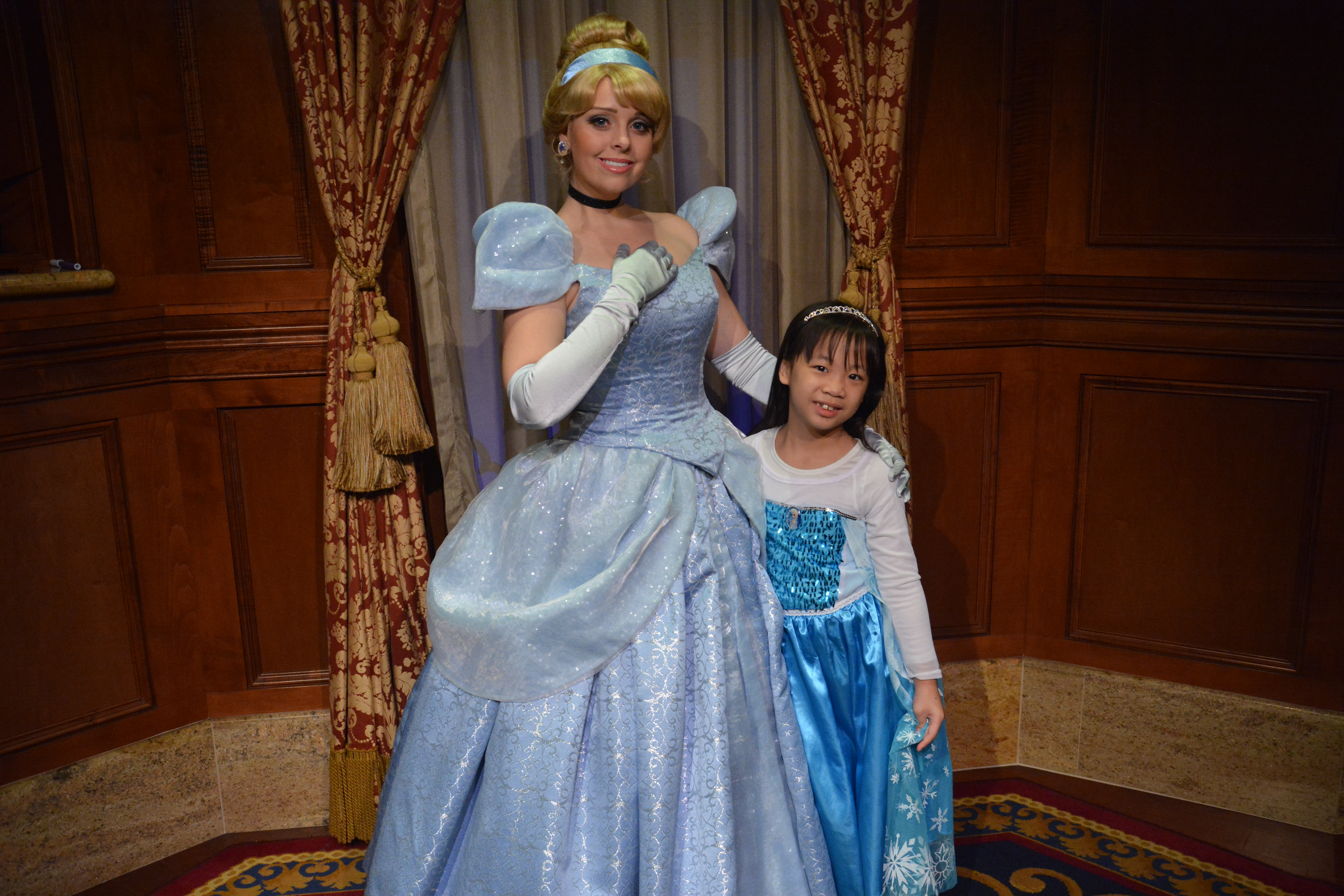 It was time to head towards the Princess Fairytale Hall. According to the hall’s storyline, Princess Fairytale Hall is a gift from the King to Cinderella, and acts as a place where she and other princesses can greet subjects. Stone walls, ornate chandeliers, and plenty of princess portraits line the walls of Princess Fairytale Hall. Here, you can get to meet Cinderella and Rapunzel or Anna and Elsa. It was clear who the popular princessses were, with Cinderella and Rapunzel only having a 20 minute wait while the posted wait time Anna and Elsa was 100 minutes.We stood in line first for Cinderella and Rapunzel. Before arriving into the princess chamber, we marveled at Cinderella’s glass slipper, glimmering brightly before we were ushered into the royal chambers. Ashley enjoyed talking to both the princesses and had photos with them.