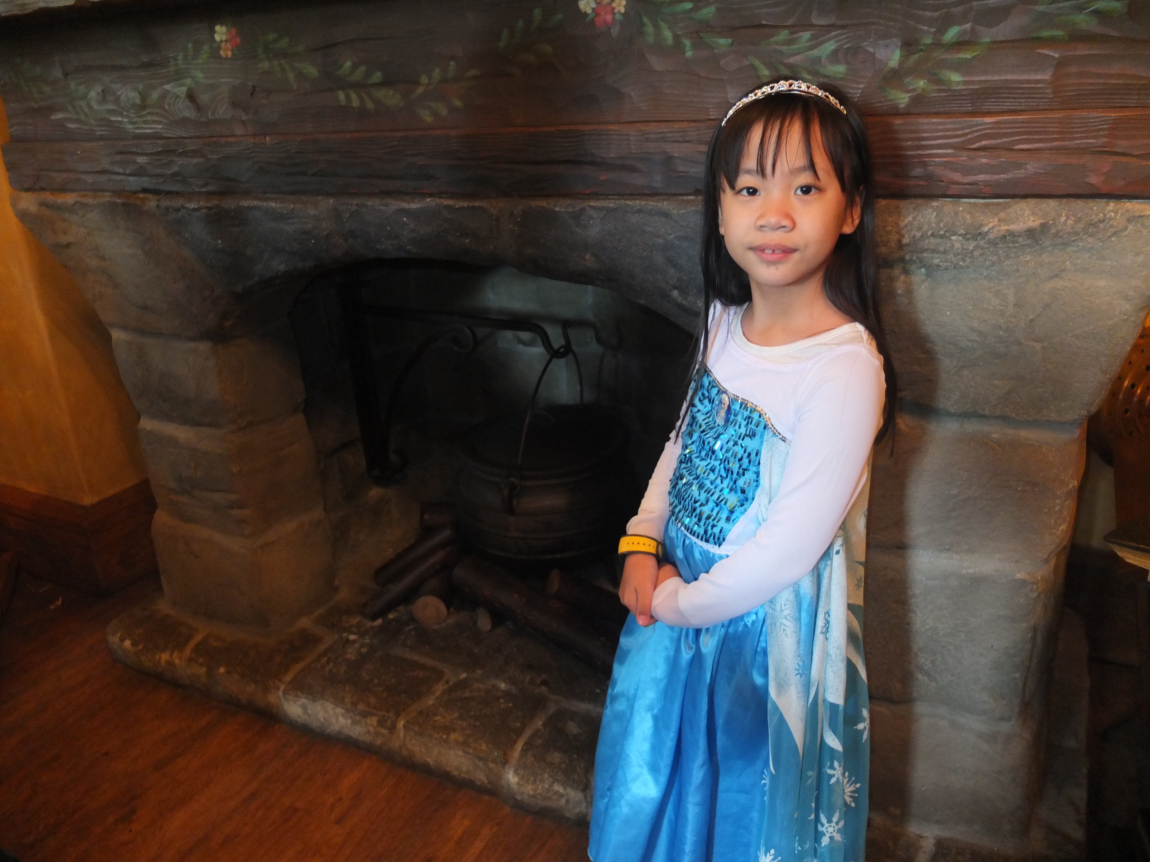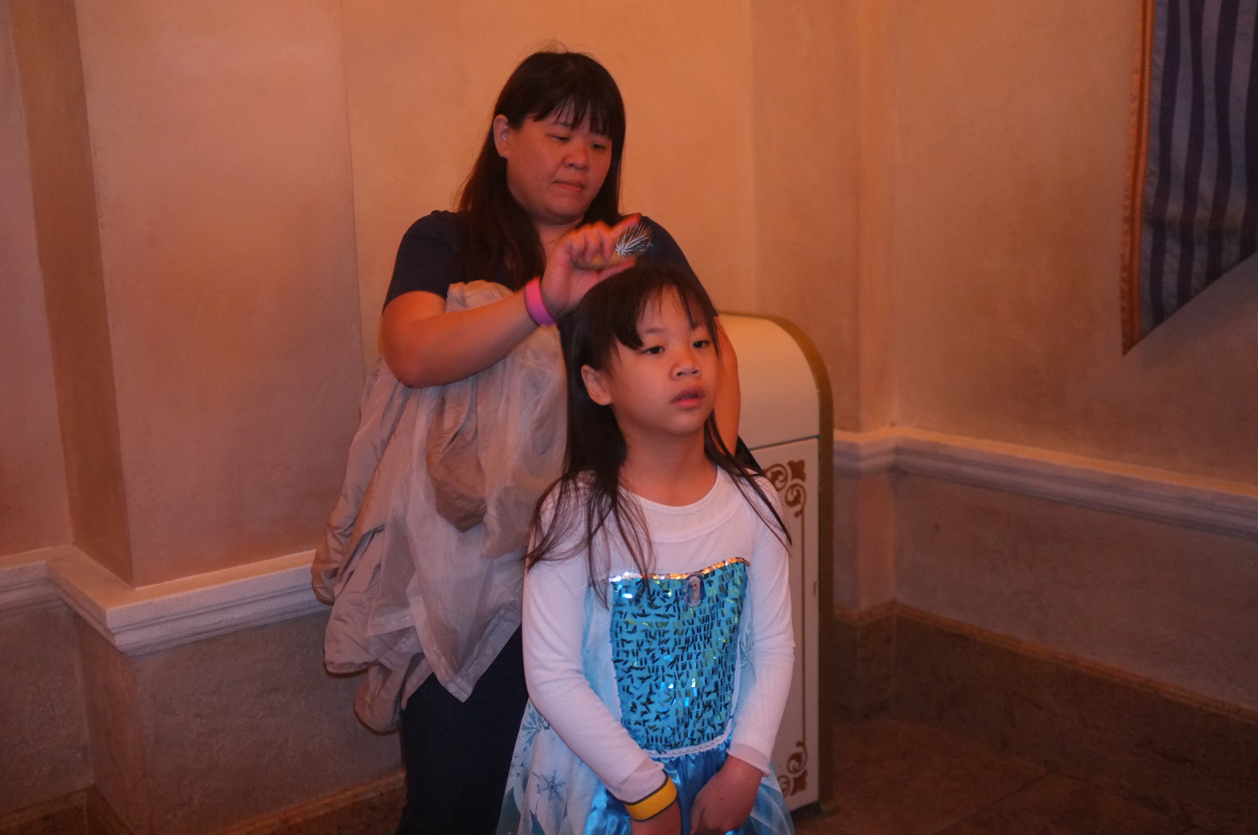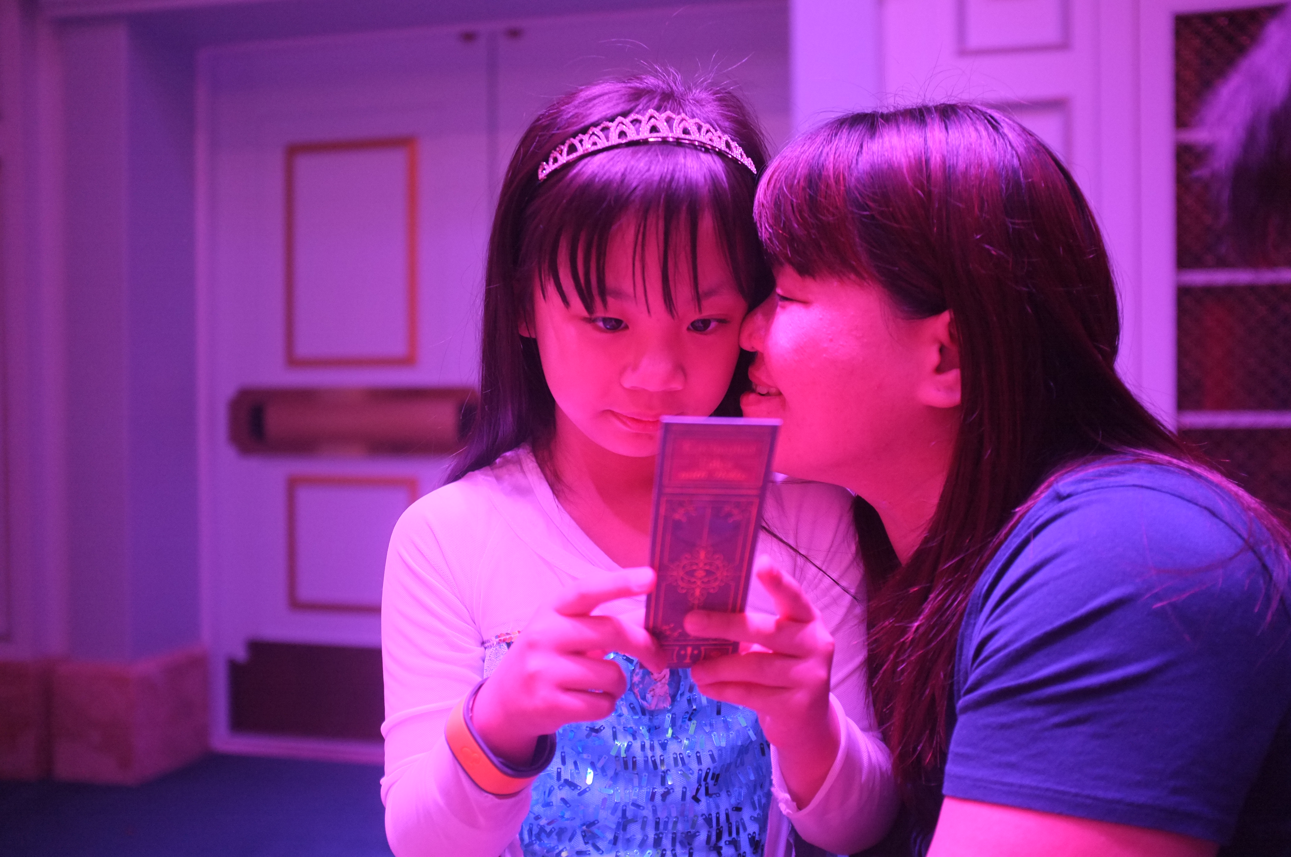 It was time to head towards the Princess Fairytale Hall. According to the hall’s storyline, Princess Fairytale Hall is a gift from the King to Cinderella, and acts as a place where she and other princesses can greet subjects. Stone walls, ornate chandeliers, and plenty of princess portraits line the walls of Princess Fairytale Hall. Here, you can get to meet Cinderella and Rapunzel or Anna and Elsa. It was clear who the popular princessses were, with Cinderella and Rapunzel only having a 20 minute wait while the posted wait time Anna and Elsa was 100 minutes.We stood in line first for Cinderella and Rapunzel. Before arriving into the princess chamber, we marveled at Cinderella’s glass slipper, glimmering brightly before we were ushered into the royal chambers. Ashley enjoyed talking to both the princesses and had photos with them.