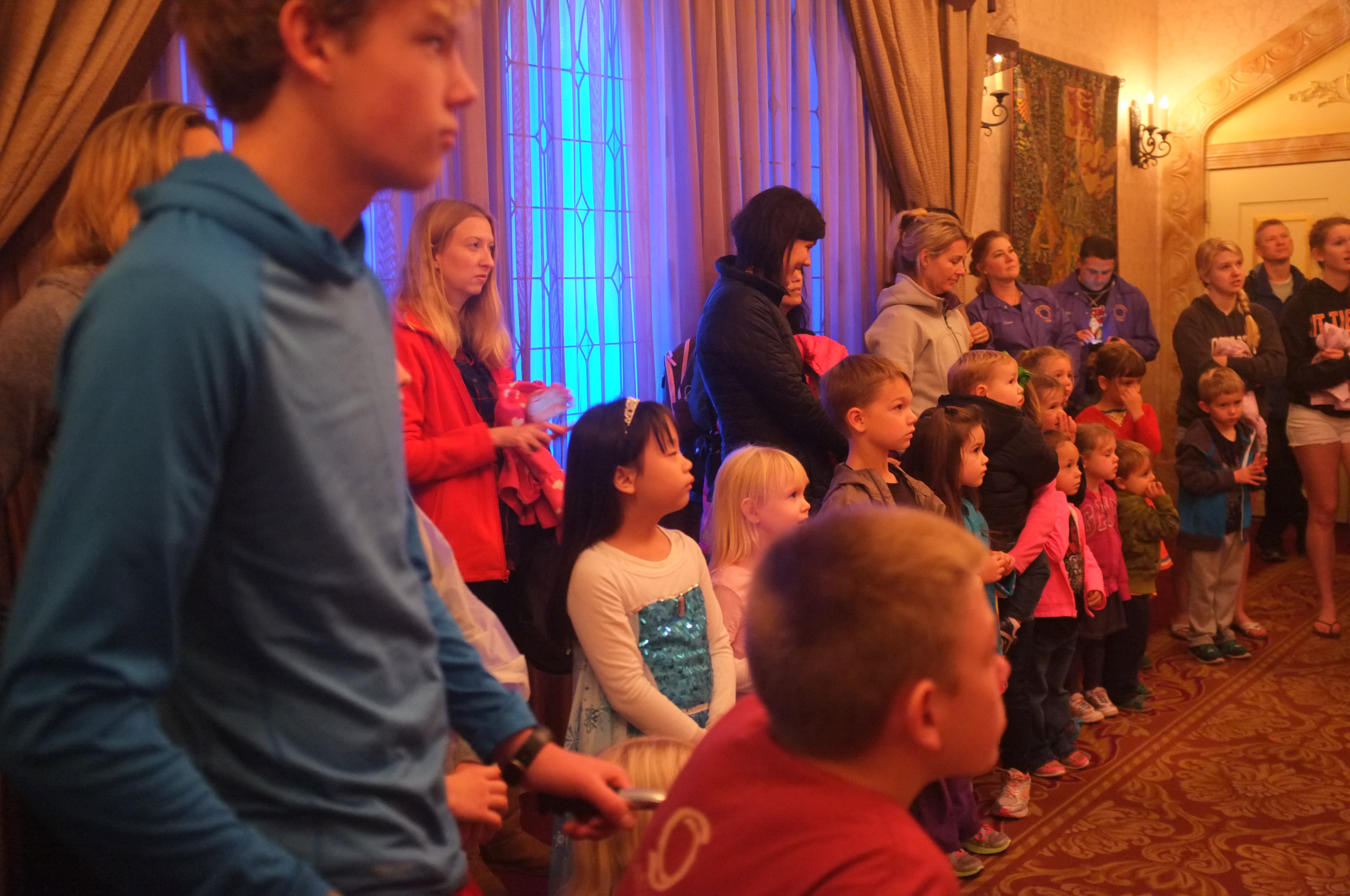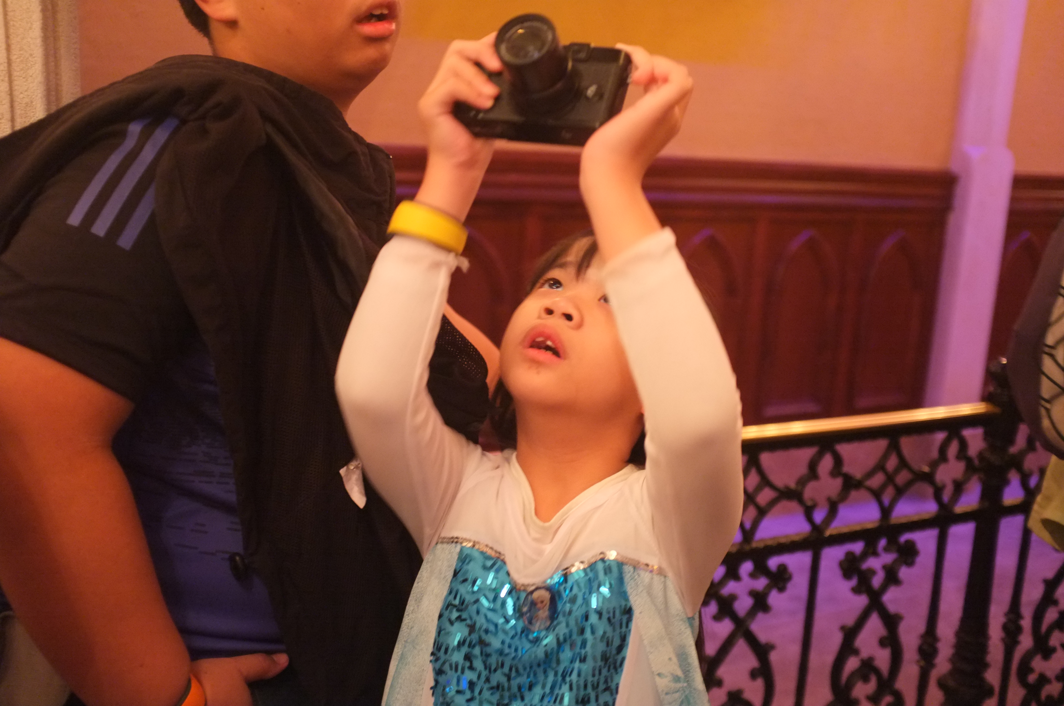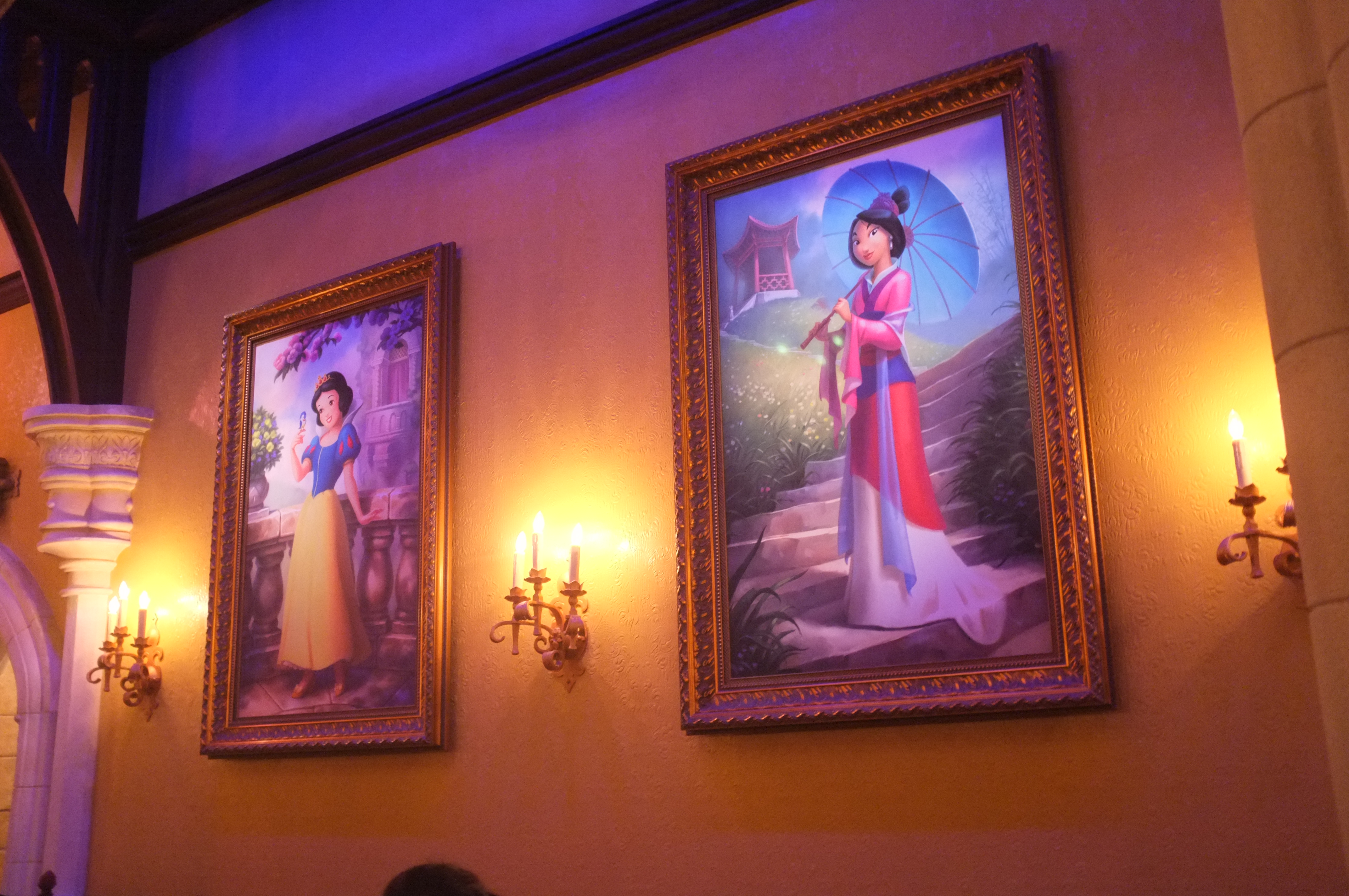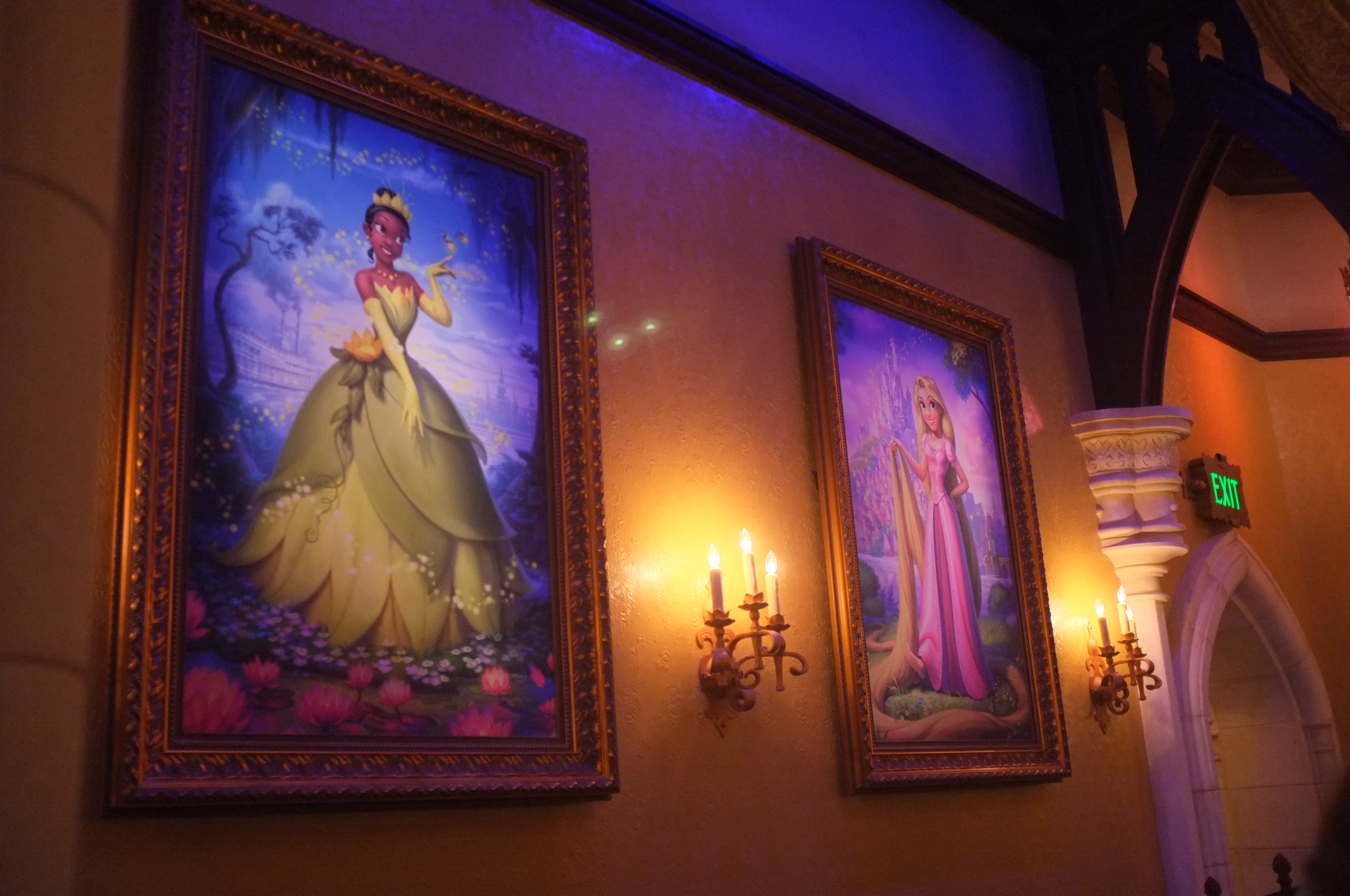 It was time to head towards the Princess Fairytale Hall. According to the hall’s storyline, Princess Fairytale Hall is a gift from the King to Cinderella, and acts as a place where she and other princesses can greet subjects. Stone walls, ornate chandeliers, and plenty of princess portraits line the walls of Princess Fairytale Hall. Here, you can get to meet Cinderella and Rapunzel or Anna and Elsa. It was clear who the popular princessses were, with Cinderella and Rapunzel only having a 20 minute wait while the posted wait time Anna and Elsa was 100 minutes.We stood in line first for Cinderella and Rapunzel. Before arriving into the princess chamber, we marveled at Cinderella’s glass slipper, glimmering brightly before we were ushered into the royal chambers. Ashley enjoyed talking to both the princesses and had photos with them.