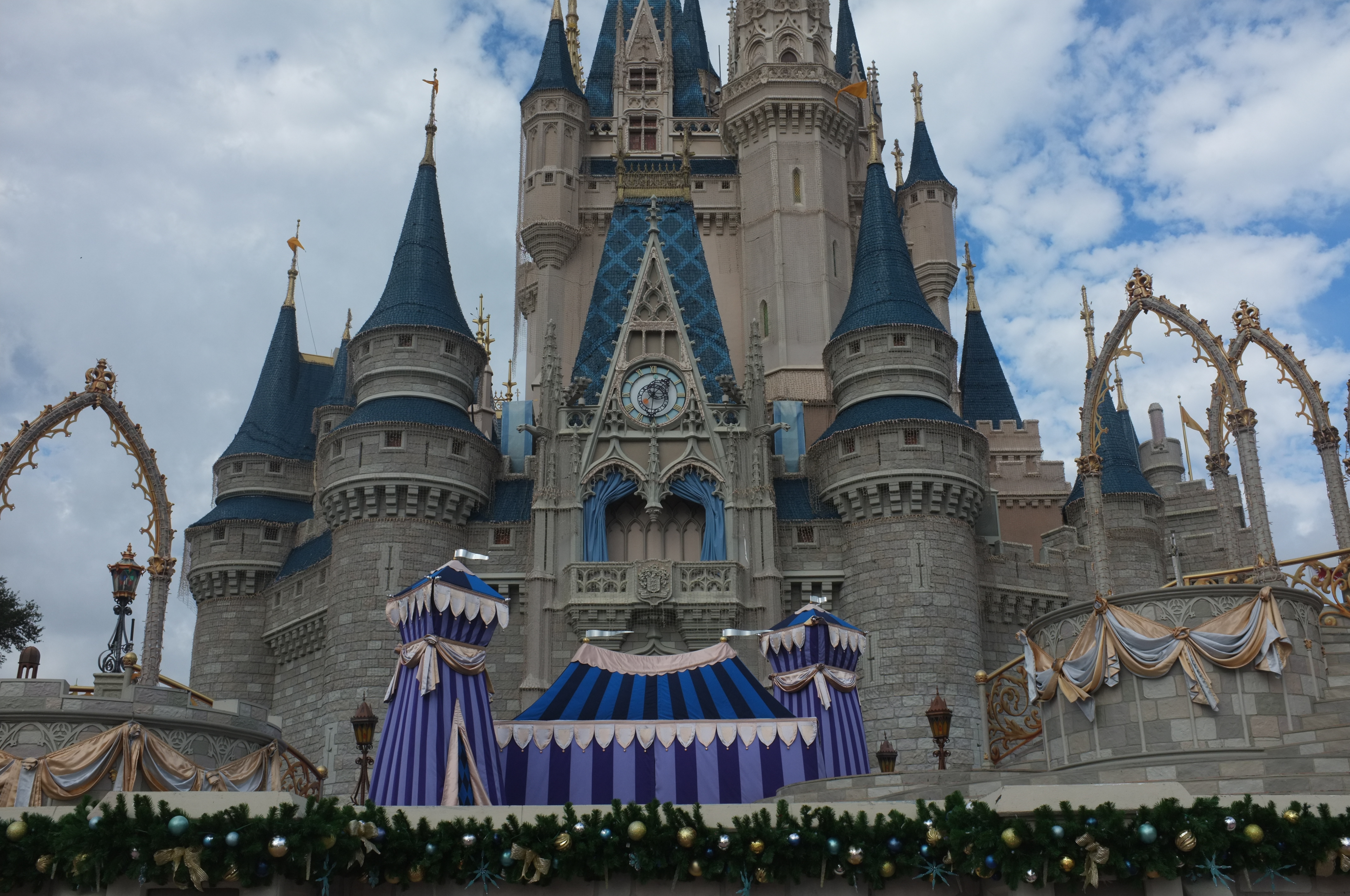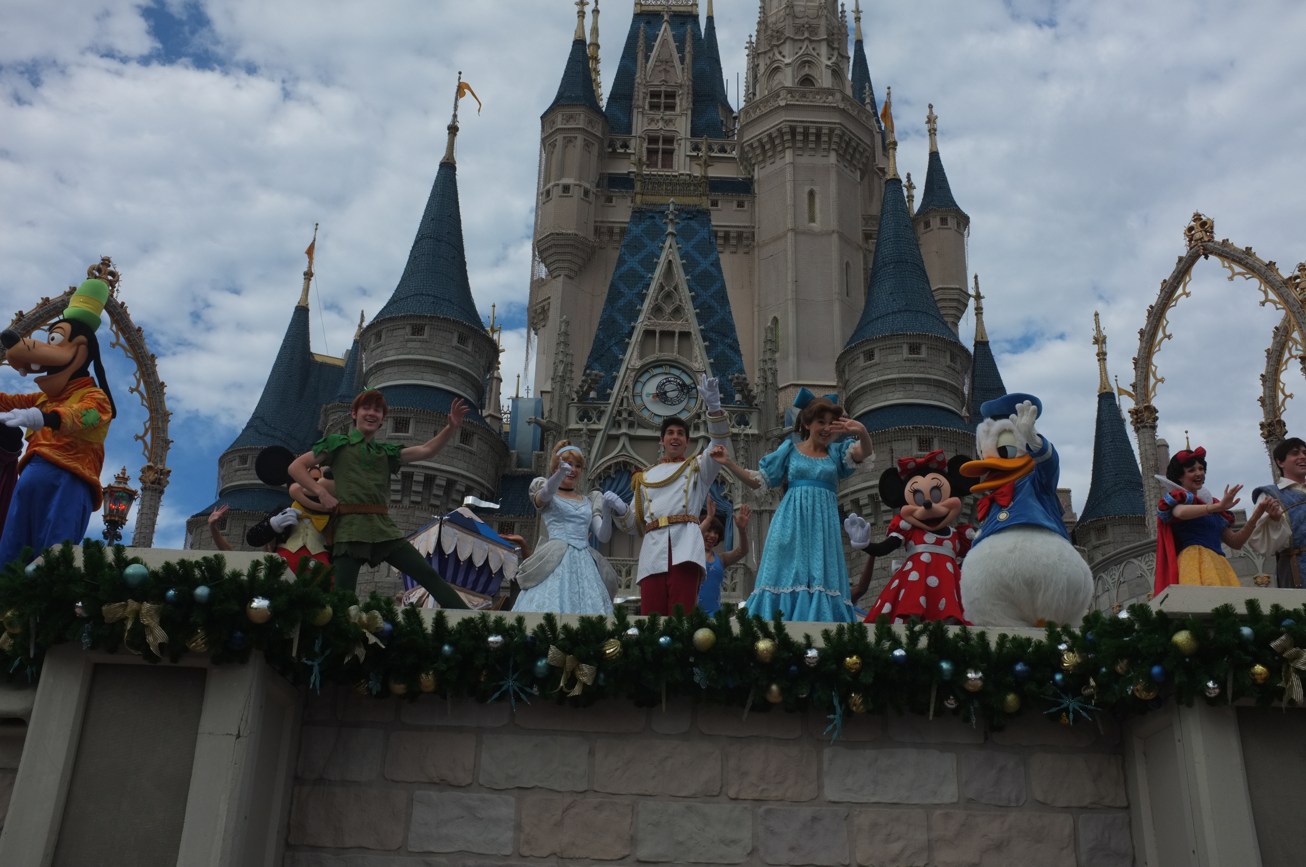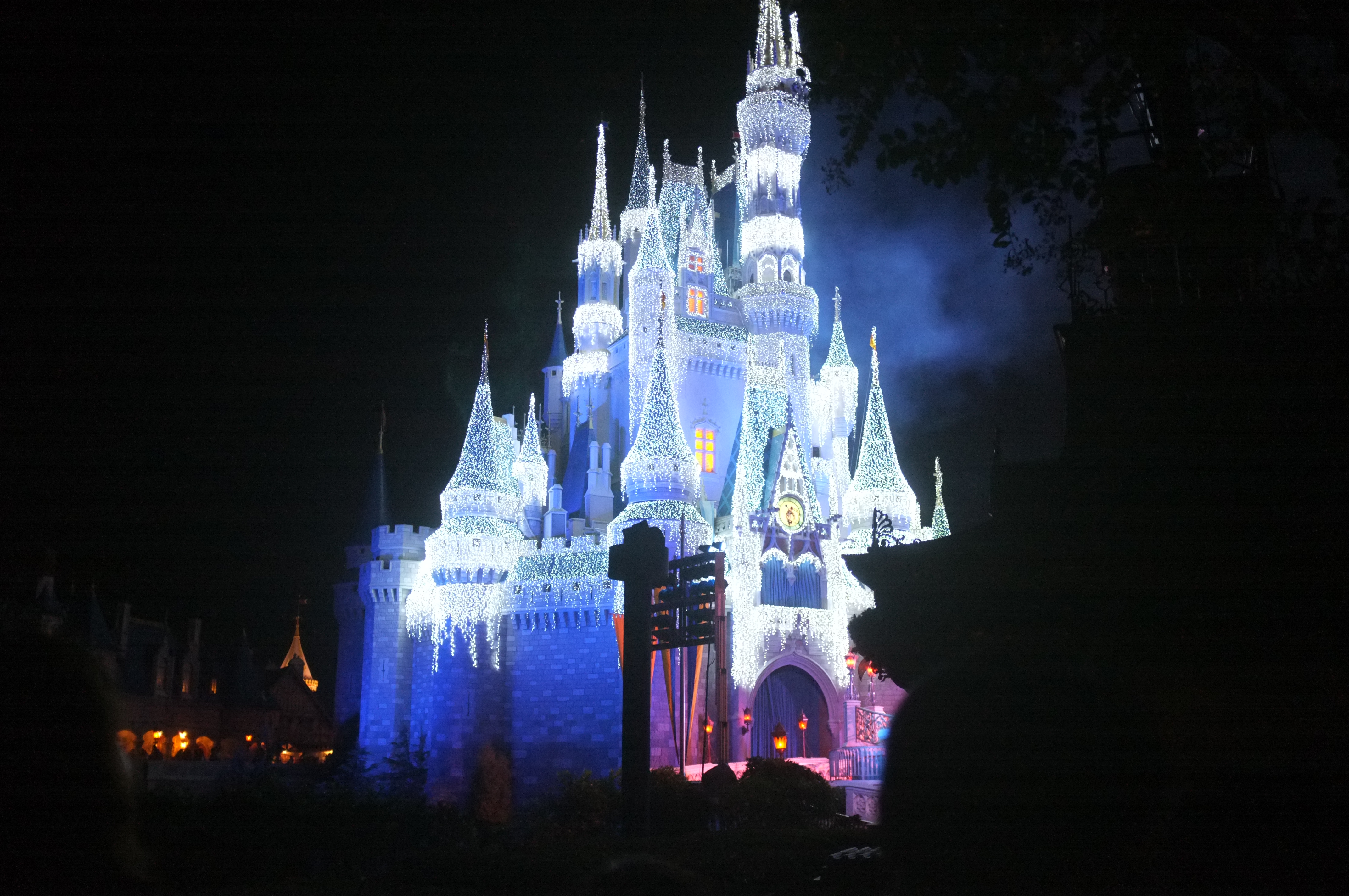 Time passes very quickly and it was soon evening and time for ‘A Frozen Holiday Wish’. This show features Anna and Elsa on the Castle Forecourt Stage. With special appearances by rugged mountain man Kristoff and lovable snowman Olaf, the show culminates in Queen Elsa using her incredible powers to present a gift to everyone in the kingdom, transforming Cinderella Castle into a glimmering ice palace for the holidays.