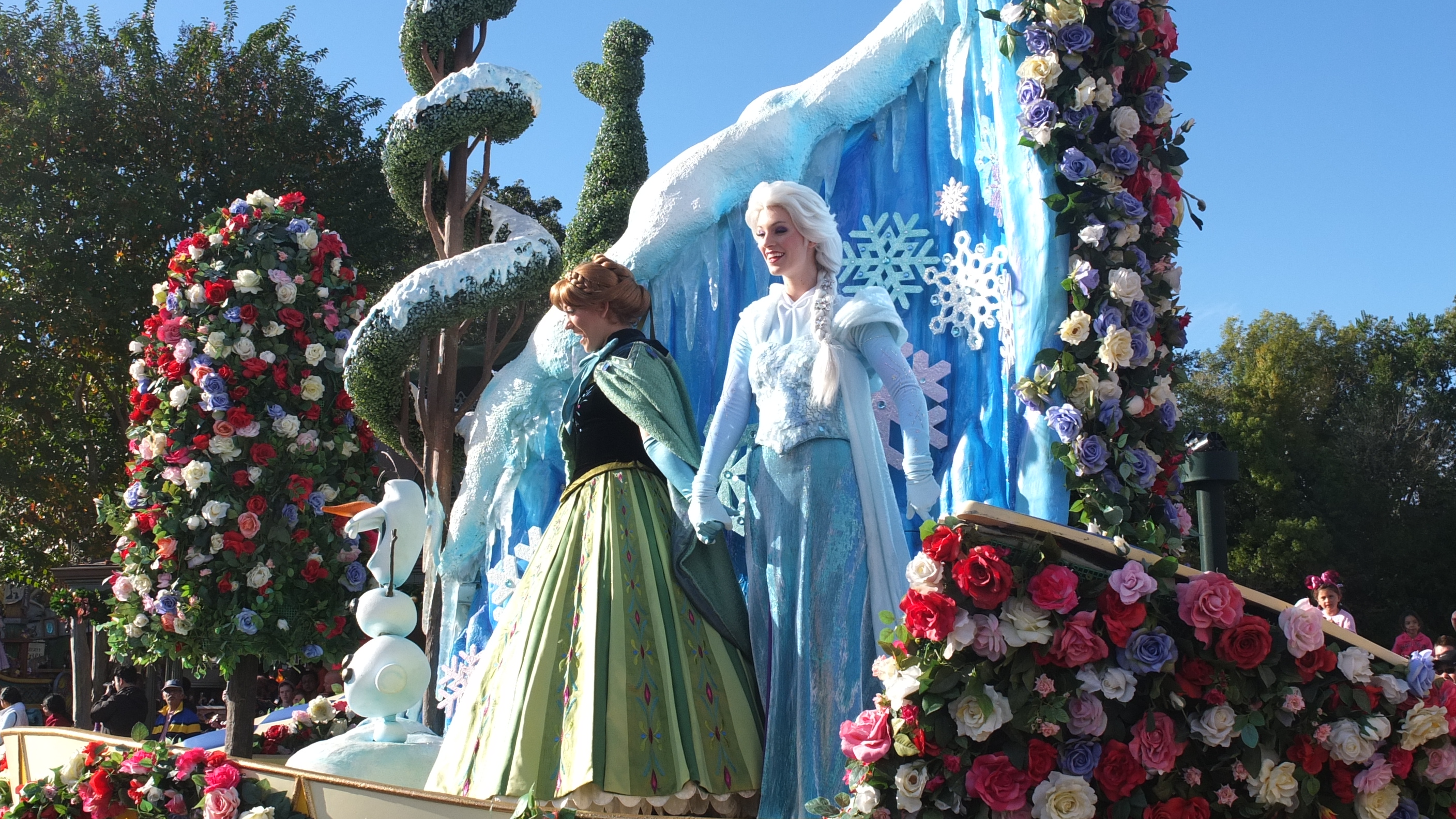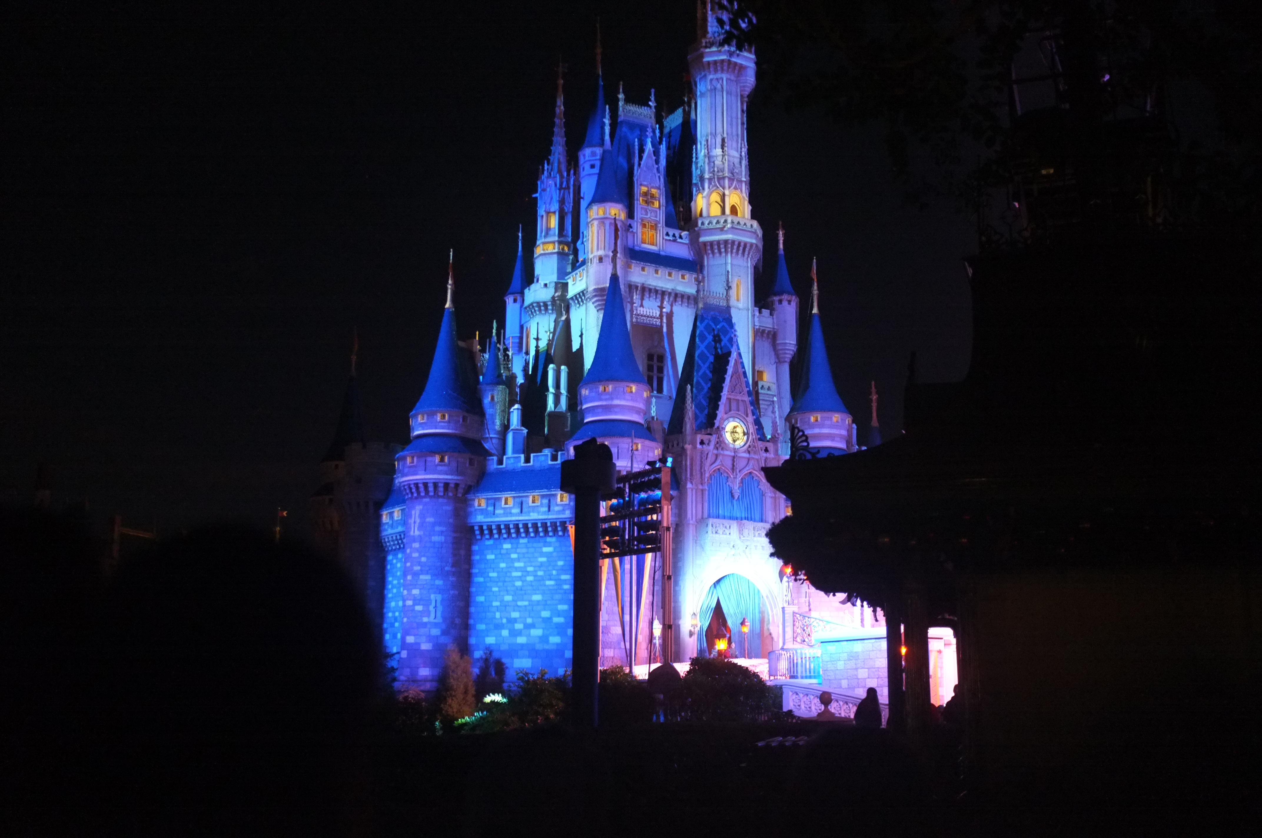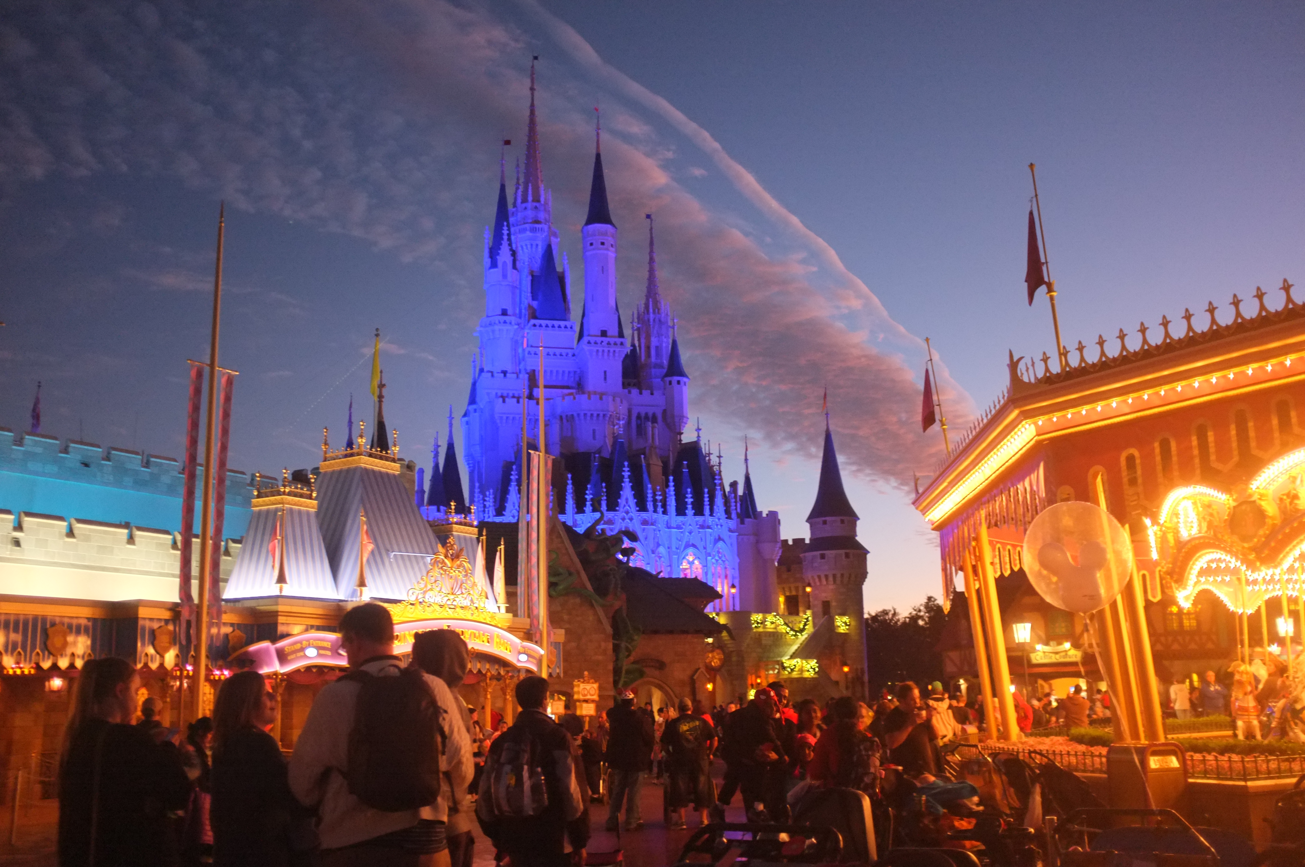 Time passes very quickly and it was soon evening and time for ‘A Frozen Holiday Wish’. This show features Anna and Elsa on the Castle Forecourt Stage. With special appearances by rugged mountain man Kristoff and lovable snowman Olaf, the show culminates in Queen Elsa using her incredible powers to present a gift to everyone in the kingdom, transforming Cinderella Castle into a glimmering ice palace for the holidays.