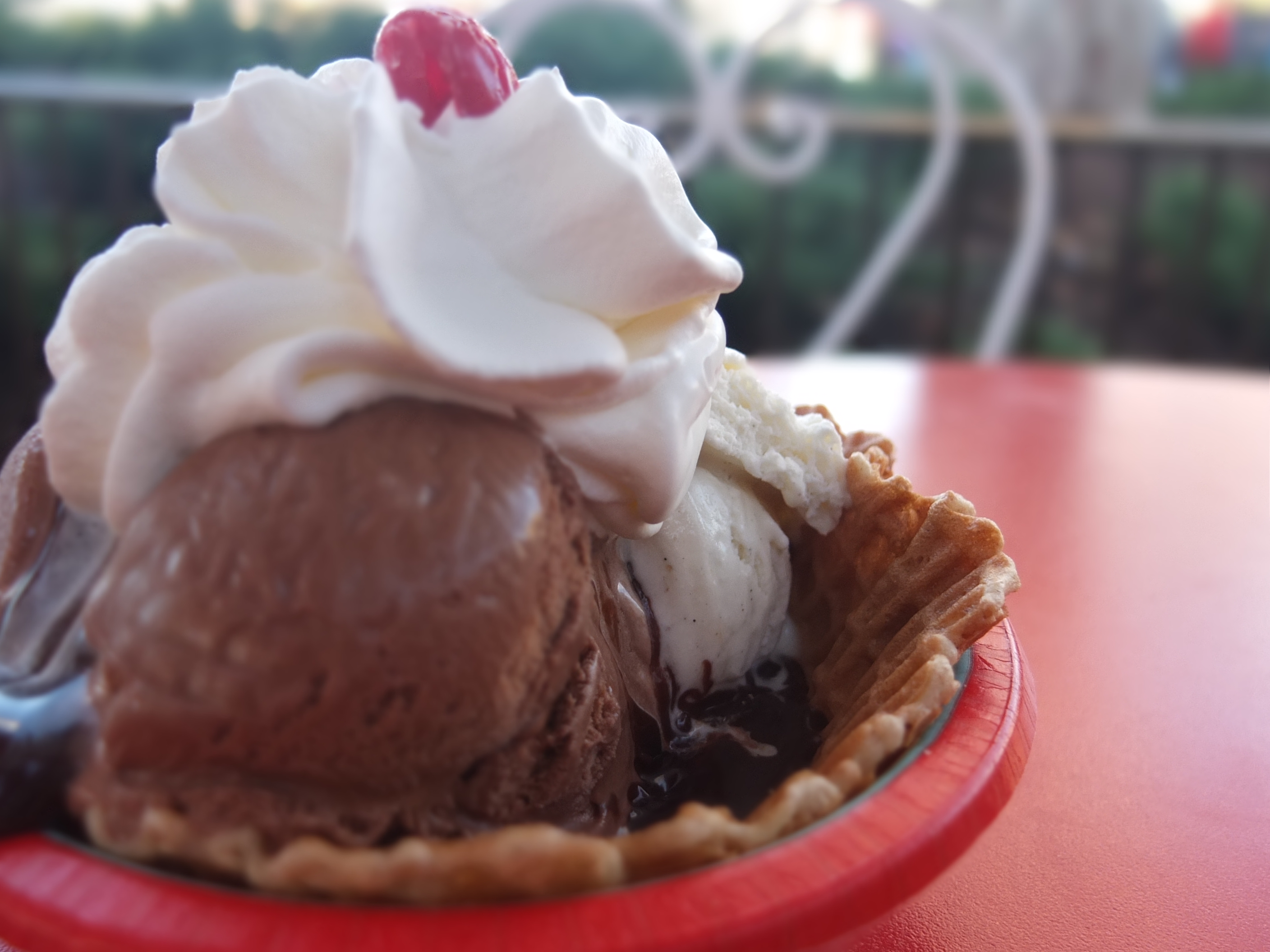 We took a break after the parade. ZA got some Corn Dog Nuggets from Casey’s Corner while I walked over to Plaza Ice Cream Palour and ordered the famous The ‘Plaza’ Ice Cream Sundae – Hot Fudge, Whipped Cream, and a Cherry served in a freshly made Waffle Bowl with choice of two hand-scoops of Ice Cream. I picked the traditional Vanilla and Chocolate. It was indeed a huge bowl and what a good use of a snack credit! We enjoyed our snacks there with a pianist playing cheery pieces at the background.
