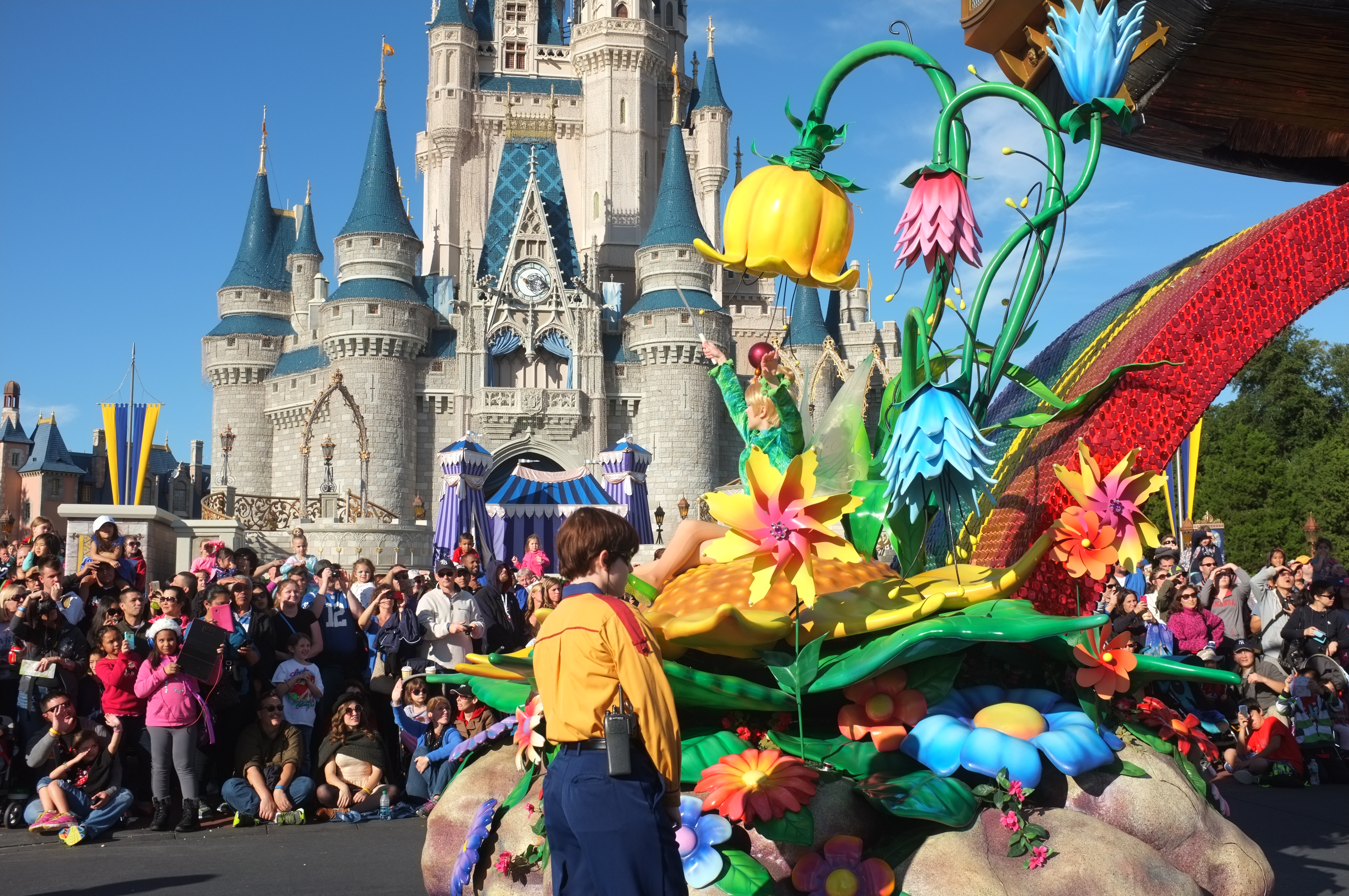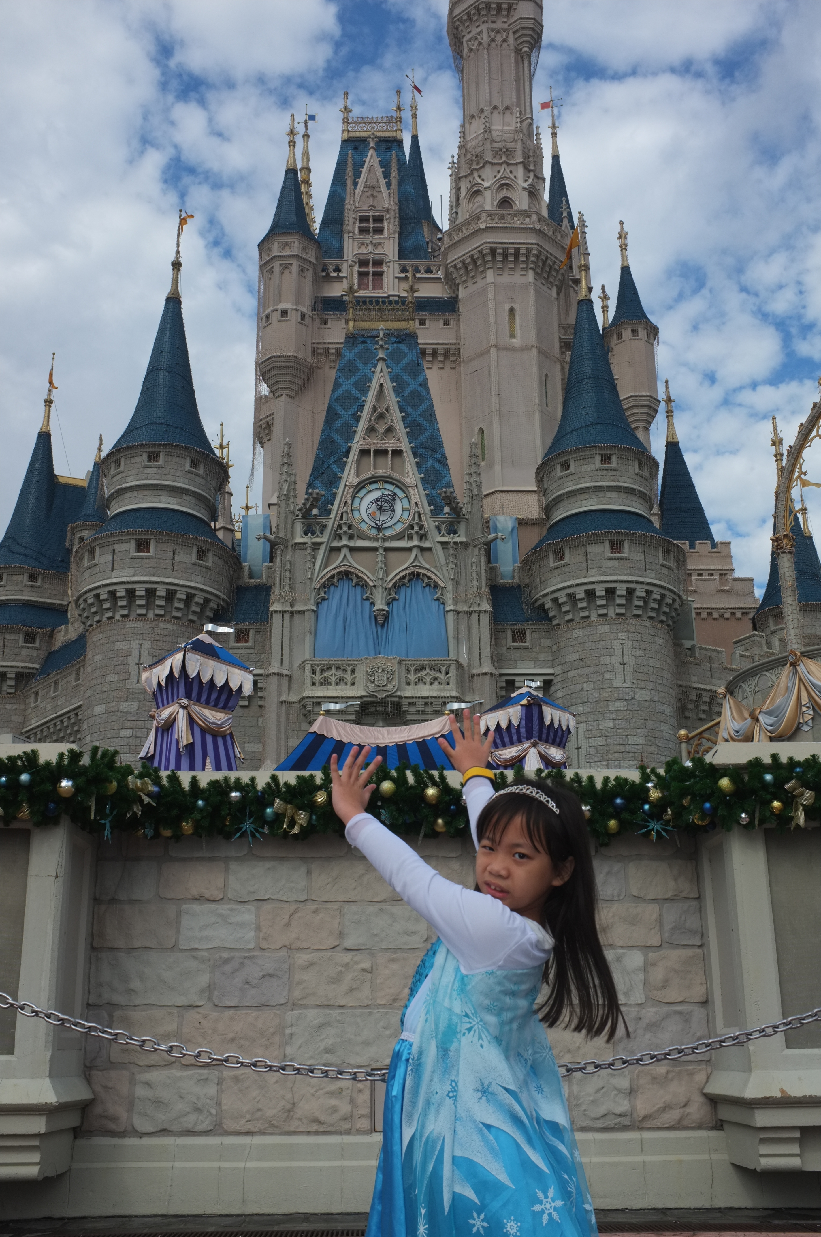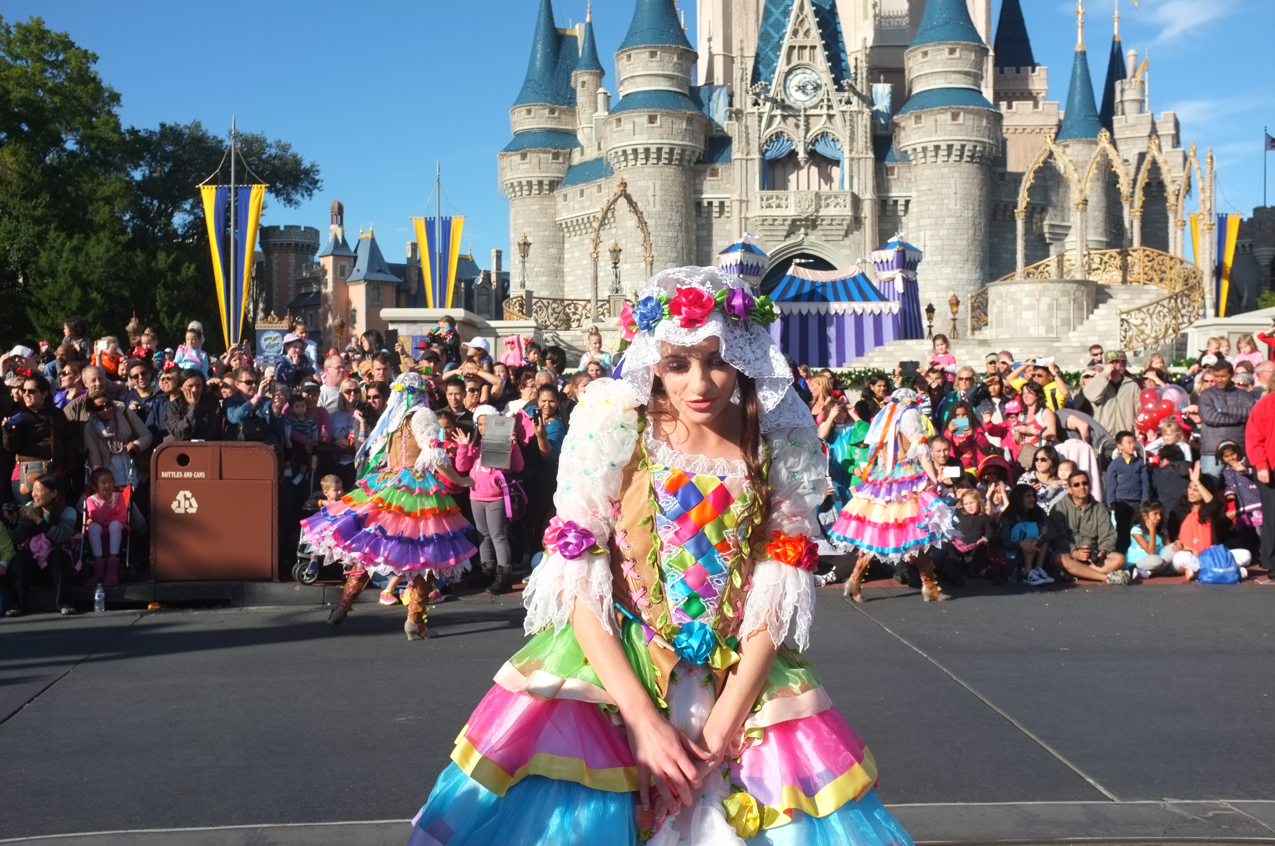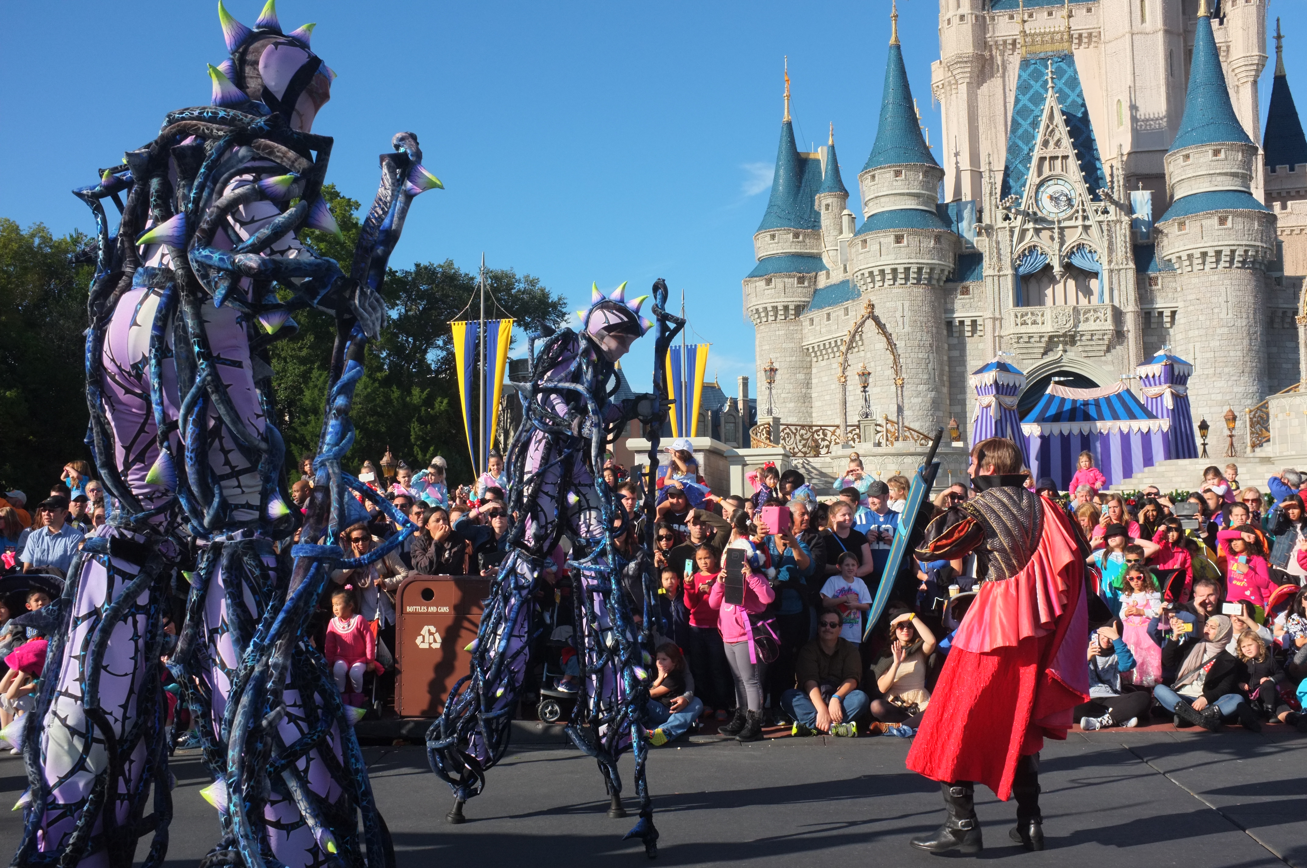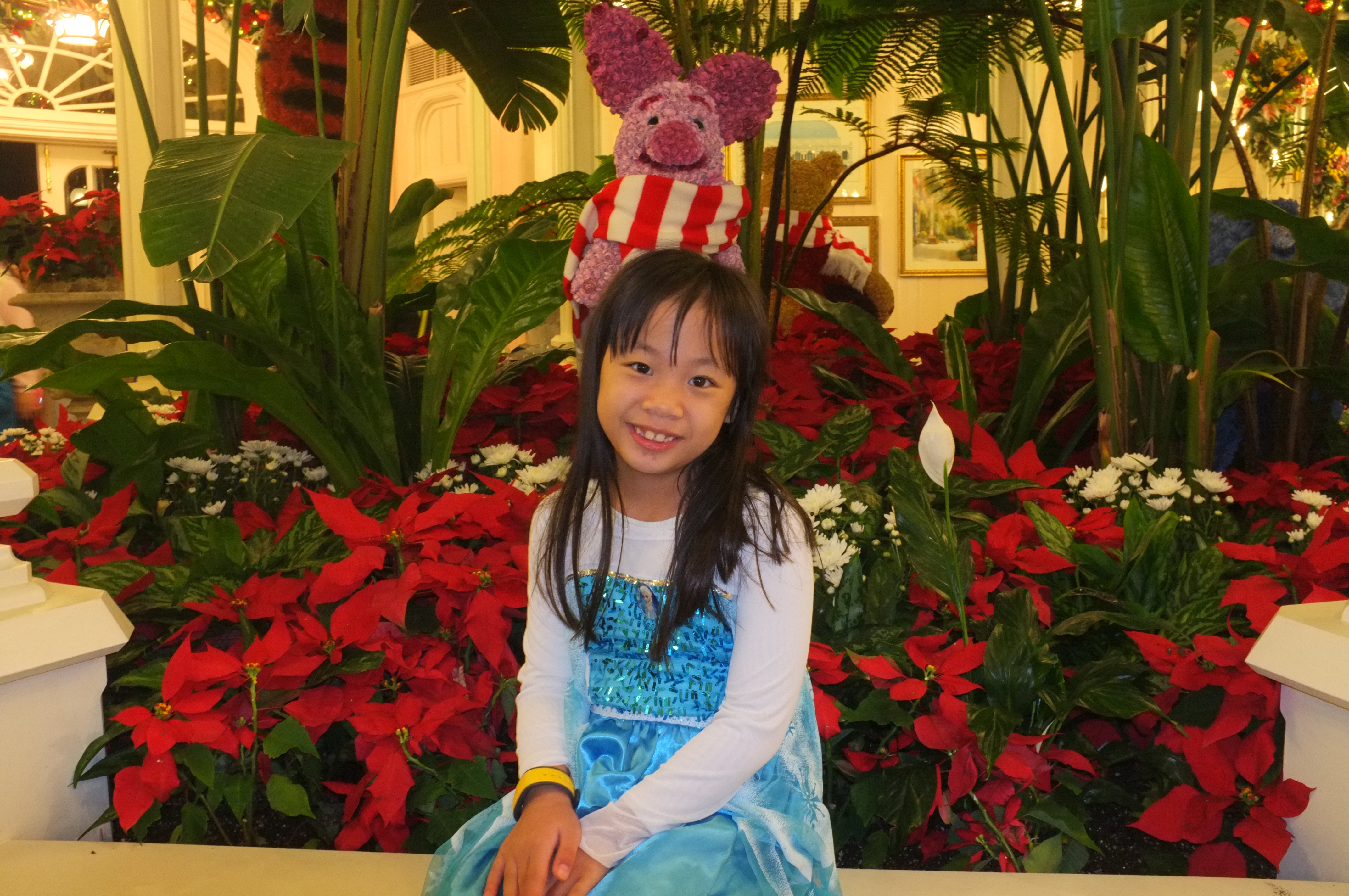 We bought a hot chocolate which comes in a souvenir mug to enjoy in this cool weather. New for 2014, this daytime parade brings vibrantly costumed characters and new music to a daily procession of innovative floats in Magic Kingdom. There are more that 100 live performers accompanying floats based on The Little Mermaid, Brave, Tangled, Peter Pan, Sleeping Beauty (along with a 26-foot-tall Maleficent in dragon form), princesses (including Anna and Elsa from Frozen), Mickey and Minnie on an airship, and more! The most impressive float was that of the fire-breathing dragon. Ashley also enjoyed a special moment when one of the dwarfs stopped and took her hand. It happened too quickly, we did not figure out which dwarf he was. She was elated.