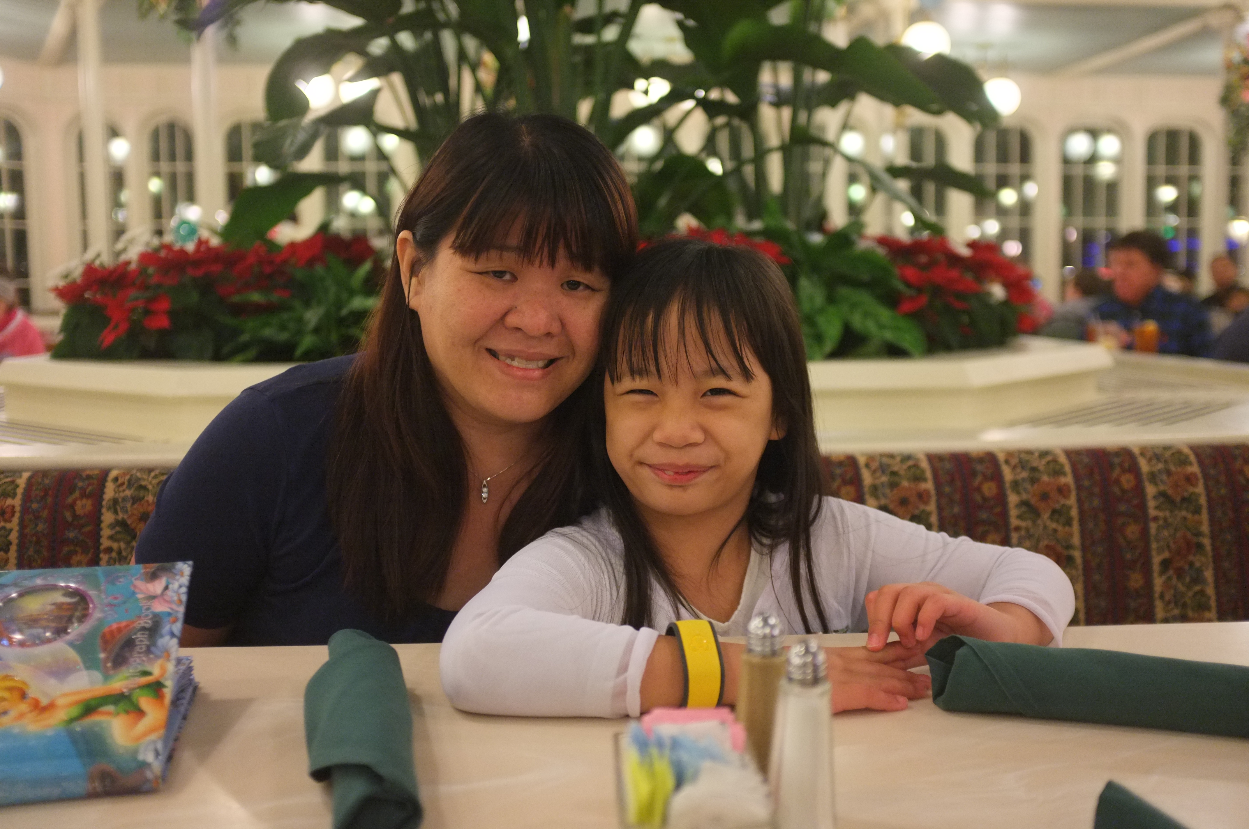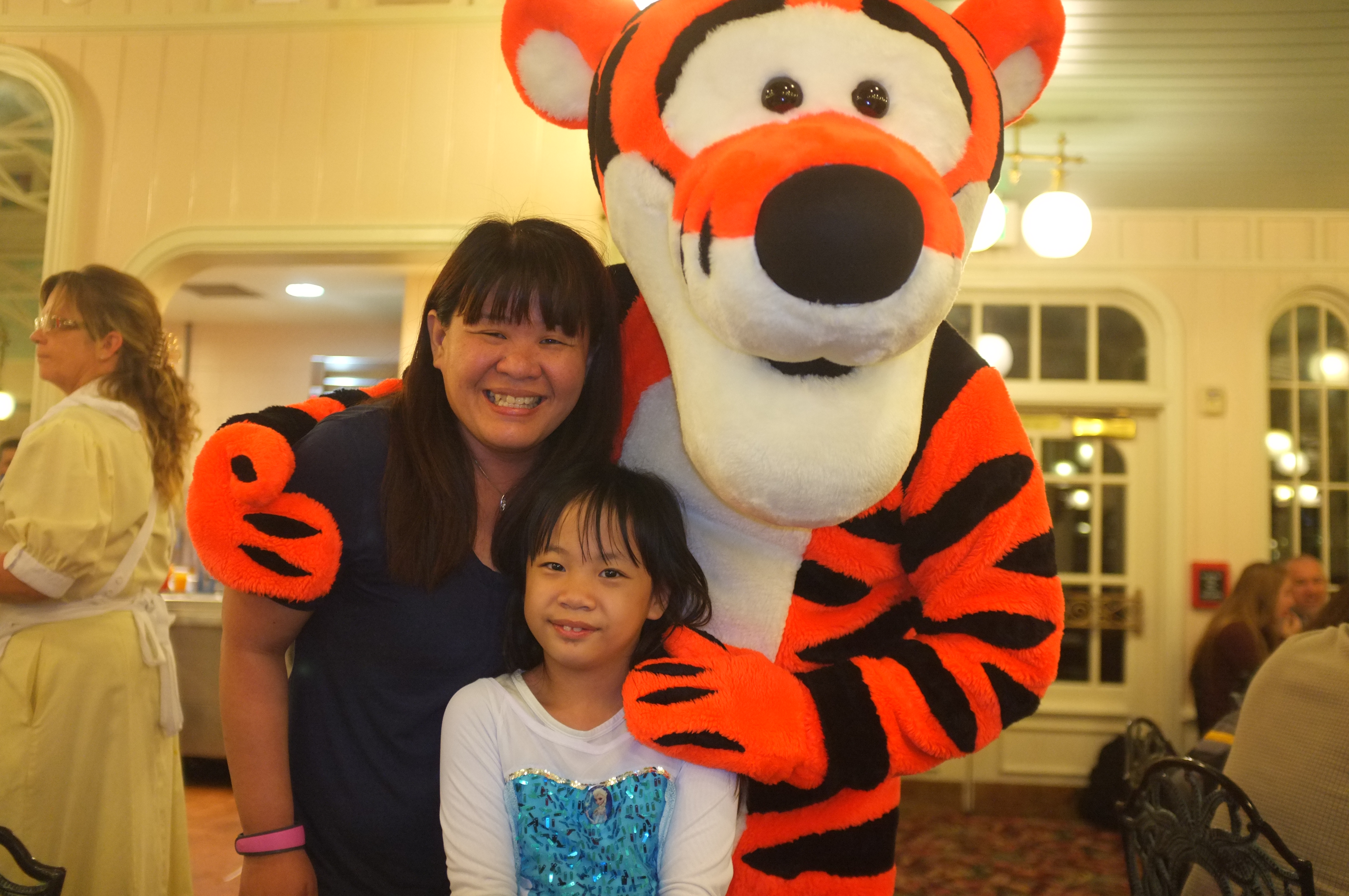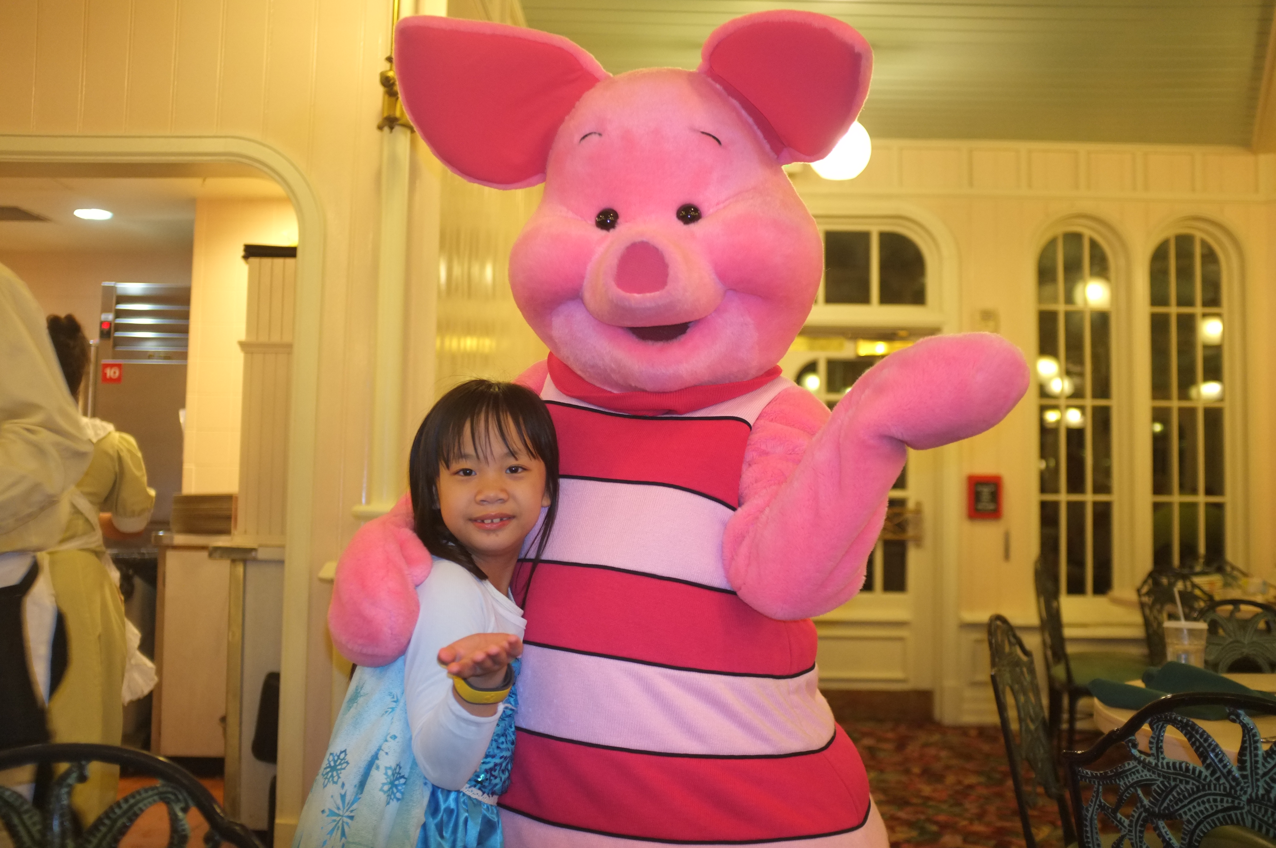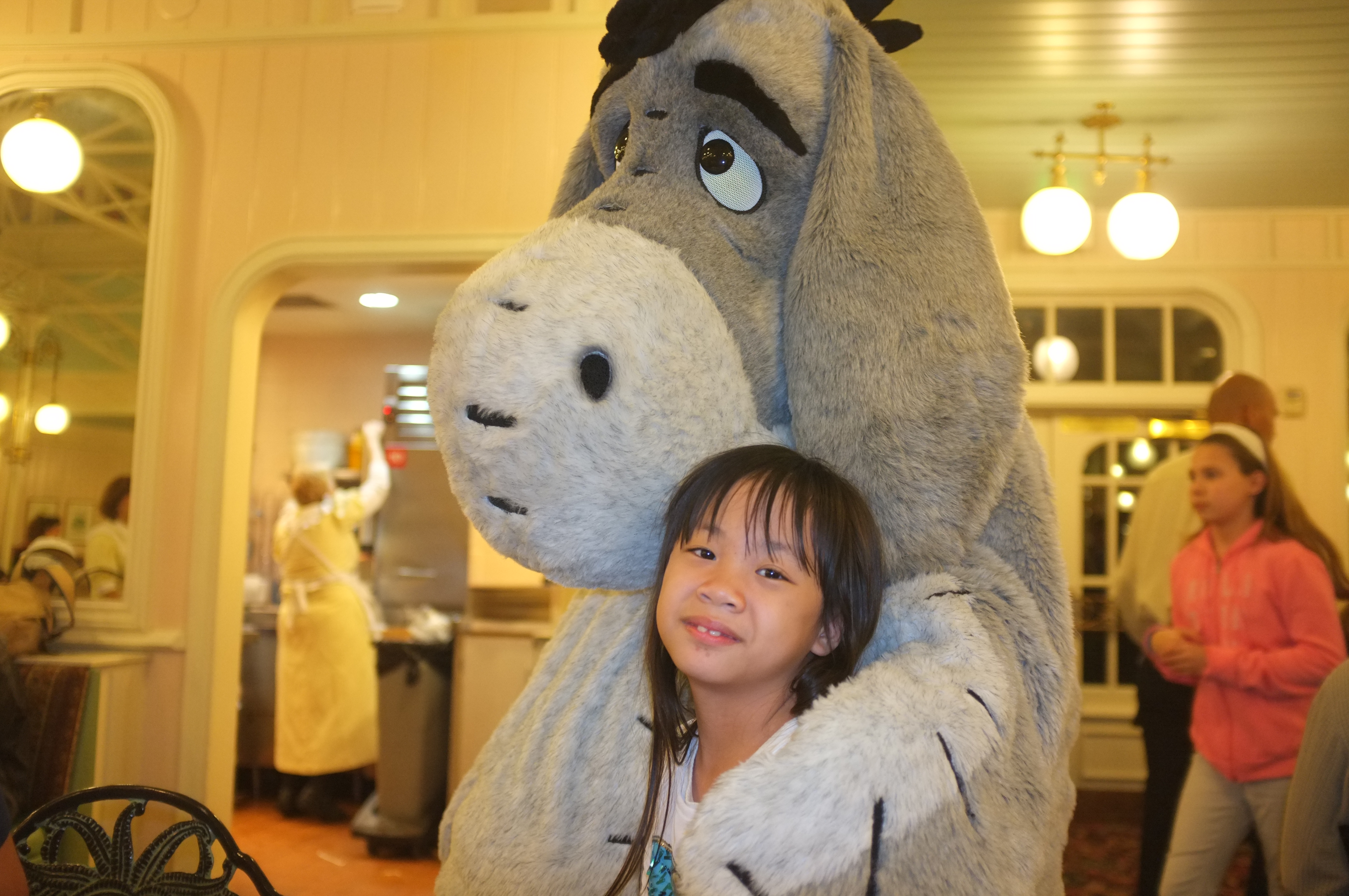We walked over to The Crystal Palace for our Buffet With Character dinner with The Hundred Acre Wood friends next. The decor is Victorian elegance with a 1904 World’s Fair-feel and offer wonderful views of Cinderella Castle, Main Street USA, and the entrance to Adventureland. Visitors are seated on either side of the restaurant, with the buffet in the center. Pooh and his friends are celebrating “Friendship Day” and have several homemade decorations up for the party. During the meal, everyone is treated to a meet and greet with Winnie the Pooh, Piglet, Tigger, and Eeyore. Periodically, the restaurant will host a kid’s Friendship Day Parade during which all of the children in the restaurant are encouraged to go on a jolly walk — set to a lively Winnie tune — with the characters around the tables. Ashley enjoyed marching around the restaurant, waving to the diners. The food offerings were fabulous with our favourite being the Corn Dog Nuggets from the Pooh Corner for kids. They tasted as good as those from Casey’s Corner. Perhaps they were from the same kitchen. All in all, an enjoyable dining experience.