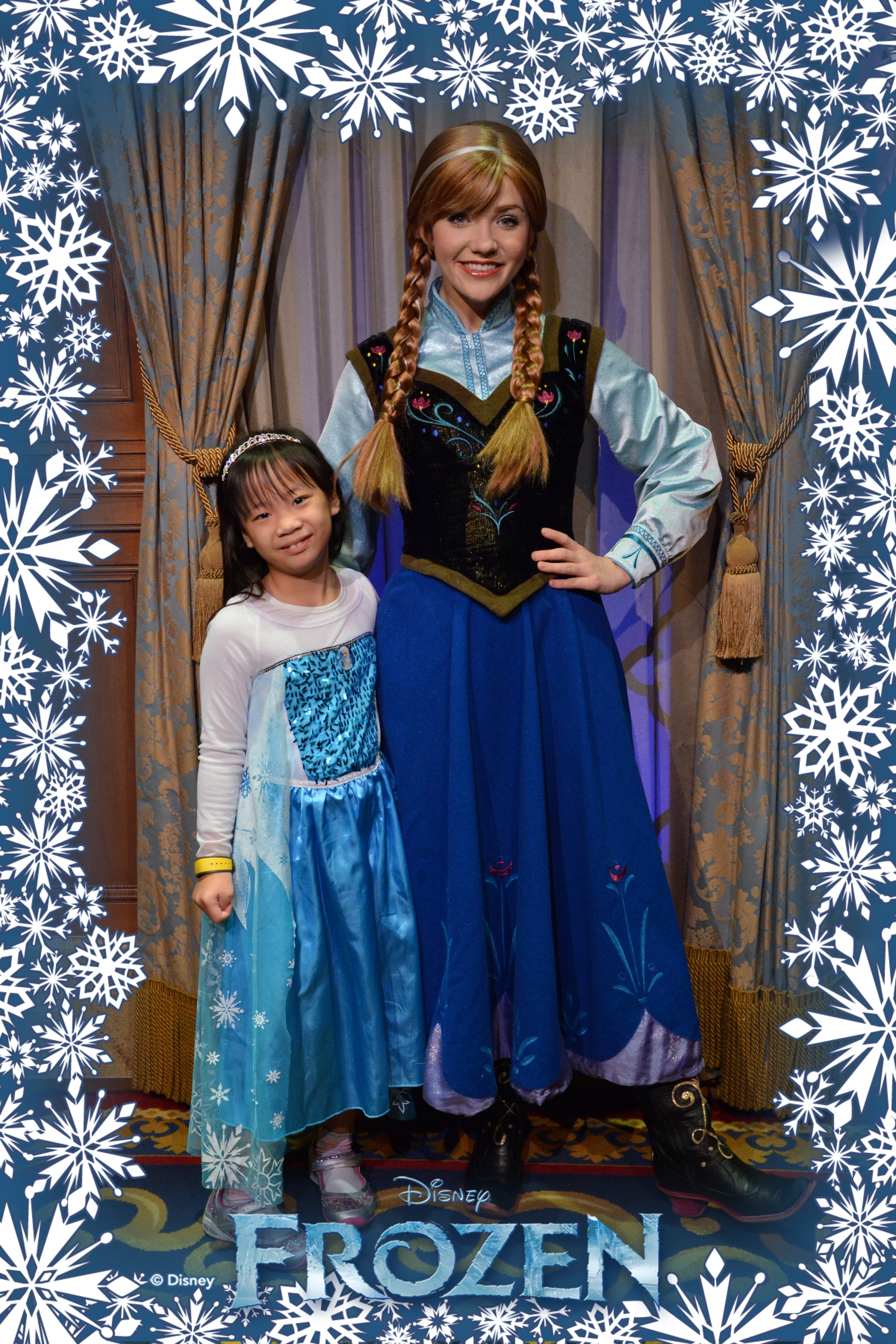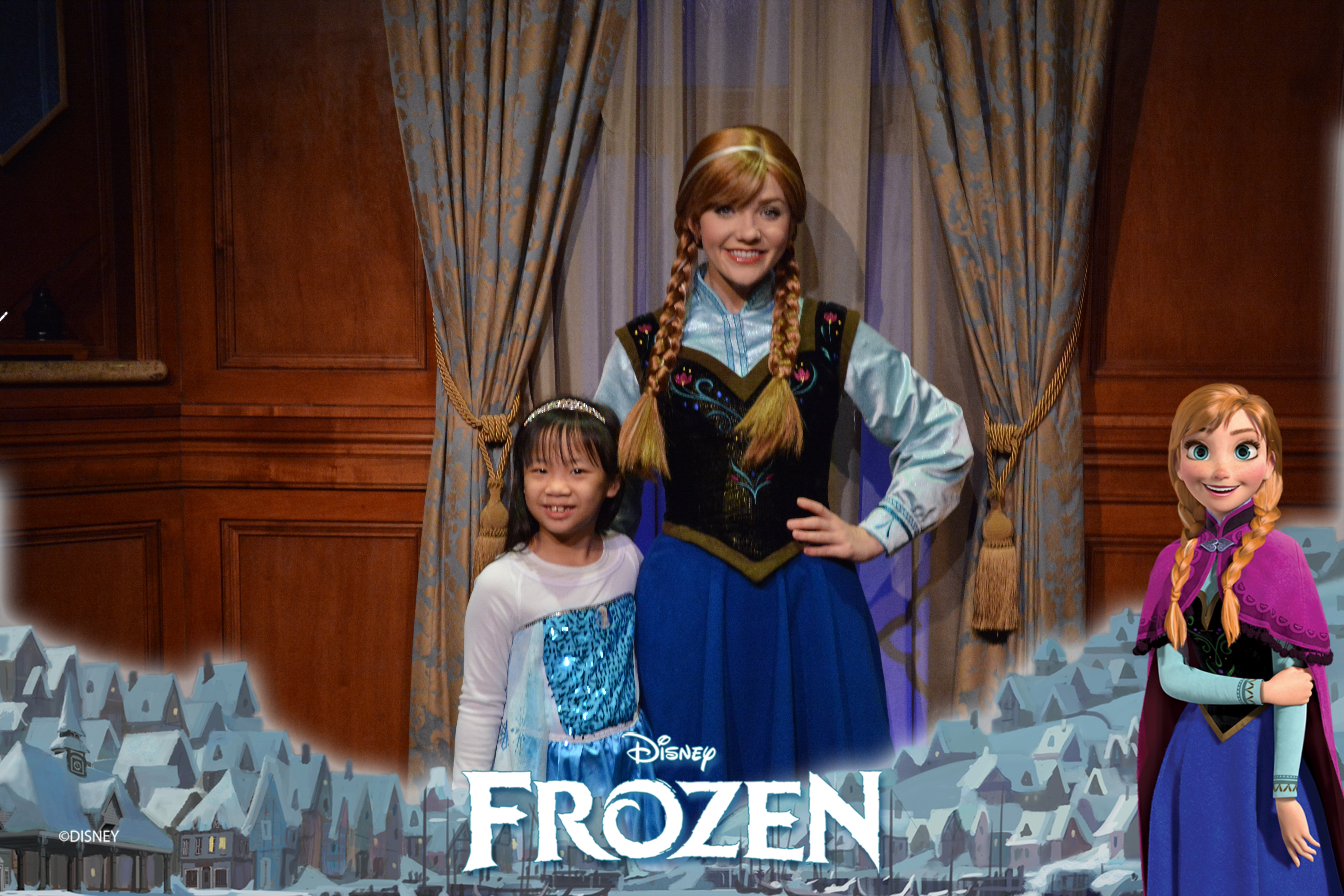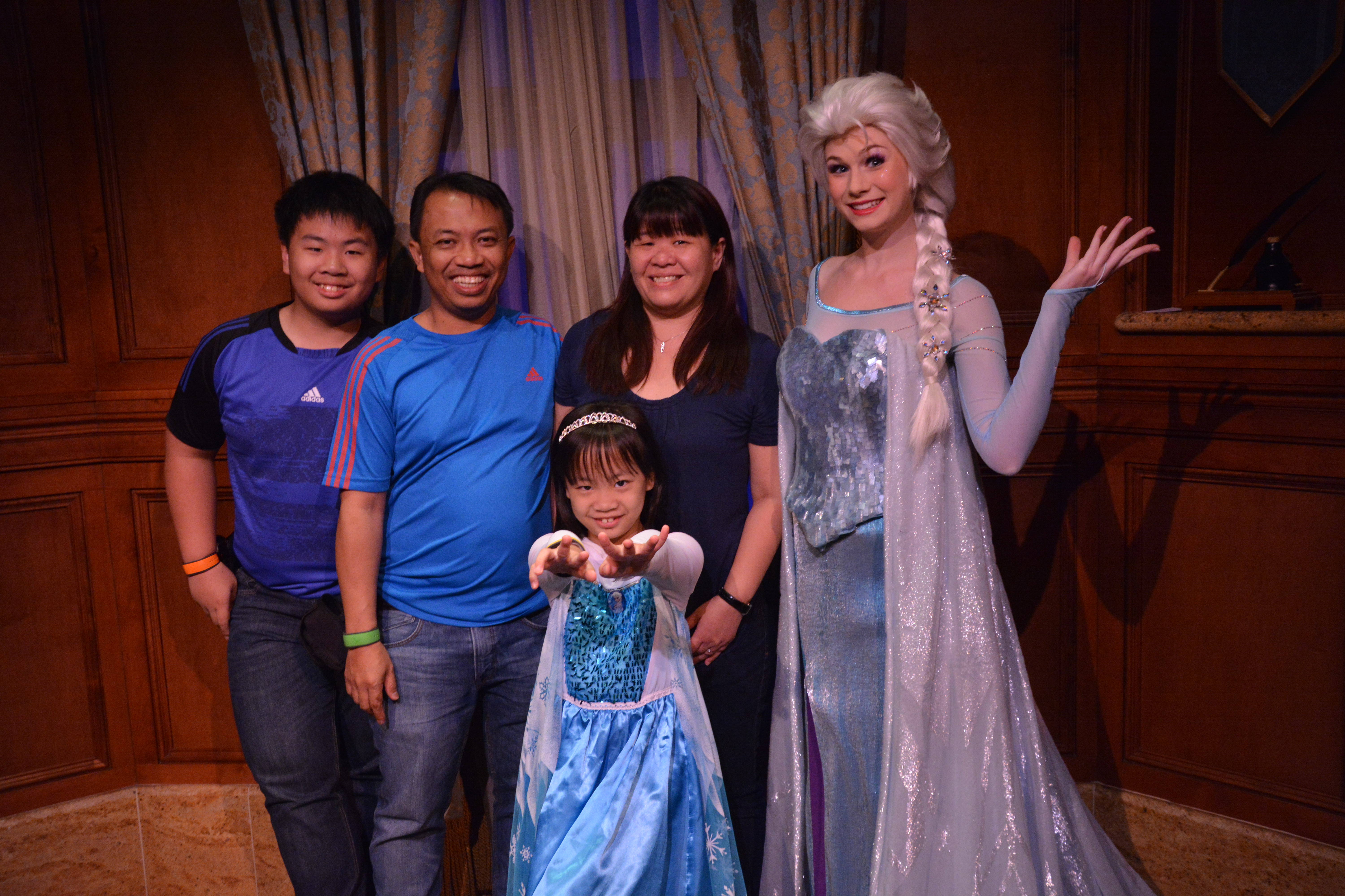 As we exited, we went to the FP+ area to meet Elsa and Anna. This is a highly coveted FP+ which we had booked more than 60 days in advance. We could not imagine standing in line that long to meet them since we had done that last year in Epcot. We scanned our Magic Bands and walked right in. Unlike in Epcot where we met both Anna and Elsa together, we met them separately, first Elsa, then Anna. Both Elsa and Anna were friendly and Anna asked Ashley who was dressed in ‘Elsa’ if she was the one setting out the cold and wanted to take her to the North Mountain. We had a family picture with the princesses this time. (ZA : Ashley is in Elsa costume)
