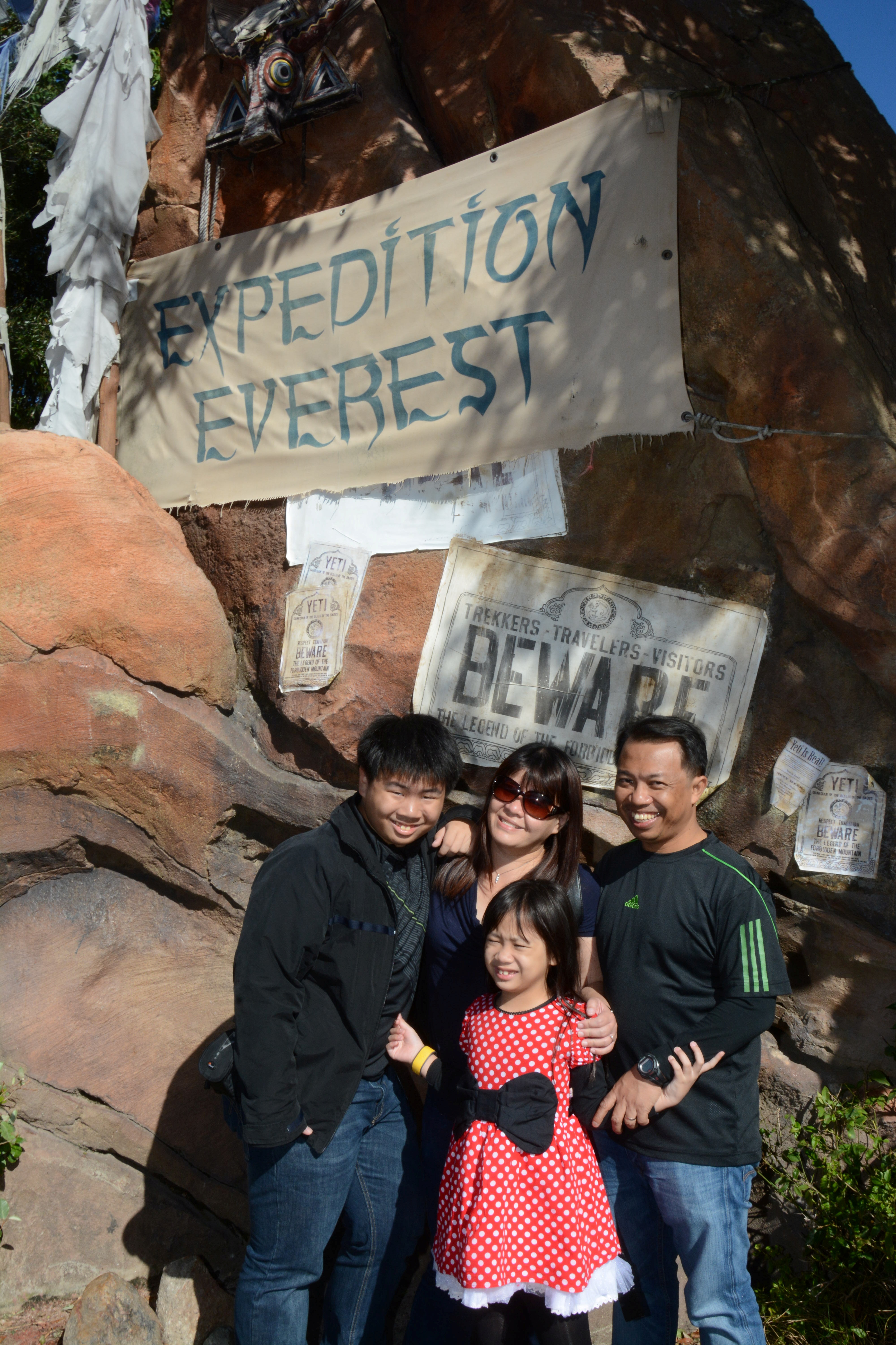 Our next FP+ was Expedition Everest – Legend of the Forbidden Mountain. Similarly, we did not try this on our last trip although Ashley felt ready as this ride has a backward drop. At 200 feet, Expedition Everest is the highest “mountain” in Walt Disney World. We got in line and were assigned the first 2 rows. So, Ashley and I took the front row with Jarod and ZA at the second.  Off we go and embarked on a thrilling expedition through the icy peaks of the Himalayas. We ascended a series of rolling hills overlooking a serene green forest, a privilege that came with the unobstructed front row. We climbed a steep incline and navigated through a ceremonial stone tunnel before reaching the summit. Once at the “top of the world,” the train picked up speed and raced inside the dreaded mountain. Without warning, our train screeched to a halt: A broken and twisted track appeared in front of us. Our train then unpredictably began to race backward into the darkened mountain, furiously swooping up into a double-looping turn and we came face to face with Yeti – the mysterious snow monster said to inhabit the Himalayas. We then hurled 80 feet down the base of the cursed mountain and swooped in and out of murky caves and along jagged rocky ledges to escape the dreaded monster. It was the most thrilling ride that we have taken and Ashley wanted more!