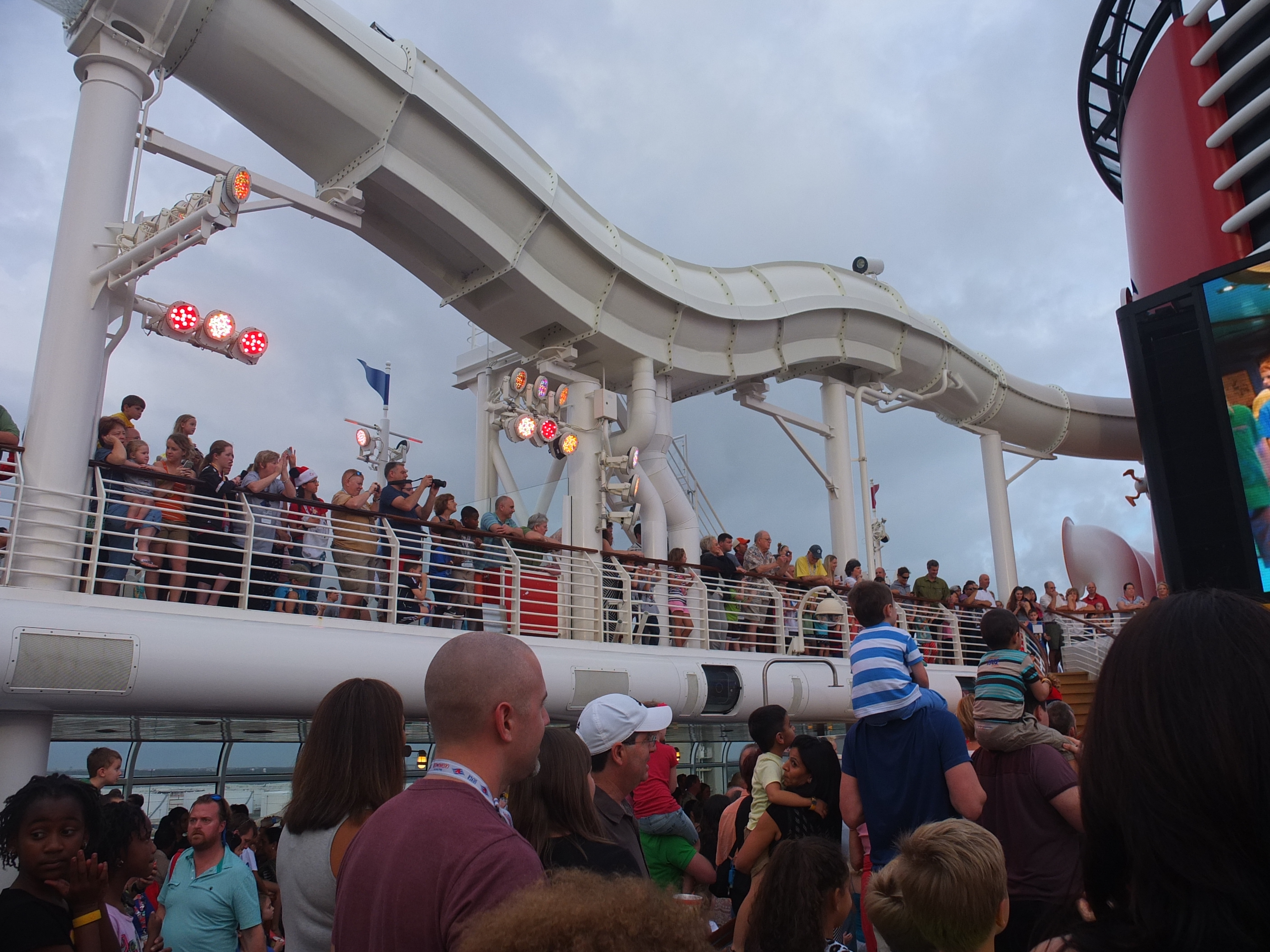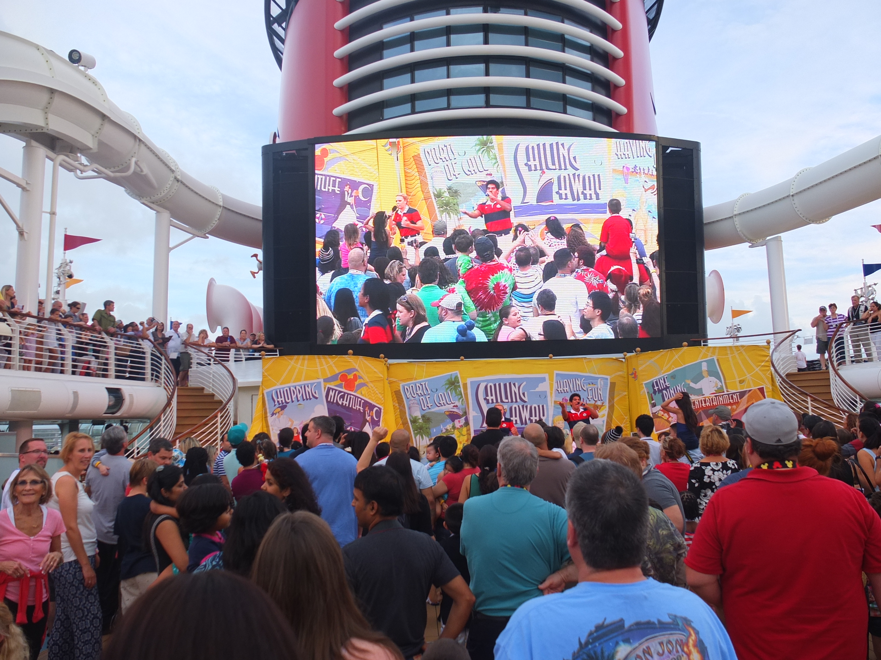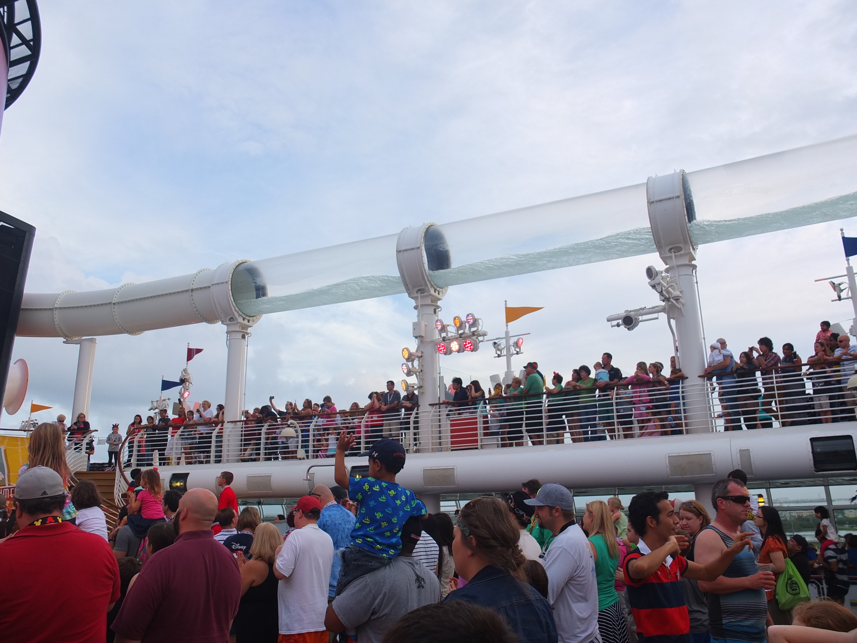 Soon after, it was time for the Sail away party. This was a gathering on Deck 11, where the pool was located, to celebrate the start of our cruise to the Bahamas. The entertainment crew were jumping on stage and were extremely excited. Soon after, the ship’s horn blared out the melody of classic Disney tunes, before setting off into the sunset (quite literally!), towards Nassau. Before long, it was time for the show.
