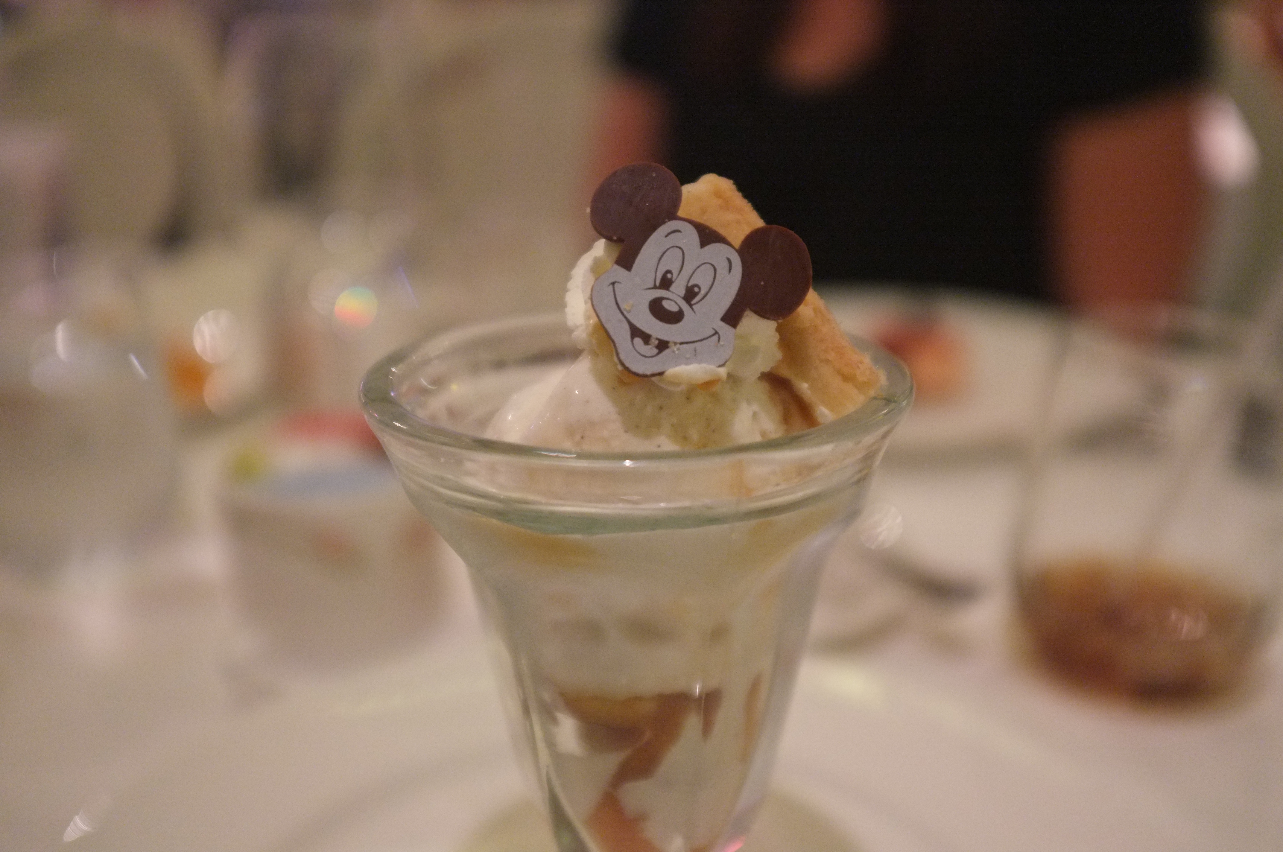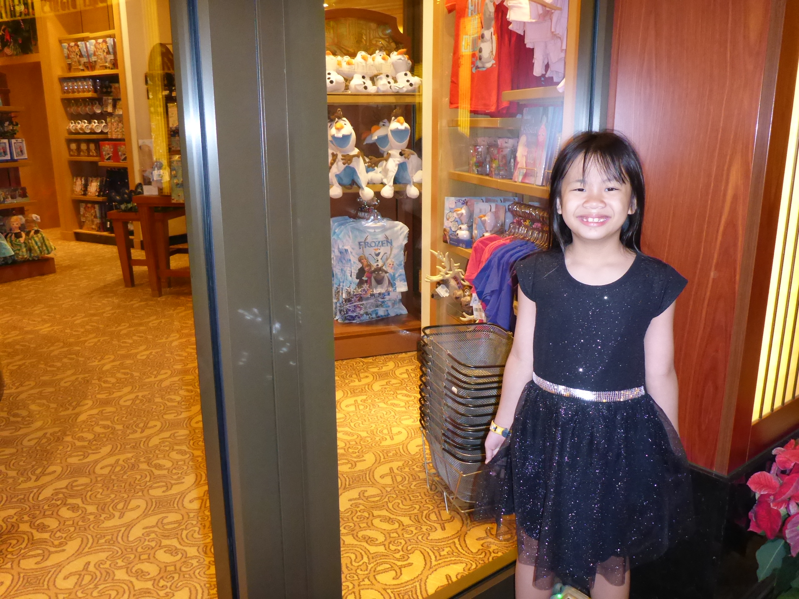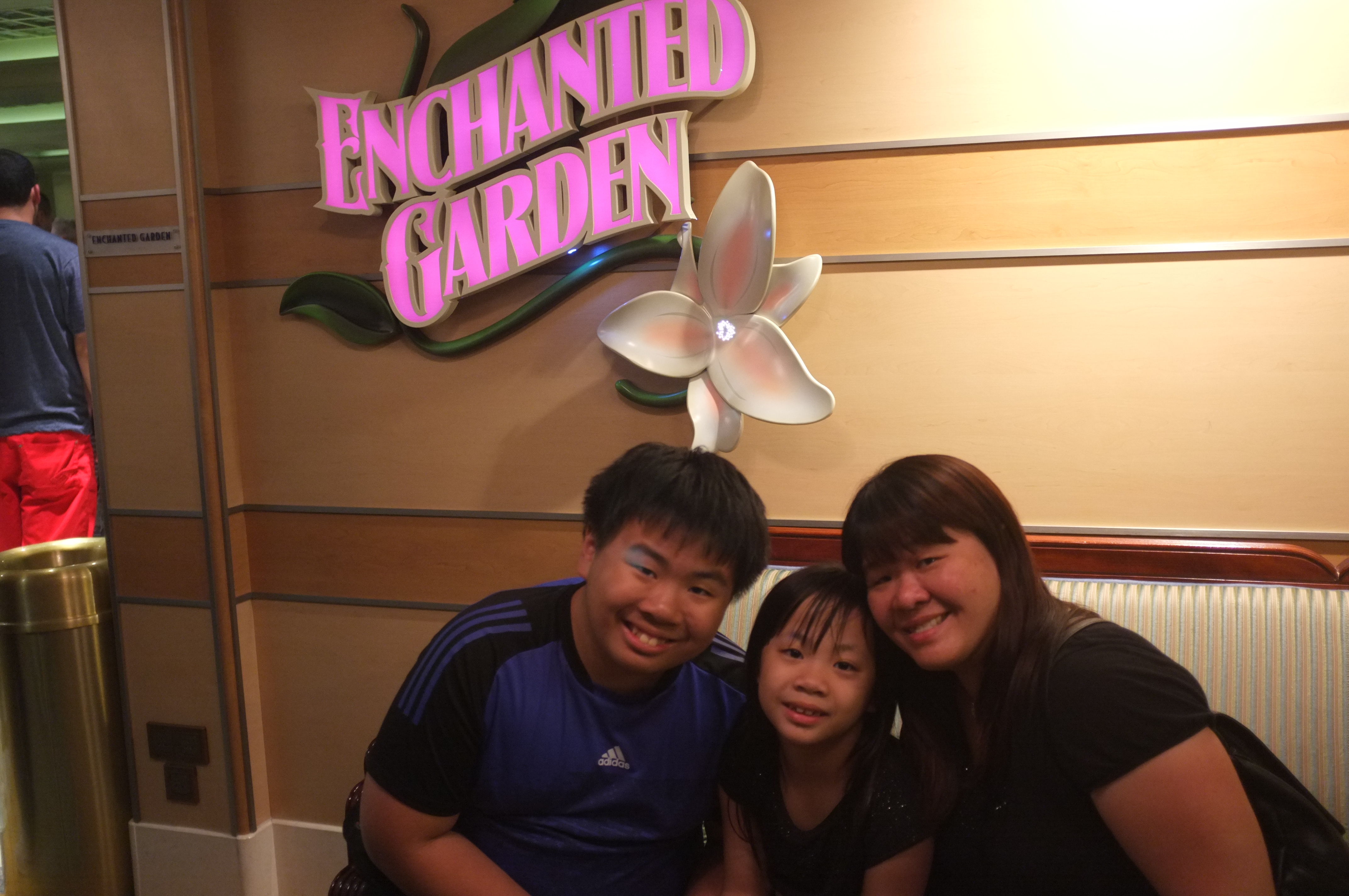 Afterwards, we headed back to our stateroom for a quick rest before our dinner reservation at Enchanted Garden. As we arrived at the door, we realised that the Fish Extender Gift exchange was already underway, with a gift at our door. This is an external event conducted by people on the cruise, so it goes to show the amount of dedication that the people on the cruise have, especially the organizers of the event. We decided to return the favour by going on our first stage of our gift exchange. We had prepared pens with customized name tags with the Disney font, and we dropped them off at the designated staterooms, before heading to dinner. At dinner, we realised that we had a shared table. At first, we lamented on the fact, as Ashley does not like dining with strangers, until we realised who they were. Coincidentally, we realised that they were the same Singaporeans from the “interviews” during The Golden Mickeys. The family had just started their vacation as well, and there were two girls, both around Ashley’s age, and she could not wait to socialize and make friends with them.
