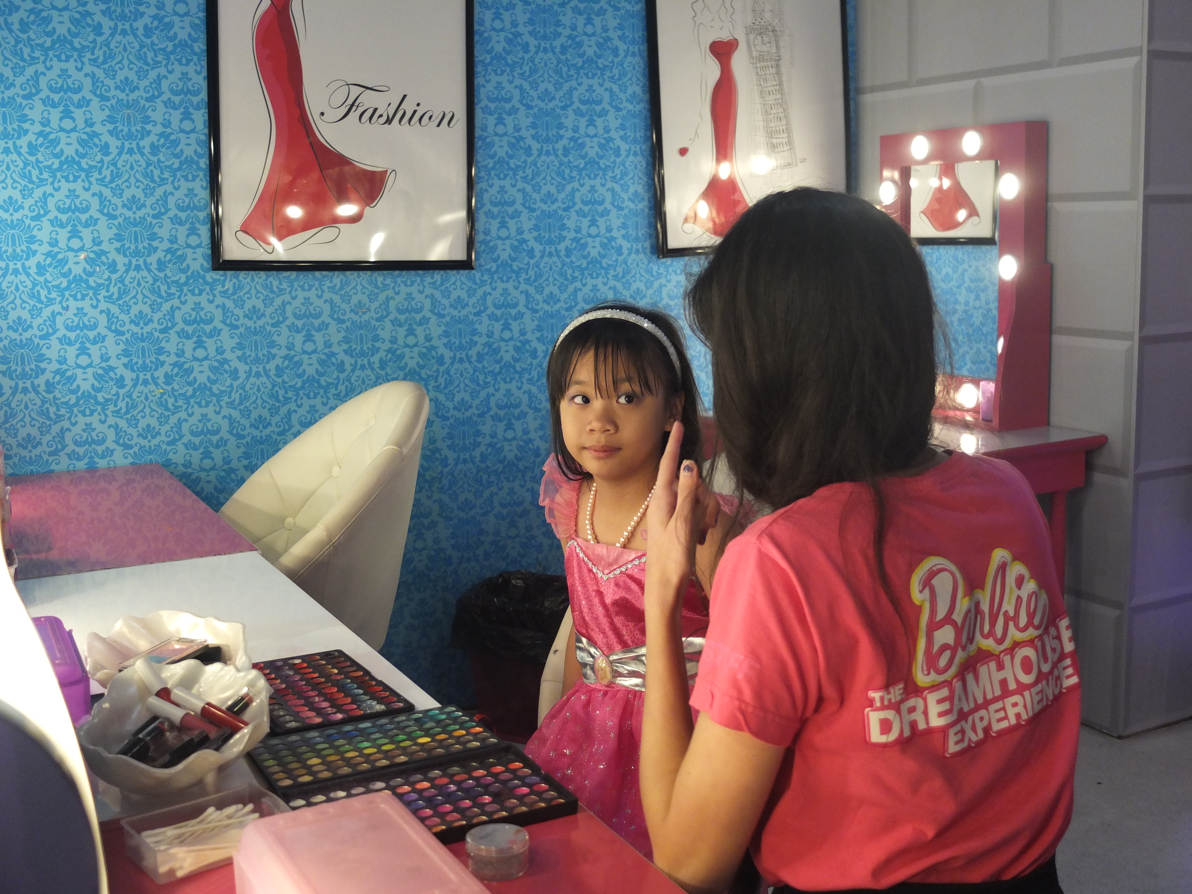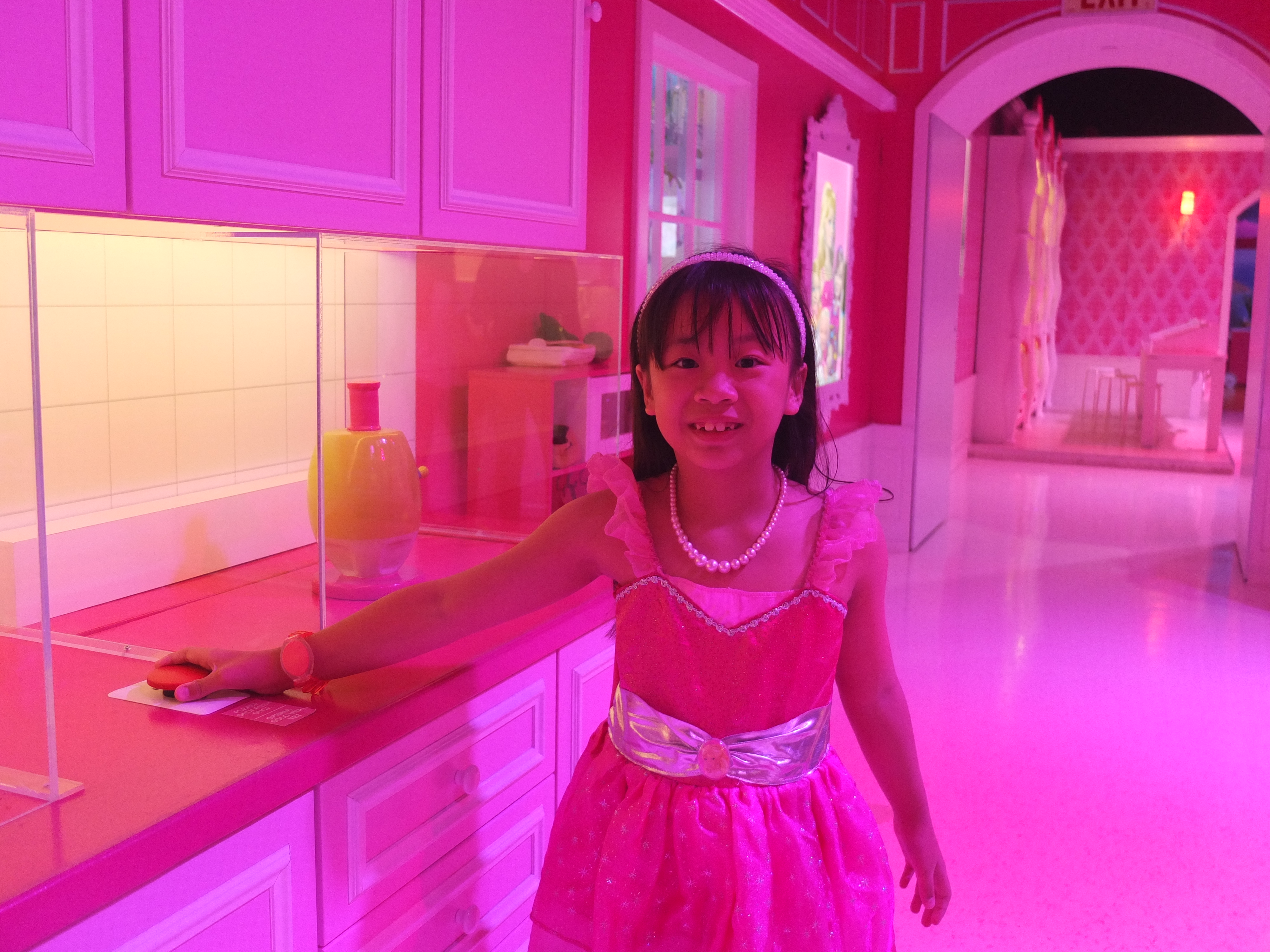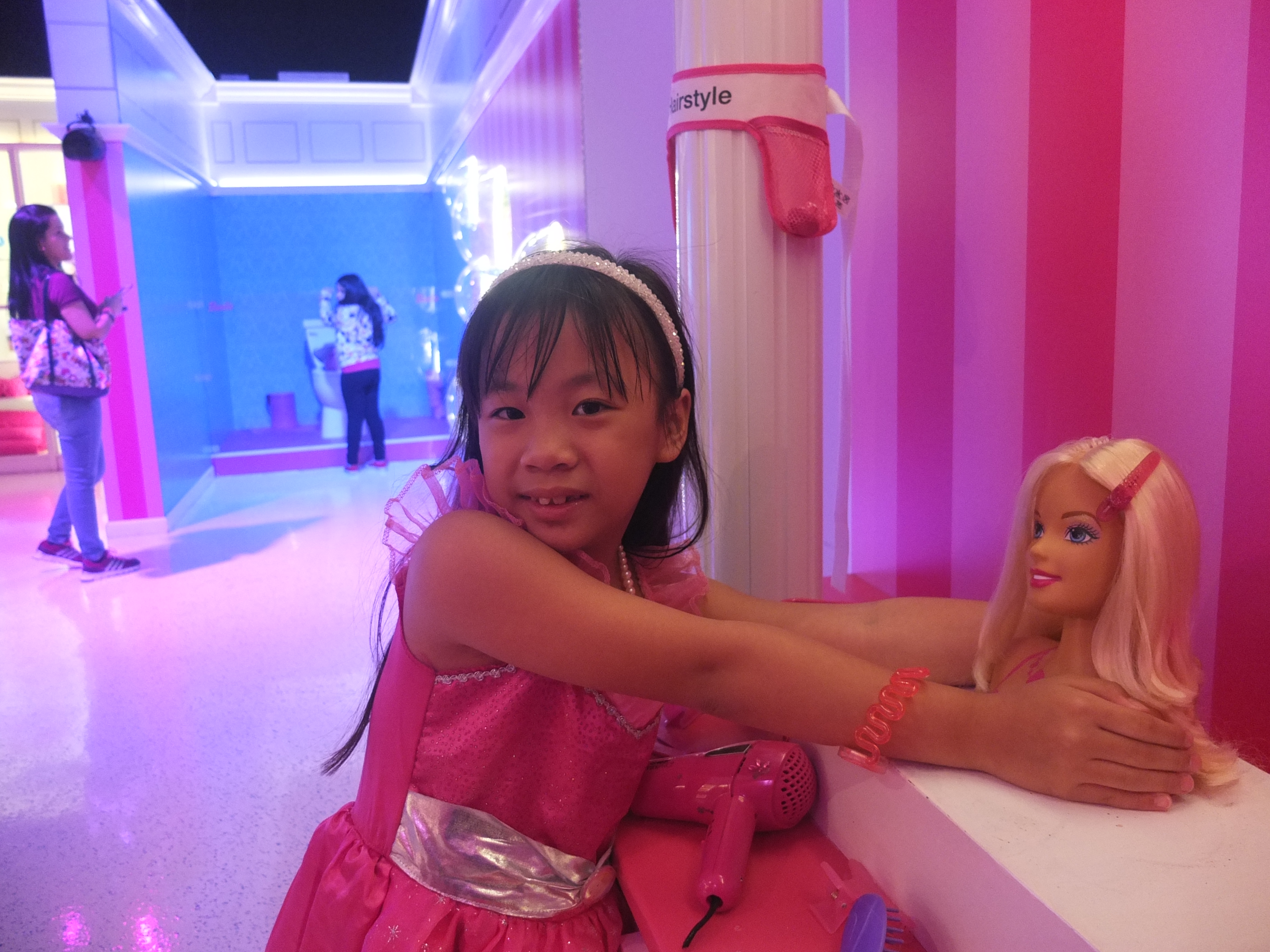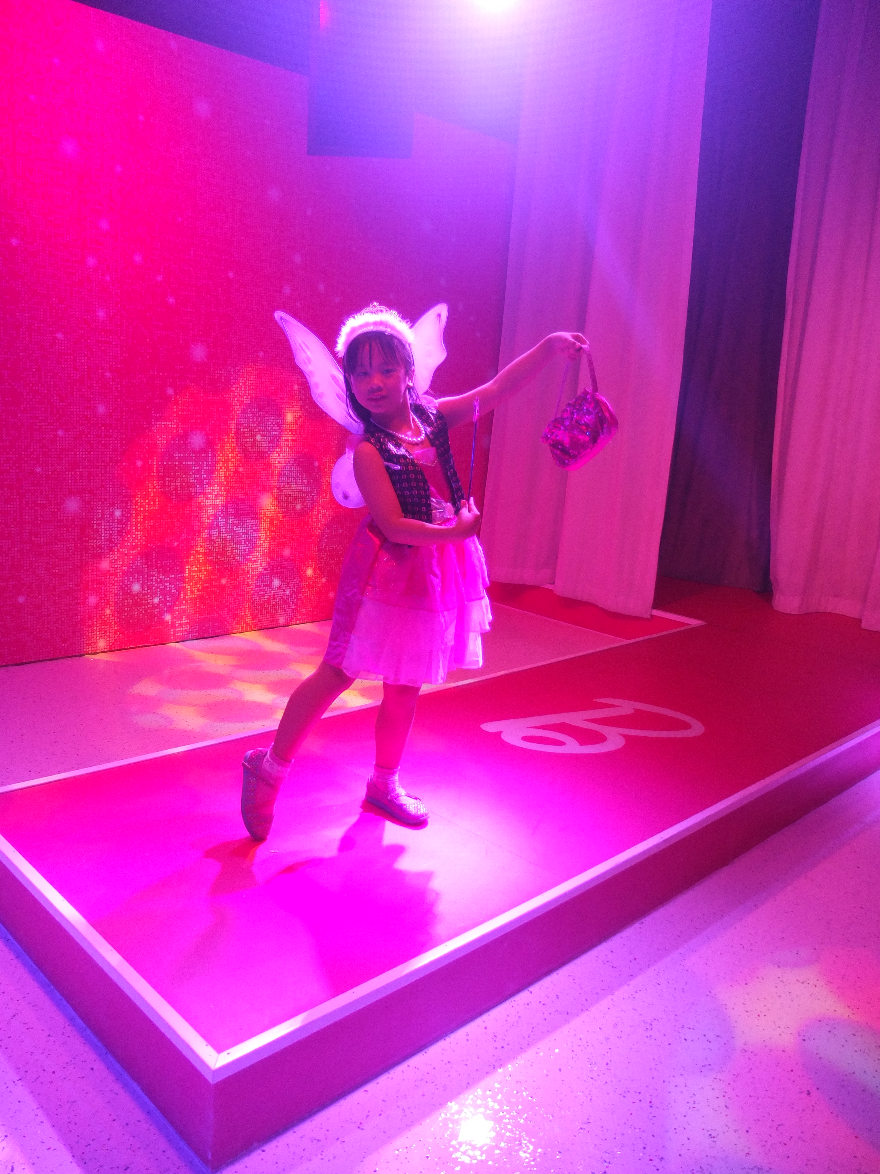 (SF: Barbie The Dreamhouse Experience is a 10,000 square foot pink paradise. It is a life-size replica’s of the iconic Barbie’s Dreamhouse toy. Upon checking Ashley in, she was given a pink bracelet that will personalise her tour and interactive experiences. She chose Barbie as her avartar as she would become ‘Barbie’ in this attraction. We meandered through the experience inspired by Barbie’s playhouse, which includes a living room, bedroom, closet, bathroom, kitchen, balcony and entertainment room. We were ‘transported’ to each floor of the house via a virtual elevator where surprises and interactive activities awaits in each room. Under the strong influence of pink, the furniture and decor pay homage to the girly hue, with a bright-pink baby grand piano among the furniture. The Dreamhouse also houses the best of Barbie – 350 dolls and collector memorabilia, Barbie’s friends, family and of course her love interest Ken. The tour ended by taking a private jet to visit Barbie’s workplace. Ashley had a fun time running around Barbie’s house, posing for pictures, making cupcakes, trying on Barbie’s outfit albeit virtually in her closet and lying down on Barbie’s enormous pink bed. As I purchased a VIP experience for her, she was ushered to a life-sized Barbie’s vanity where she got her make-up done. After which, she was brought backstage to change into her choice of outfit. As she was already dressed as Barbie, she decided to only add wings. Once she was ready, the fashion show began. Ashley had the opportunity to strut down the Fashion Runway and took home a photograph. She thoroughly enjoyed this experience.)