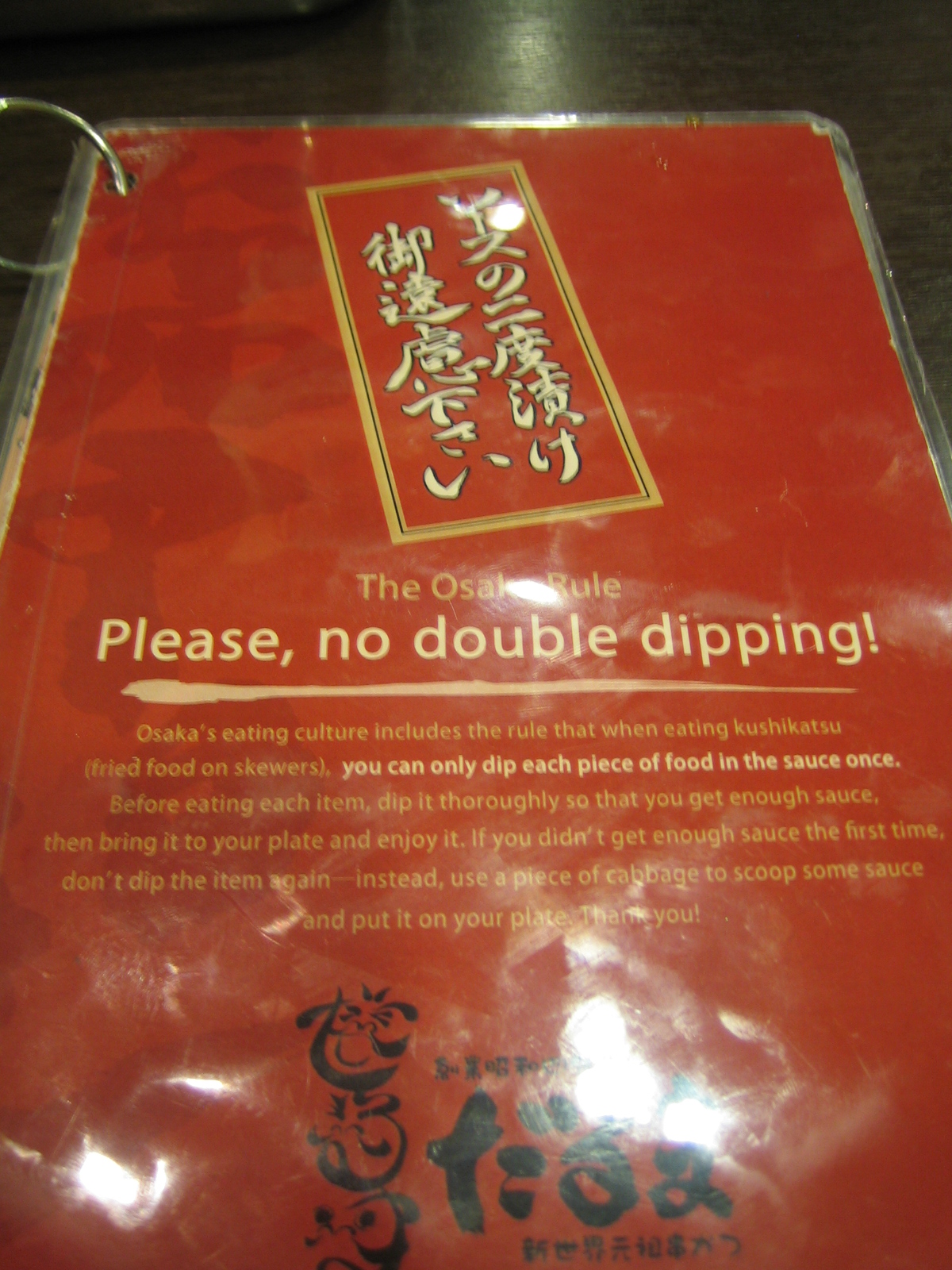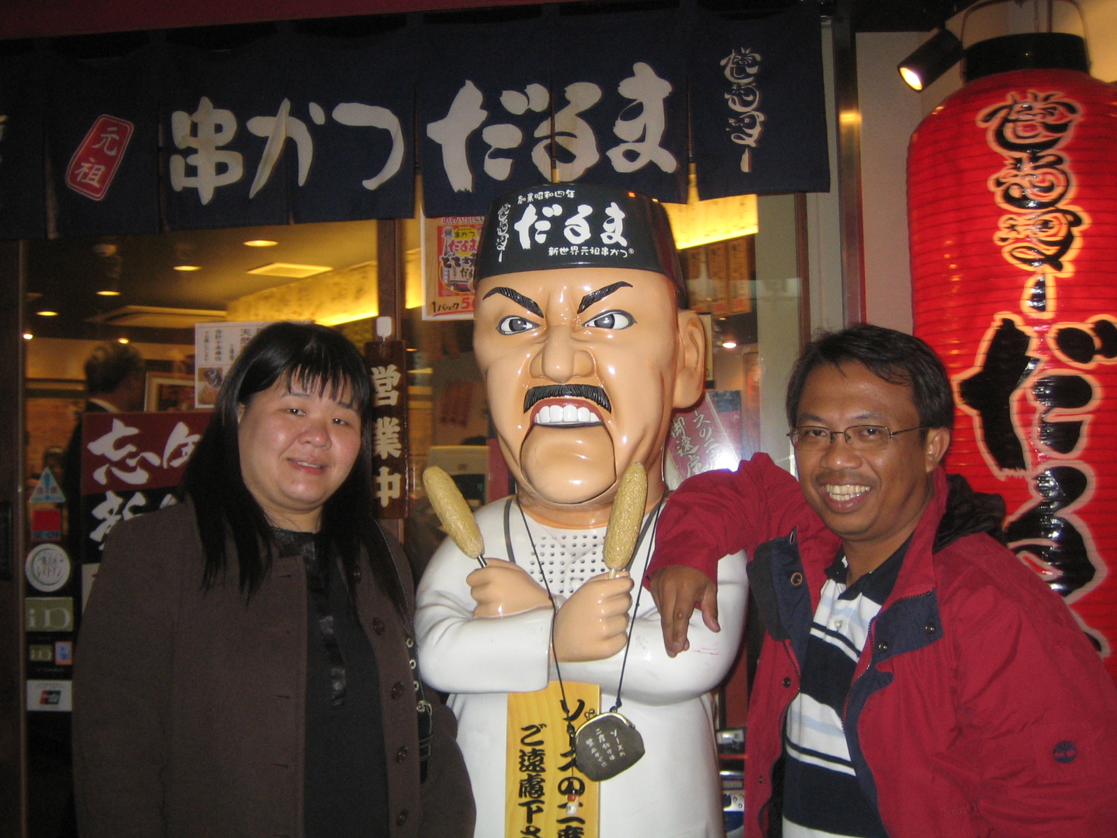 We returned to our favourite, Dotonbori for dinner. We decided to try Kushikatsu which are deep fried skewers of almost anything, served with a dipping sauce. This is a specialty in Osaka and although you can find plenty restaurants serving Kushikatsu, one of the best known is Kushikatsu Daruma. The restaurant mascot is Mr Ueyama, the company president. He is famous for striking this cross armed pose with the grimace on his face. It is very popular with a queue stretching outside into the street, which was the reason we tried this restaurant. The wait was short and once we stepped in, the air was thick with the smell of fried food and the sweet sauce.